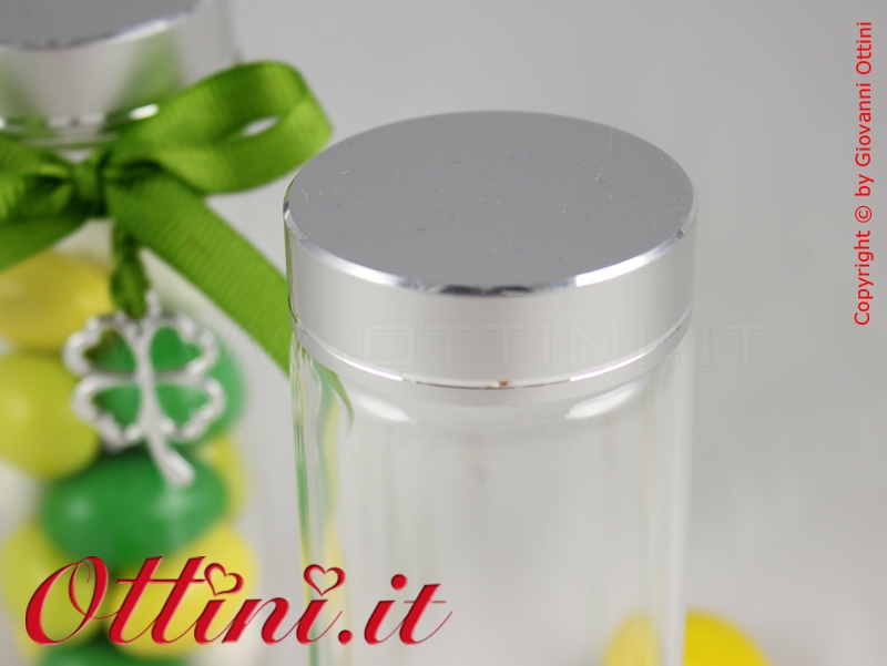 Questo è uno dei barattoli migliori del nostro assortimento, di qualità eccezionale e dal design raffinato, moderno ed elegante. Il tappo, in alluminio anodizzato finemente rifinito, è a vite e garantisce un’ottima tenuta anche per i liquidi, ma eccezionale anche per conservare fragranze e profumi di qualsiasi cosa che vorrete inserire. Gli articoli in vetro sono molto richiesti perché possono essere riutilizzati da chi li riceve per infiniti usi. Ogni vasetto è completo del suo tappo su cui si possono applicare nastri e decori di ogni tipo (con la colla a caldo otterrete risultati rapidi che premieranno la vostra creatività).