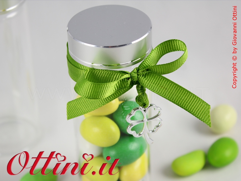 Questo prodotto, ha un’altezza di 12,2 cm (con tappo montato) e un diametro di cm. 4,7 (misure esterne). Il foro di entrata ha un diametro di cm 3,4. Il diametro superiore del tappo è di 4,5 cm. E’ un prodotto molto elegante e contemporaneo, facile da personalizzare con nastrini e confetti colorati. Al suo interno trovano posto tranquillamente fino a 34/35 confetti al cioccolato o alla mandorla tradizionali (anche se non vanno riempiti fino all’orlo ma al massimo per 3/4). Le Tenerezze (i cioccolato e mandorla insieme), sono un po’ più grosse e ce ne stanno fino a 19. Nelle nostre foto, li vedete con 13 confetti Tenerezze (tipo Sfumè Verde).