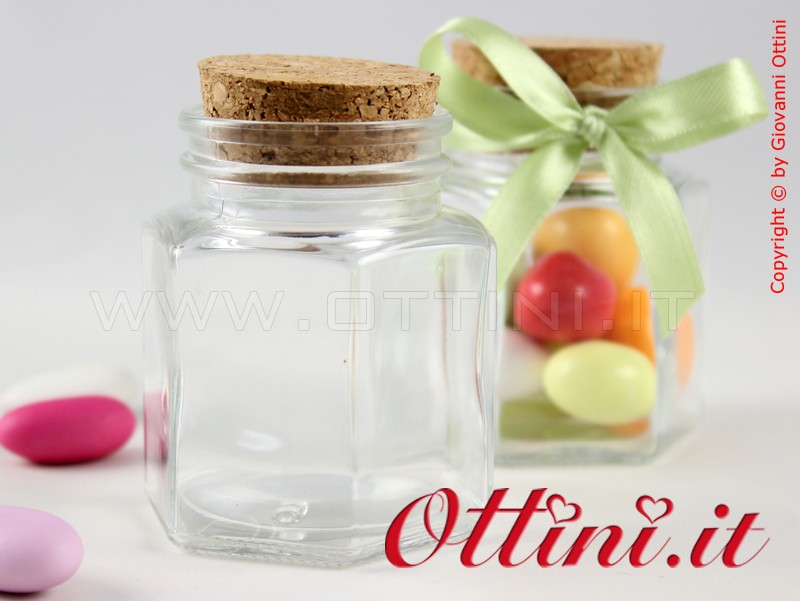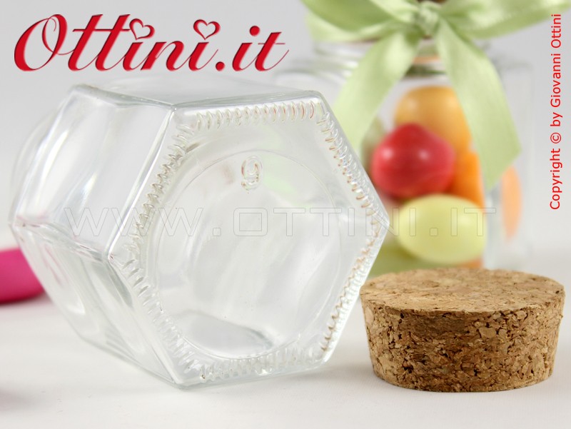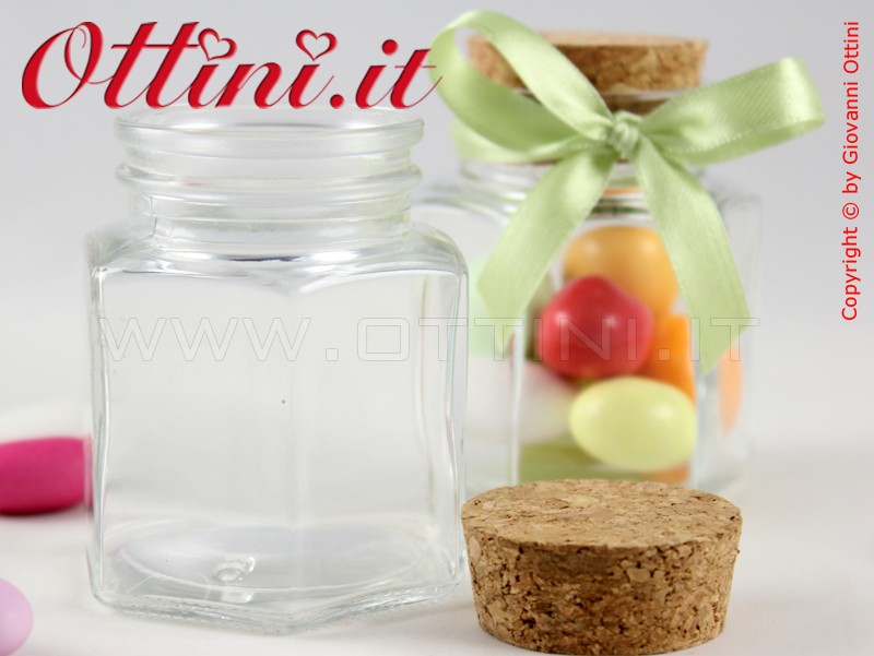 Barattolo per alimenti GARANTITO HACCP e procedura Moca. Vendita ulteriormente scontata del bellissimo barattolo in vetro a forma di esagono con tappo in sughero, soggetta a quantitativo minimo di 12 pezzi e a multipli di 12 pezzi.