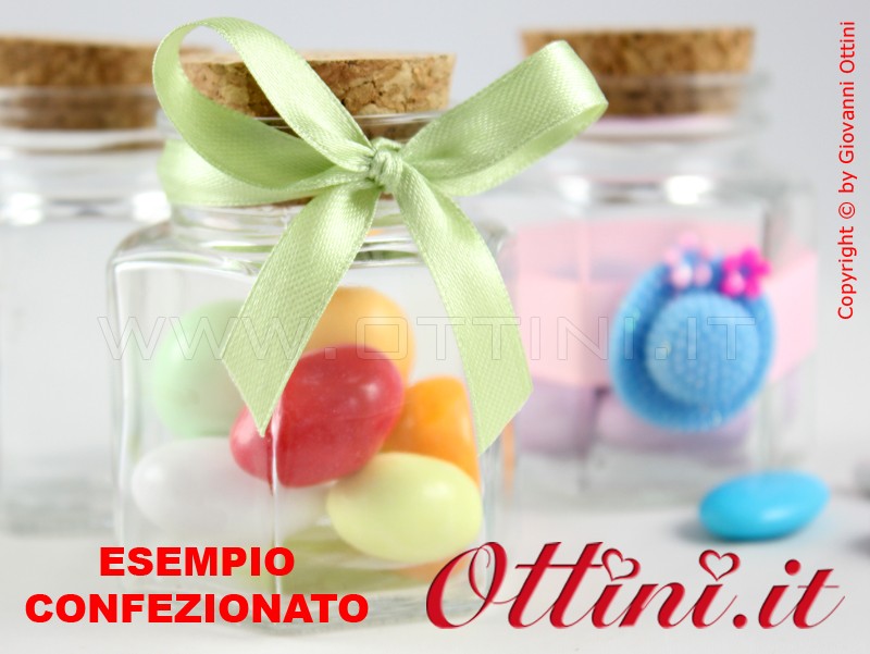 Simpatico vasetto a forma esagonale con tappo in sughero. E’ un regalo utile in quanto può essere riutilizzato come contenitore per spezie o altri usi.