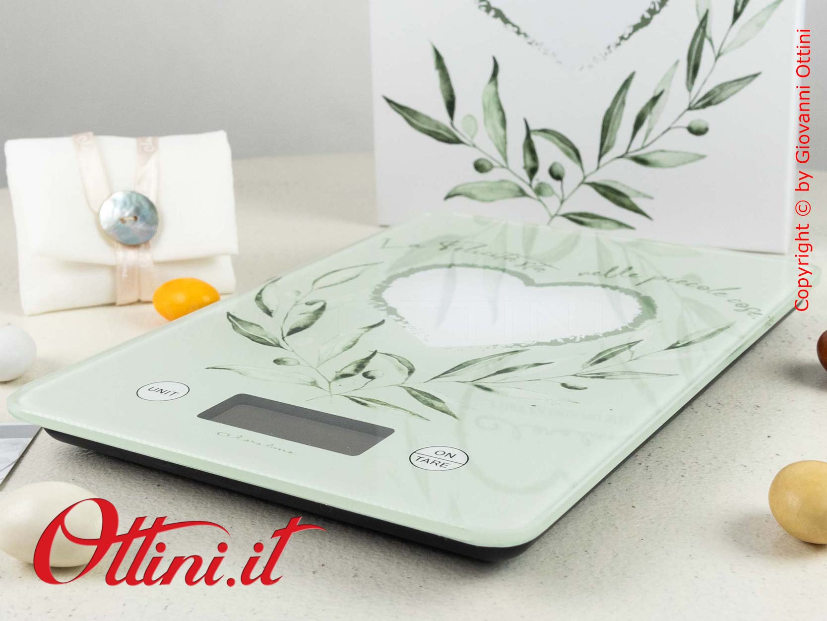 La bilancia digitale per alimenti con stampa di foglie di ulivo di Claraluna è senza dubbio un oggetto utilissimo in cucina. Le bomboniere utili sono le più ricercate e quelle destinate alla cucina sono le più apprezzate proprio perchè verranno valorizzate dall’uso quotidiano. La bilancia ha tutte le funzioni necessarie, dalla tara alle unità di misura (gr, ml, ecc.) e ha una base di appoggio di cm 15×22 ed uno spessore di soli 2,5 millimetri.