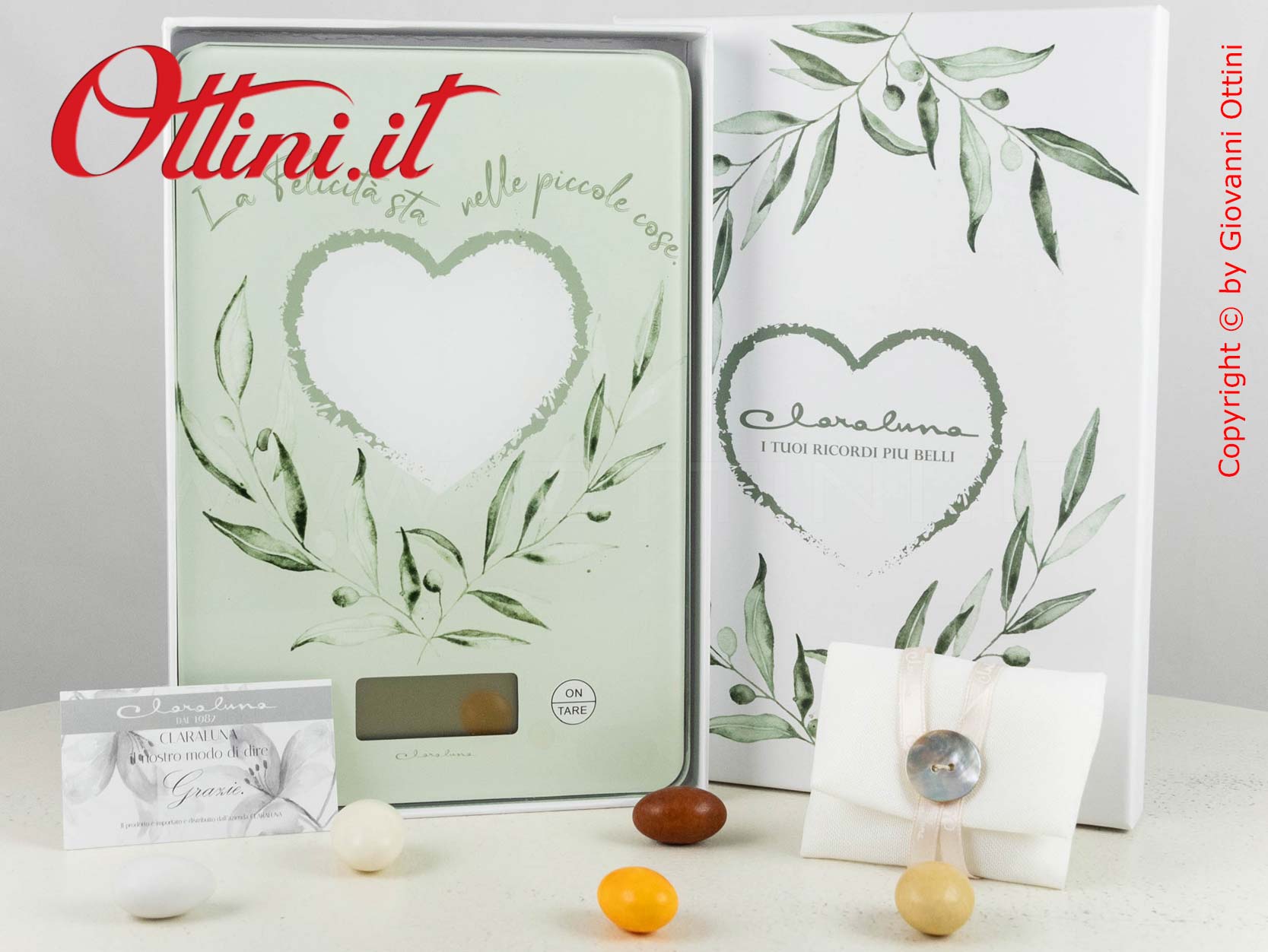 Con un ordinativo minimo di 50 pz della Bilancia digitale Foglie Ulivo (o di bomboniere miste Claraluna abbinate alla promozione), potrete accedere alla campagna promozionale che vi permette di avere le PARTECIPAZIONI di Claraluna IN OMAGGIO, comprensive di servizio stampa!!! Potrete scegliere tra ben 6 modelli bellissimi! Per le condizioni e le modalità FATE CLICK QUI.
