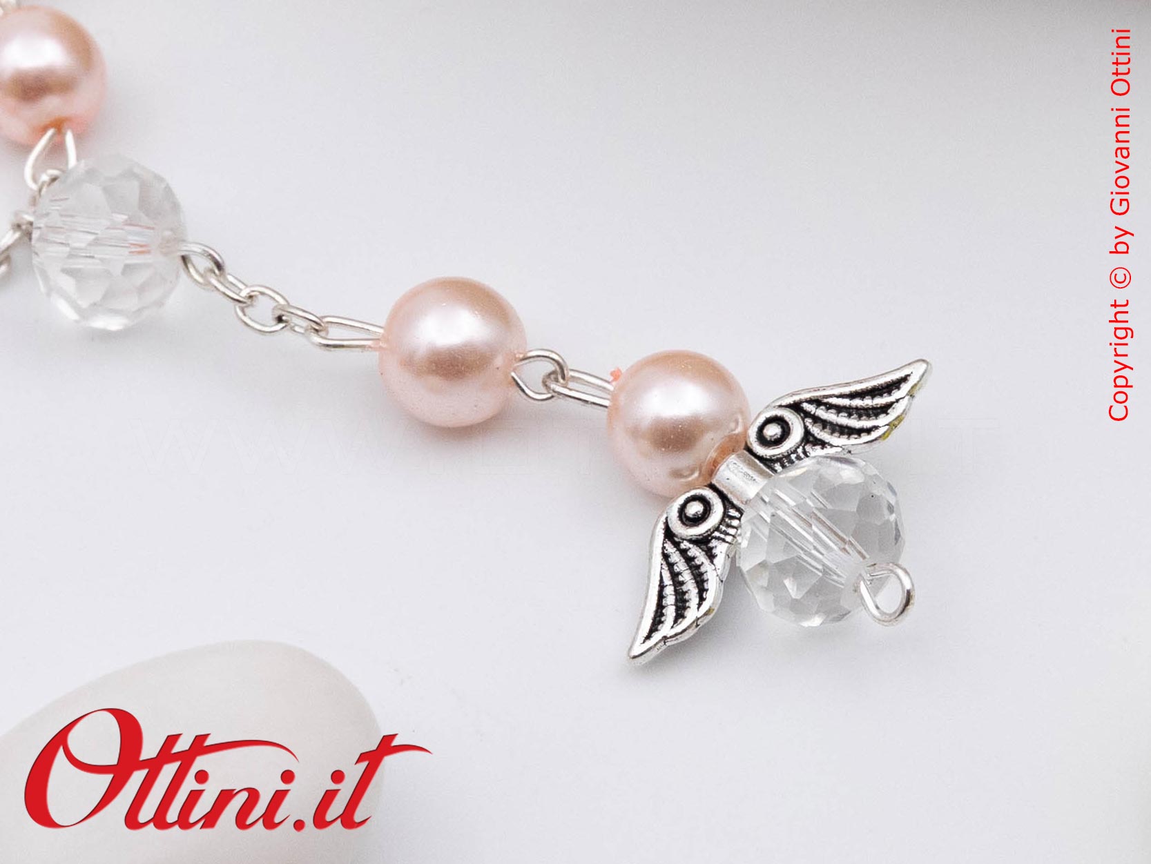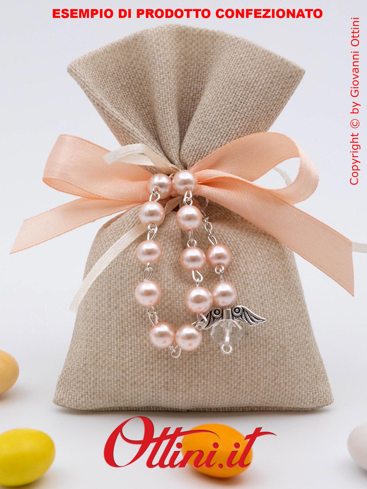 Un tempo si chiamava “decina” ed era una sorta di piccolo rosario che si dava ai bambini per pregare. Oggi è un bellissimo bracciale che replica un piccolo rosario con le perle di colore Rosa perlato.  È un decoro raffinato ed elegante adatto al confezionamento di sacchettini per una comunione o una cresima. Finiture curate e di ottima qualità per un prodotto unico nel suo genere.