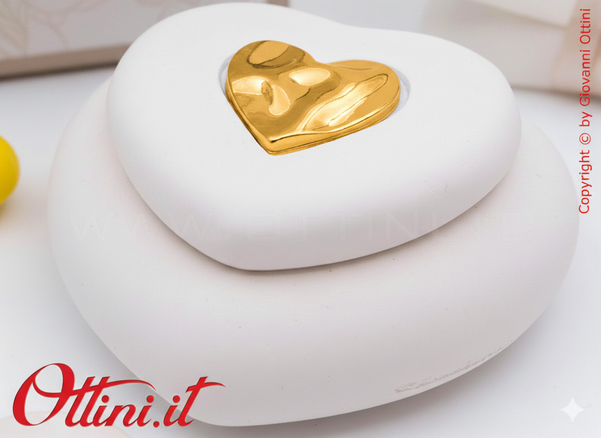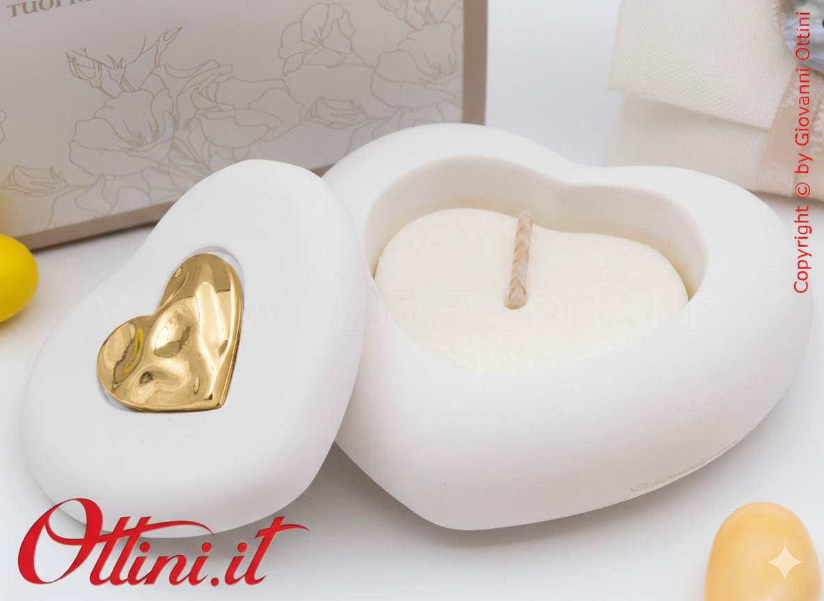 Claraluna ci presenta questa elegante Candela a forma di cuore con un decoro, sempre a forma di cuore, nel colore oro. È un oggetto semplice, realizzata in gesso, una volta esaurita la candela, può essere sostituita con i classici moccoli o utilizzata anche come svuota tasche o porta caramelle… ovunque la metterete sarà un prestigioso complemento d’arredo o un posto speciale dove riporre con cura i vostri piccoli oggetti.