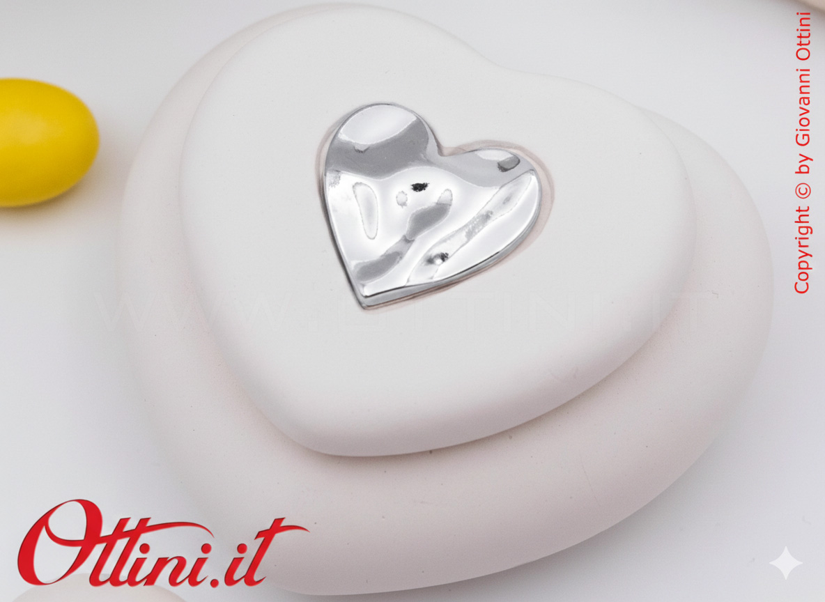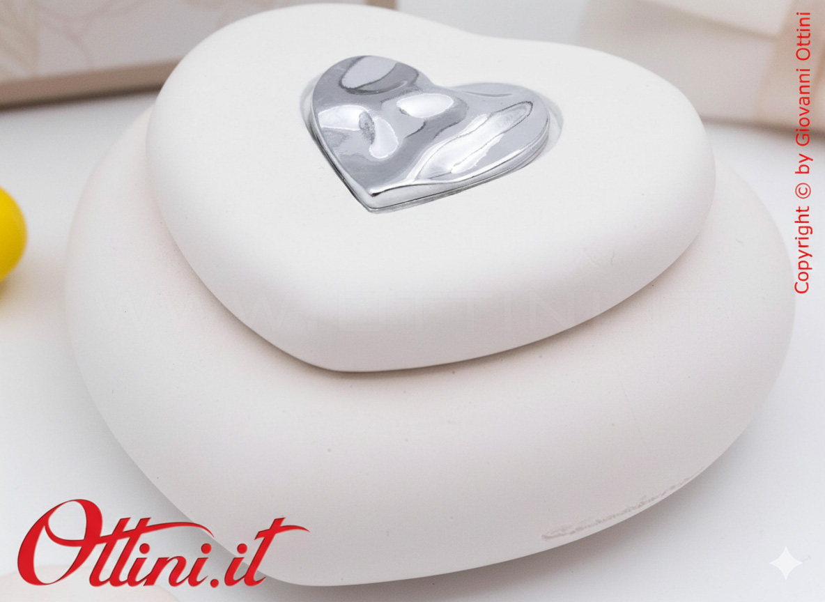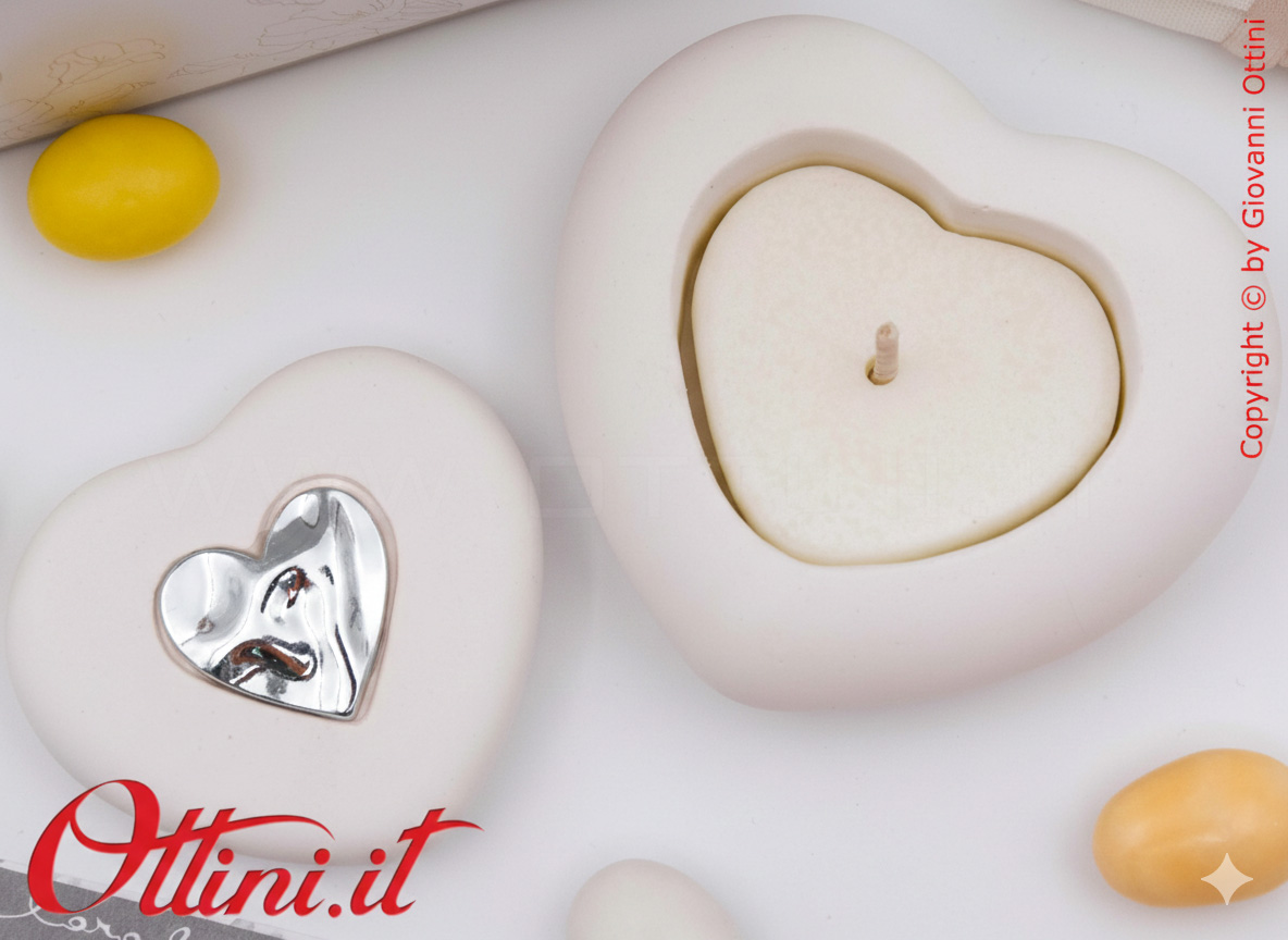 Claraluna ci presenta questa elegante Candela a forma di cuore con un decoro, sempre a forma di cuore, nel colore silver. È un oggetto semplice, realizzata in gesso, una volta esaurita la candela, può essere sostituita con i classici moccoli o utilizzata anche come svuota tasche o porta caramelle… ovunque la metterete sarà un prestigioso complemento d’arredo o un posto speciale dove riporre con cura i vostri piccoli oggetti.