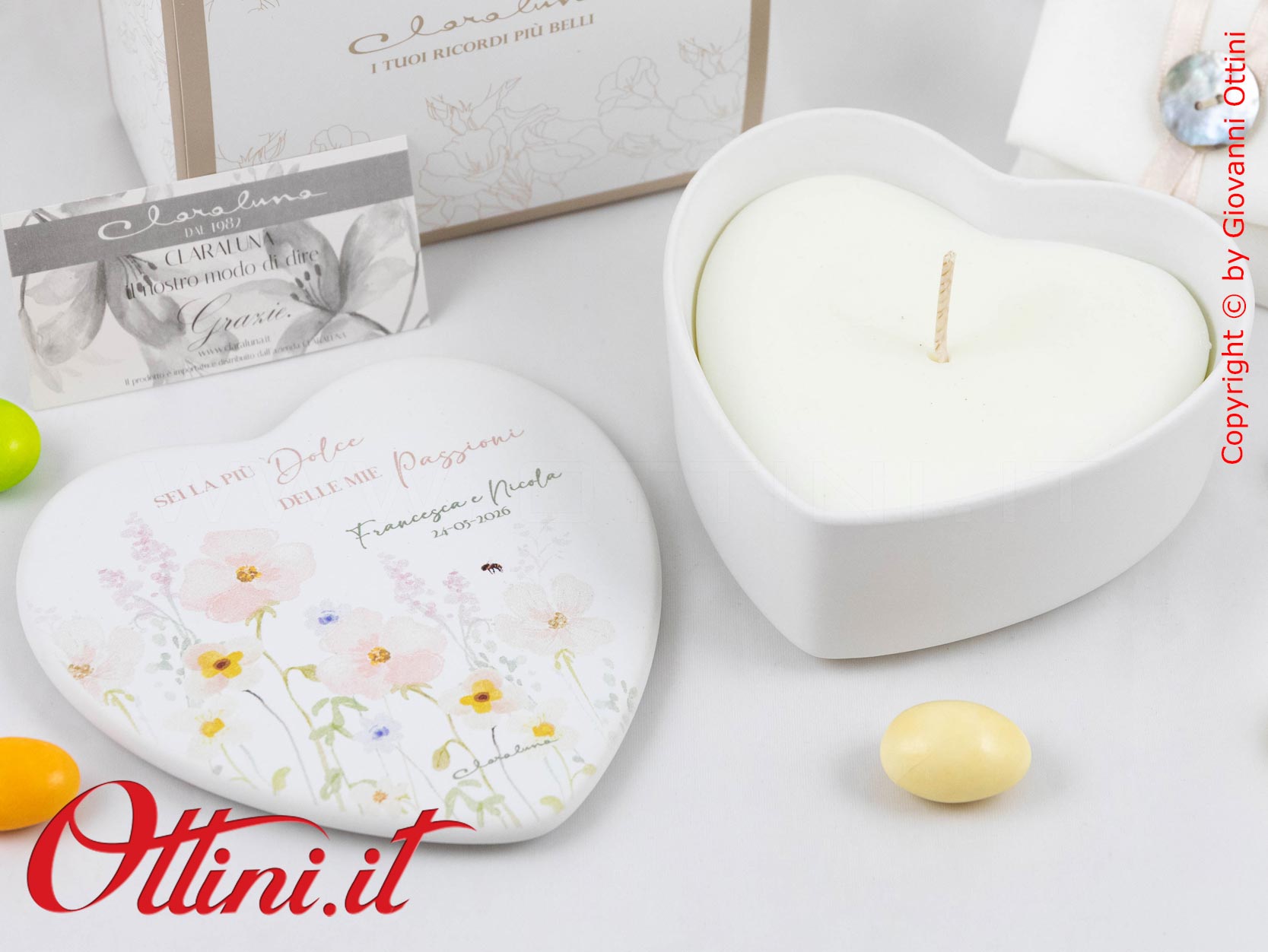 Con un ordinativo minimo di 50 pz della Candela Cuore con Decoro Floreale Rosa (o di bomboniere miste Claraluna abbinate alla promozione), potrete accedere alla campagna promozionale che vi permette di avere le PARTECIPAZIONI di Claraluna IN OMAGGIO, comprensive di servizio stampa!!! Potrete scegliere tra ben 6 modelli bellissimi! Per le condizioni e le modalità FATE CLICK QUI.