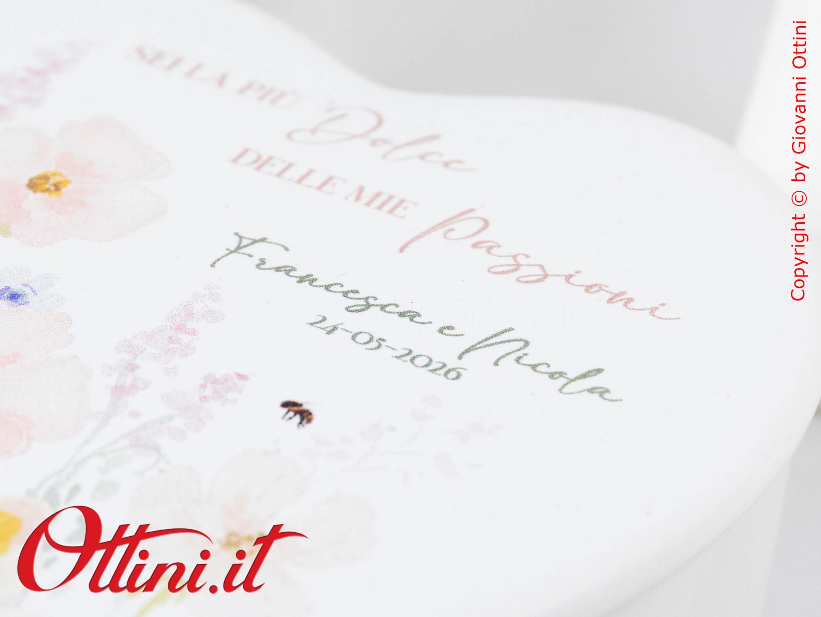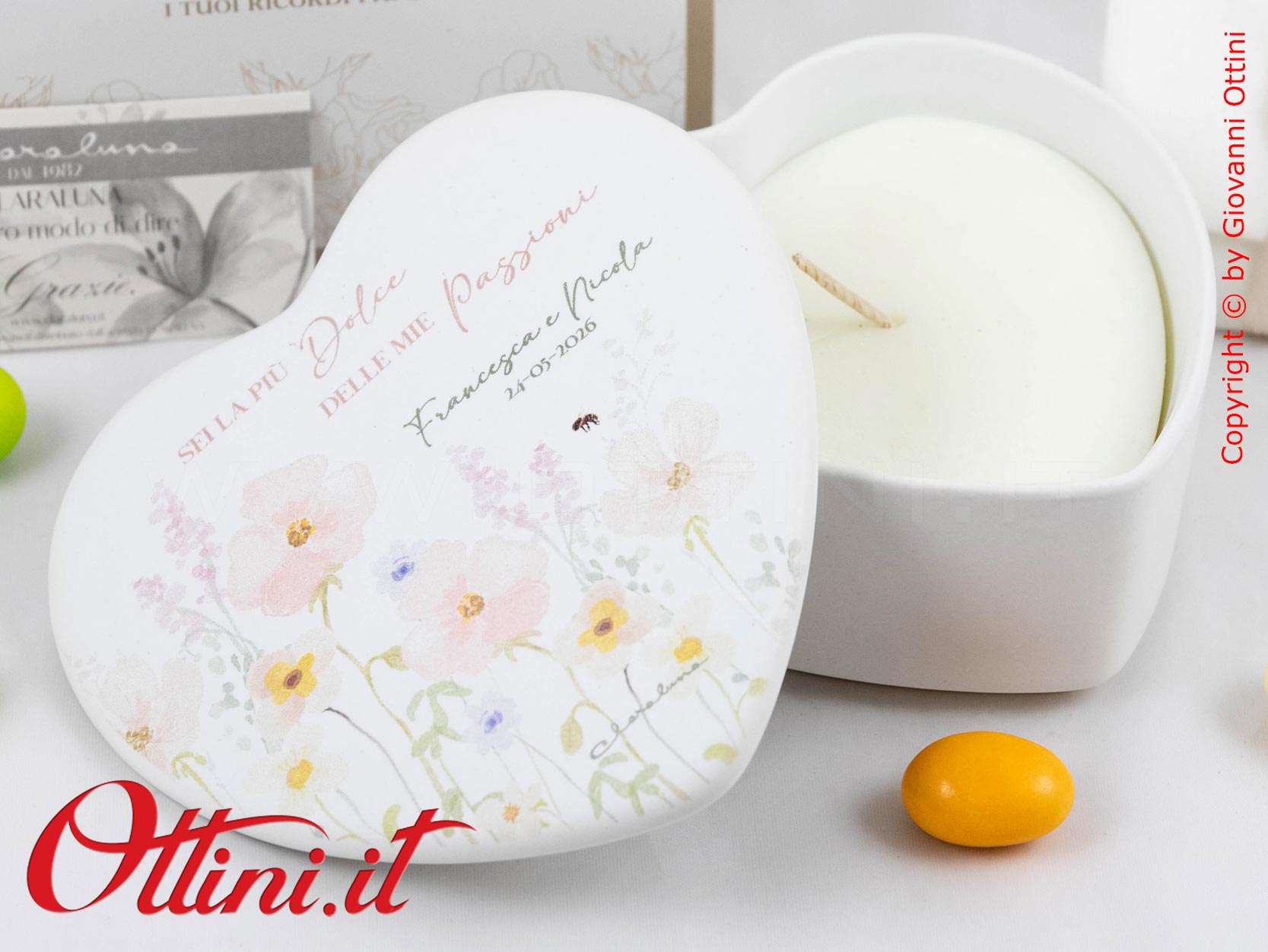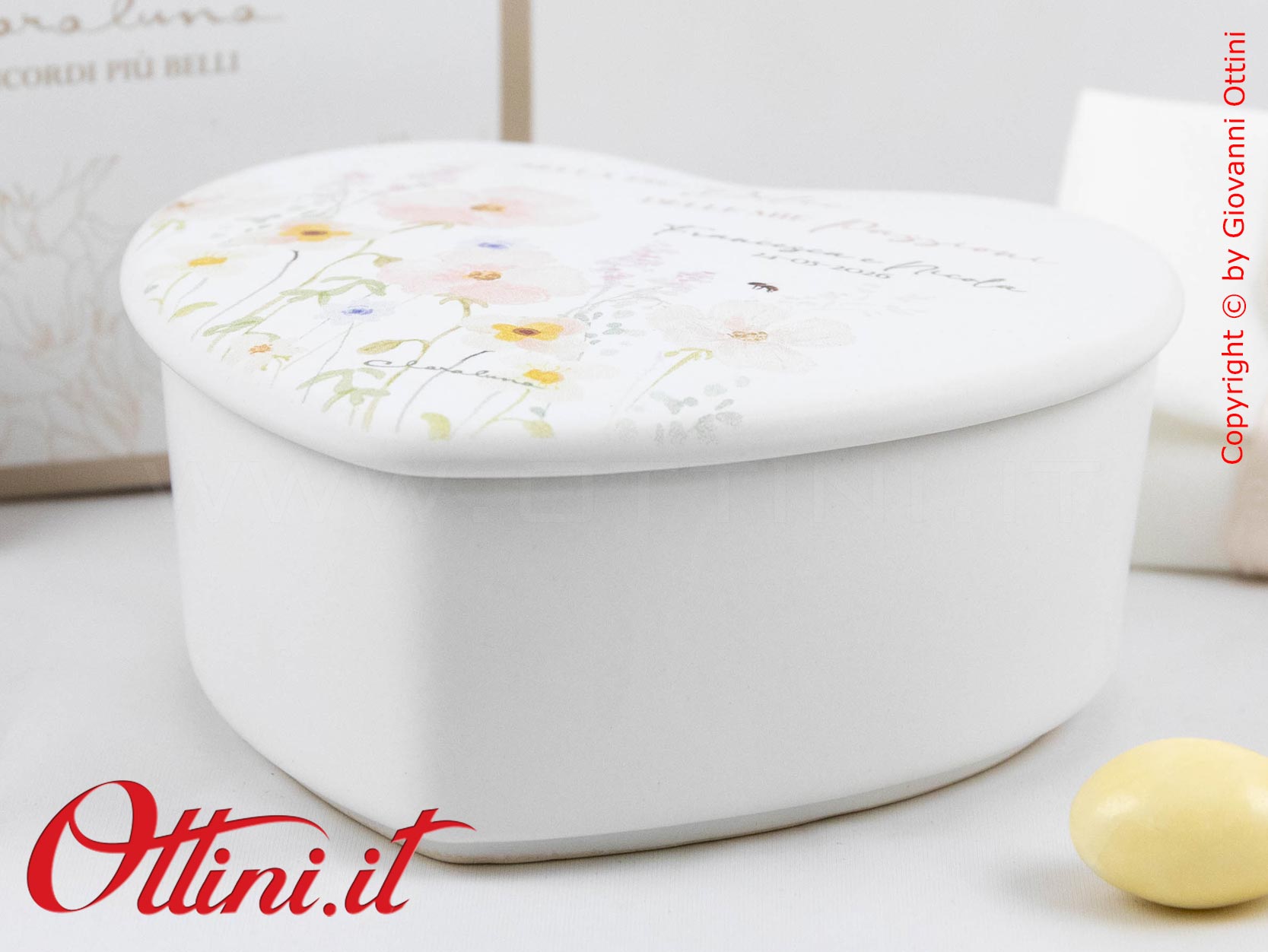 – un bigliettino bomboniera con stampa di nomi e data (per acquisti di almeno 10 bomboniere). Per i testi da stampare vi chiameremo noi una volta ricevuto l’ordine, in modo da potervi consigliare.