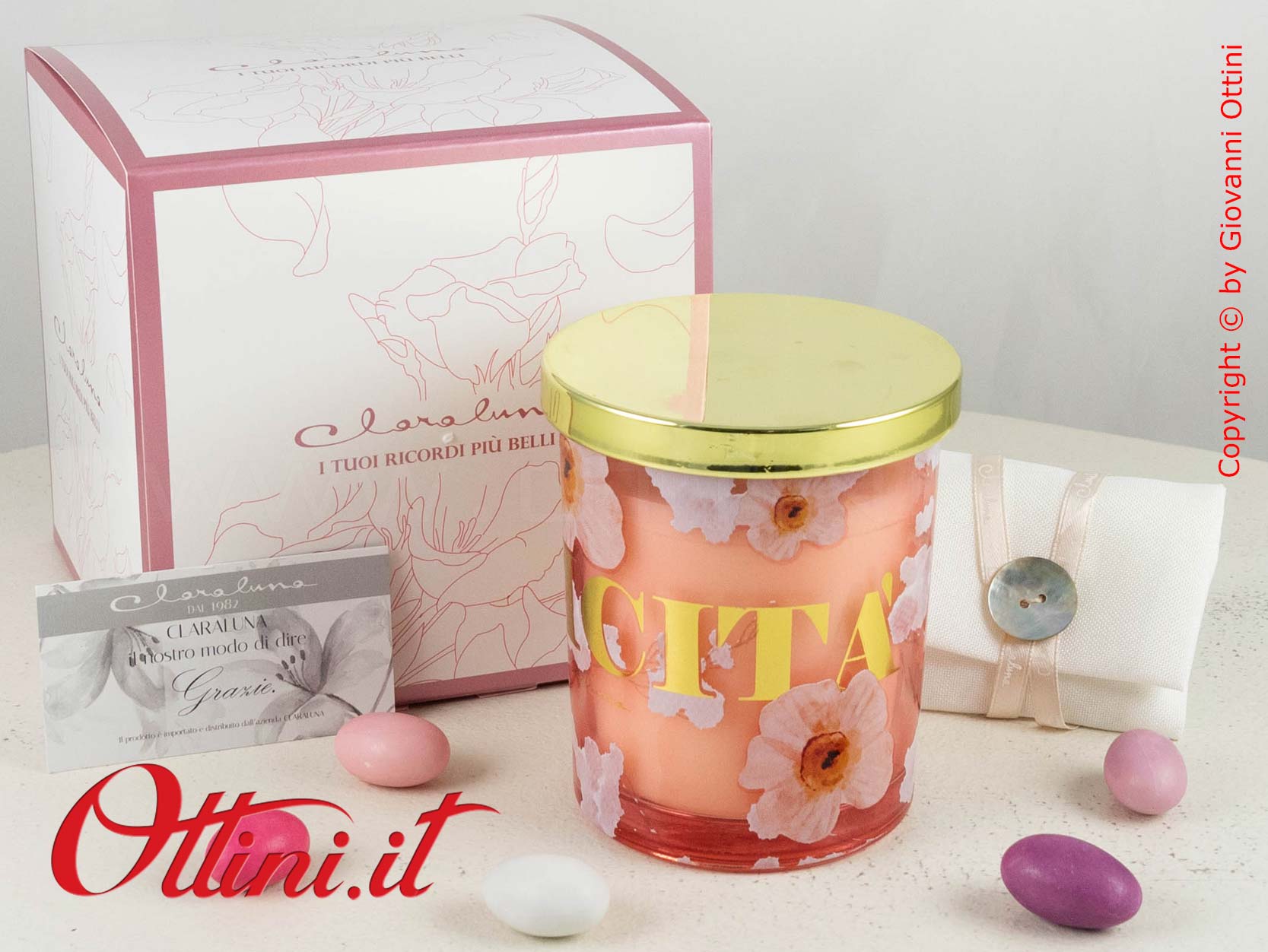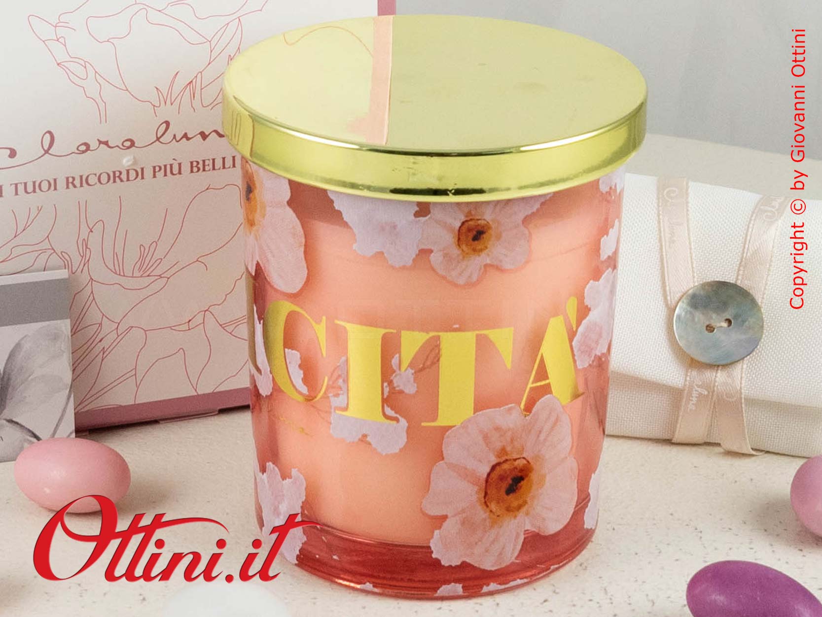 Il calore di una fiamma, il bagliore vibrante della sua luce, l’aroma di un profumo che si diffonde nella stanza… emozione, serenità, famiglia. Regalare una candela è l’augurio di poter godere di momenti intimi e di pace con le persone che ci amano. Claraluna ha realizzato una serie di candele spettacolari e vi propone la Candela Felicità con decori Rosa e con profumo di Vaniglia. Il vaso è elegante, in vetro molto spesso, con grafica floreale e la scritta Felicità, completo di coperchio in metallo con finitura dorata.