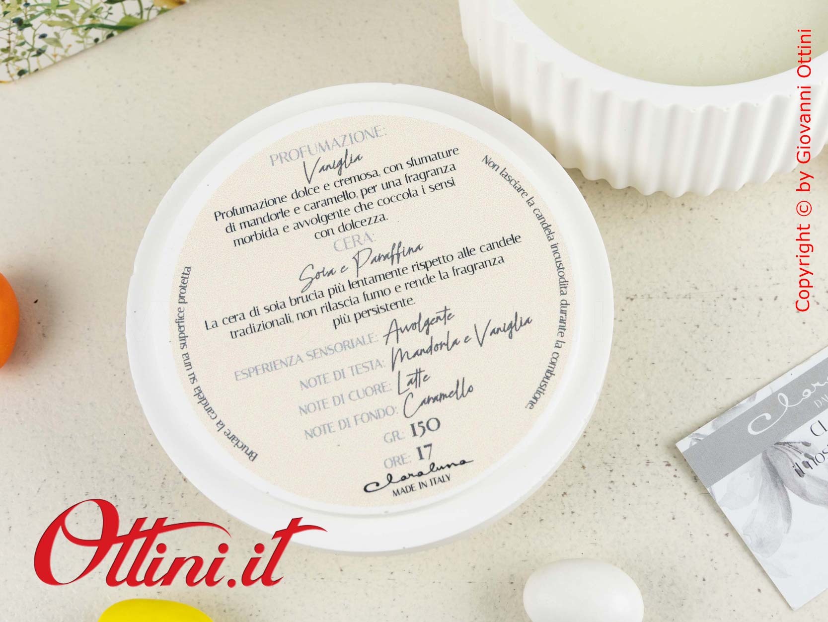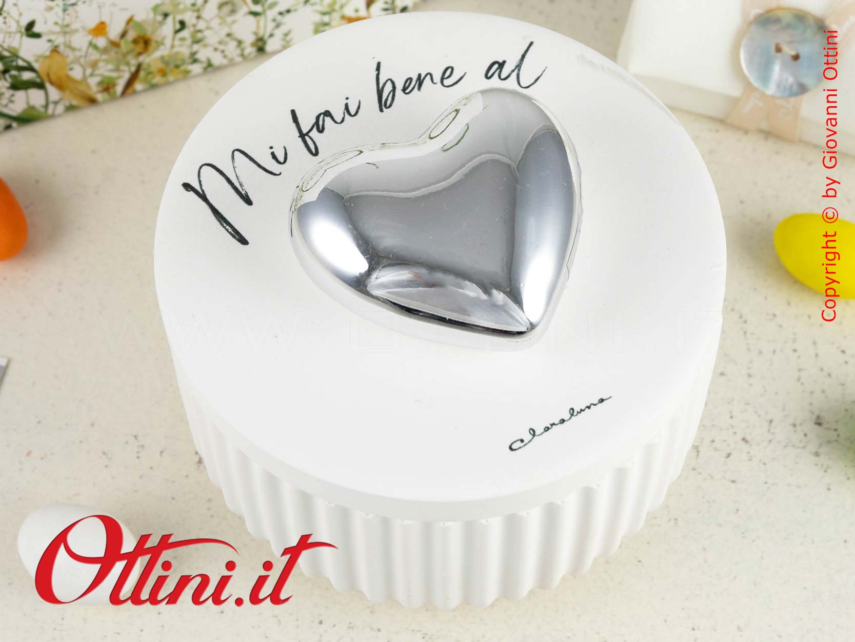 L’eleganza e l’armonia di una casa comprendono anche l’atmosfera, il calore che ti trasmettono le persone e le cose che ci circondano. Claraluna ci propone questa bellissima candela grande completa di coperchio con cuore color silver argentato metallizzato lucido. Il contenitore è completamente realizzato in gesso con un design plissè che conferisce un aspetto vintage estremamente piacevole e adatta a qualsiasi tipo di arredo. Le misure di questo oggetto sono di cm 10 di diametro x 8,5 di altezza totale. La profumazione è alla vaniglia con sfumature di mandorle e caramello, con 150 gr di cera di soia e paraffina che garantiscono 17 ore di combustione.