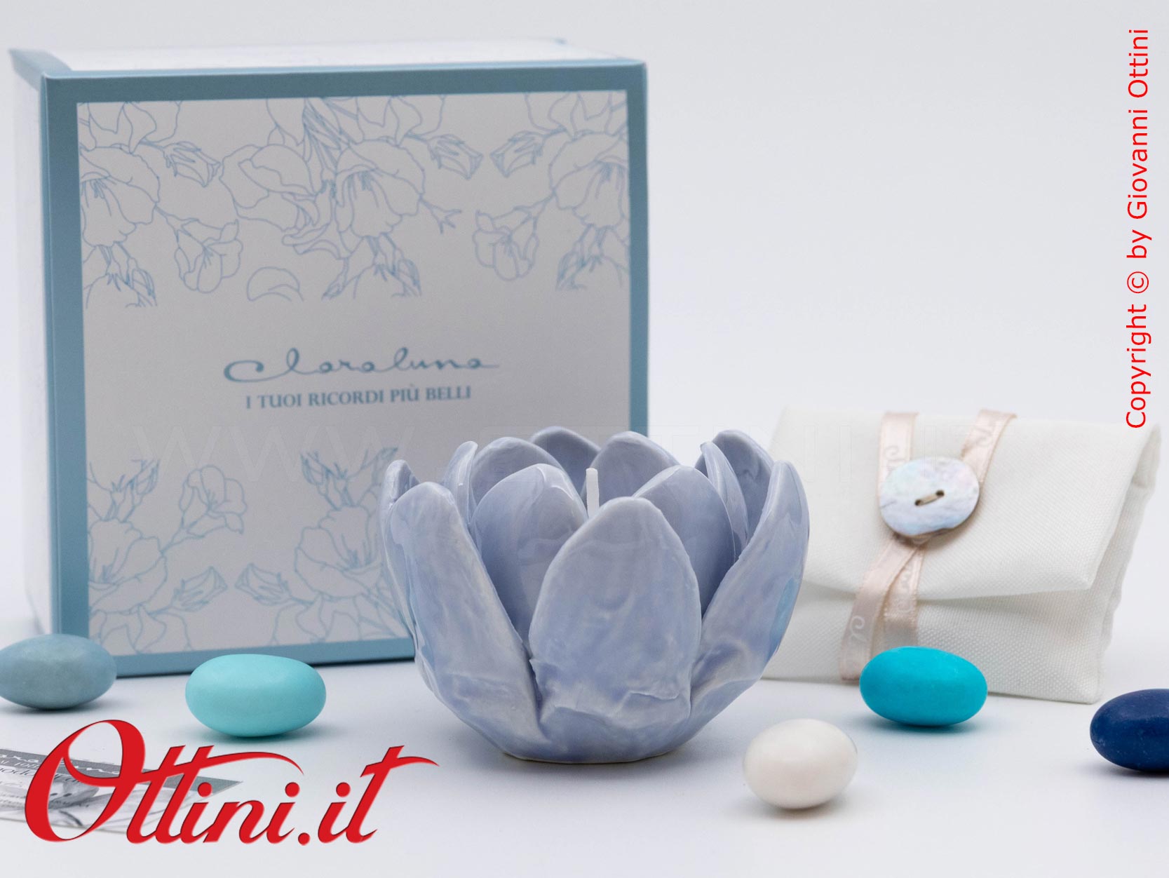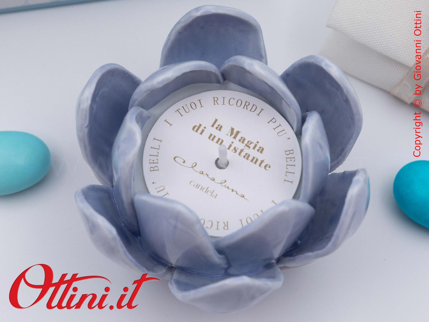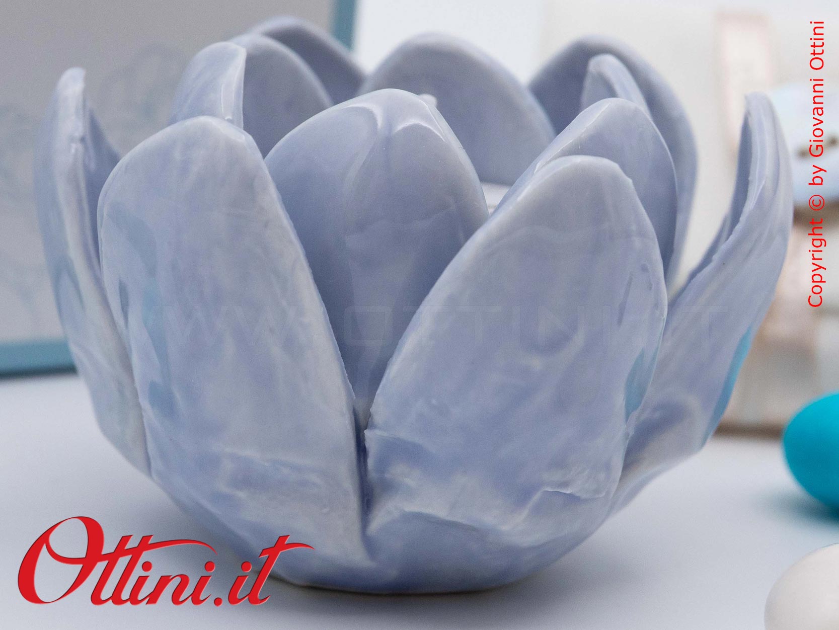 Candela Ninfea azzurra realizzata in finissima porcellana smaltata. Il design è esclusivo con forme retrò e colori delicati per tutta la linea. Sono disponibili in diversi colori che trovate sul nostro sito.