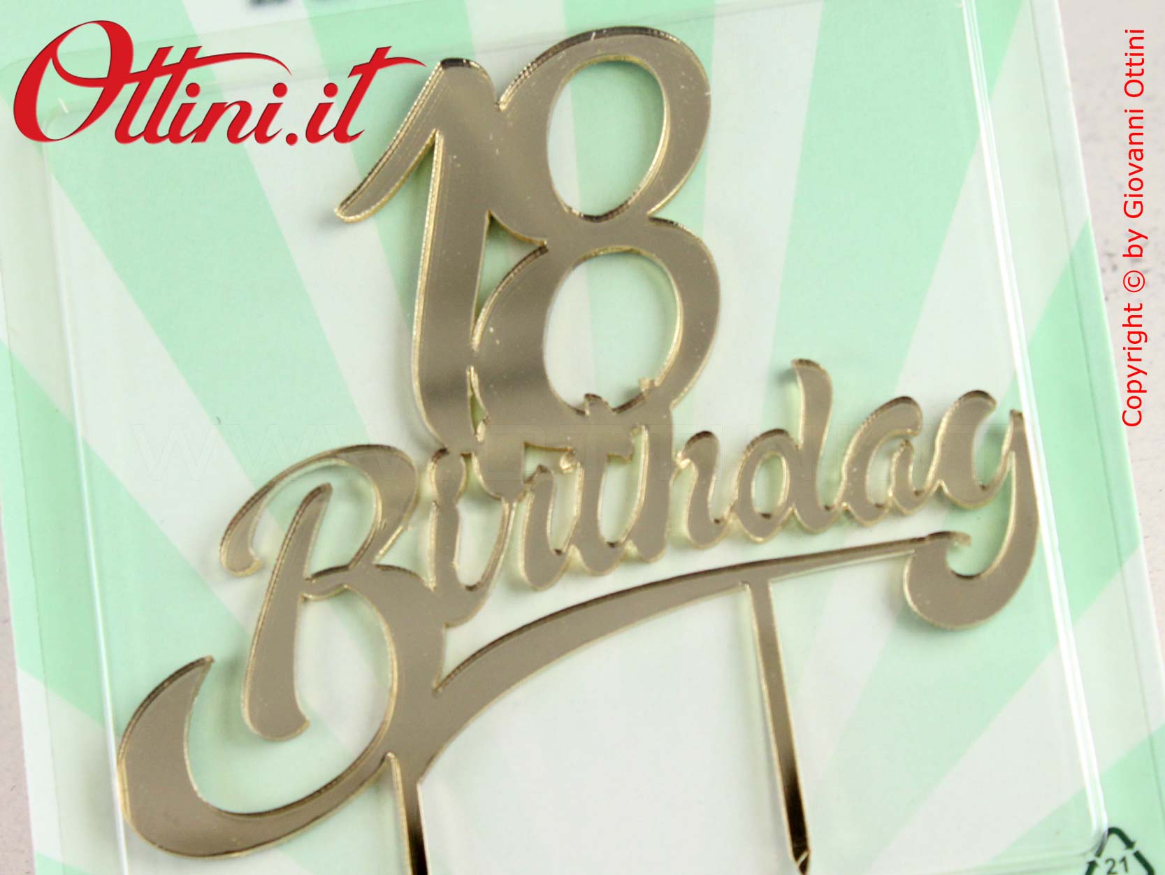 Centro Torta Compleanno in Plexyglass scritta “18 Birthday” di colore Oro. E’ un prodotto decorativo per torte creato appositamente, ma al fine di osservare la procedure igieniche alimentari di base, è necessario rivestire le due punte con pellicola o stagnola alimentare.