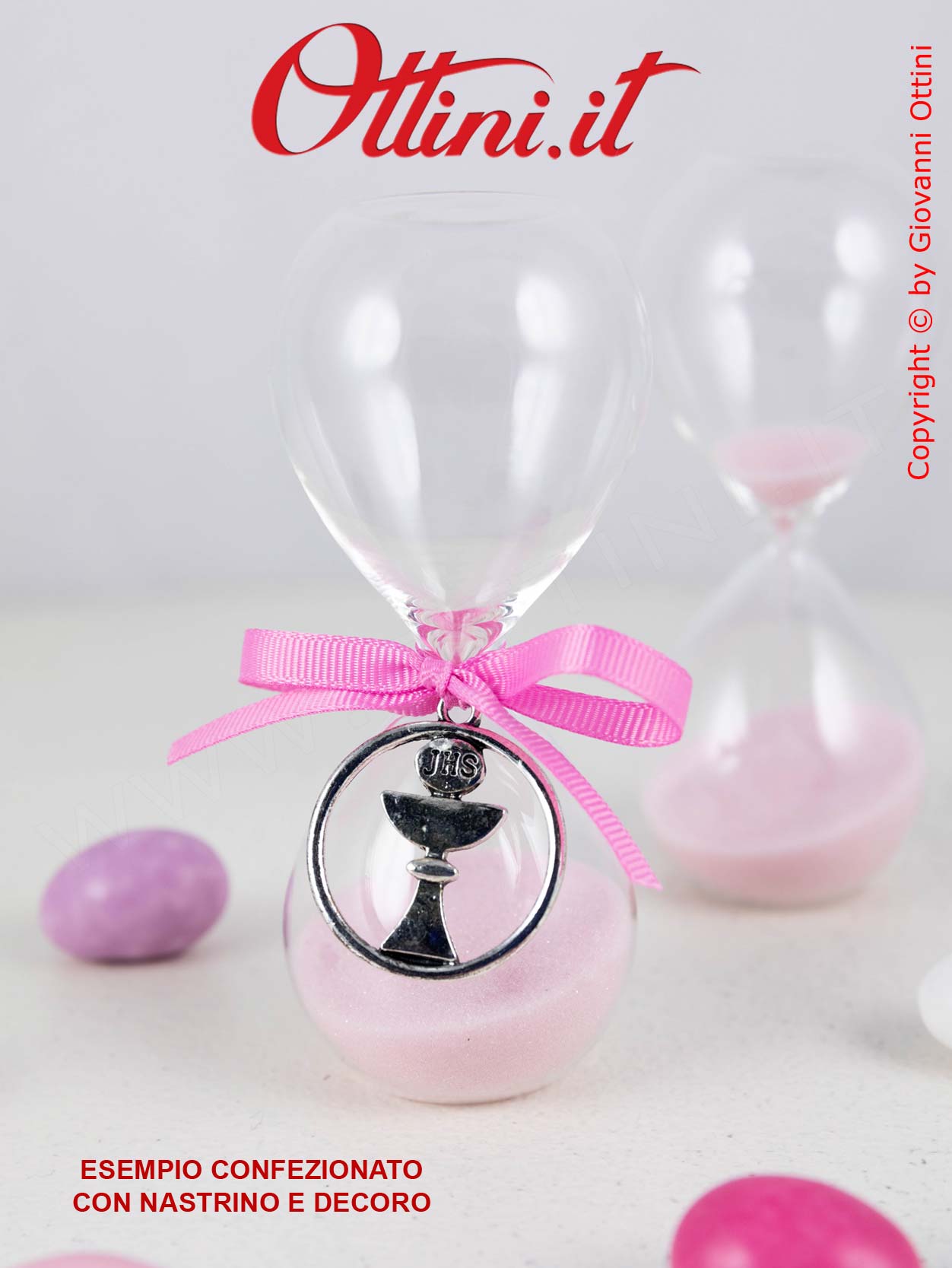 Per la confezione esterna della Clessidra Rosa c’è chi preferisce le scatoline in cartoncino dove non si veda il contenuto, chi dei sacchetti in tessuto, chi le adora così o legate ad altri oggetti (fiori ecc). Noi le proponiamo in negozio con la versione (oltretutto molto economica) della scatolina in PVC  legata con nastro in Organza da 20mm, oppure con il nuovo barattolo in vetro a chiusura ermetica con tappo in metallo con guarnizione in silicone. Quest’ultima versione, confezionata nelle immagini con nastrino in Doppio Raso da 15mm, è più costosa, ma il risultato è un “regalo nel regalo”.  Infatti il barattolo di vetro è veramente di altissima qualità e molto versatile per un post utilizzo in cucina. Sia nella versione Scatola Pvc che Barattolo, se ci volete mettere i confetti, potete acquistare un sacchettino in tessuto e il sacchettino per alimenti in cui inserire i confetti.