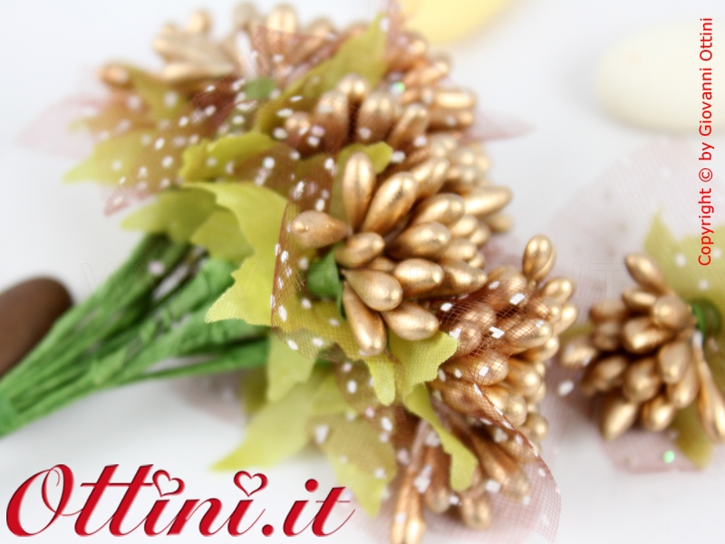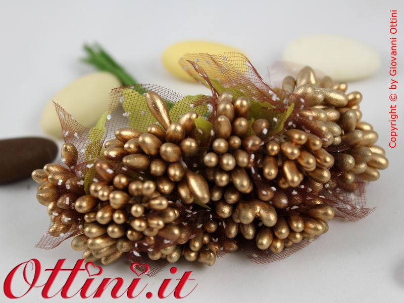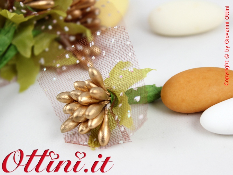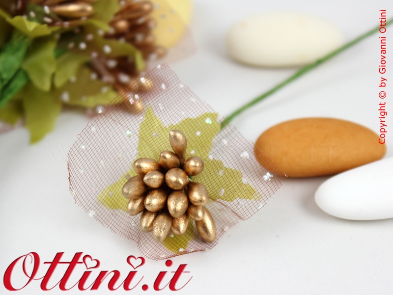 Originale composizione fiore di pistilli color oro e tulle con pois glitterati. E’ un prodotto di ottimo impatto visivo, elegante e di una dimensione performante sul piano estetico (può essere utilizzato da solo senza essere abbinato ad altri decori). Ideale nella decorazione di sacchettini, scatoline e confezioni destinate principalmente agli anniversari delle nozze d’oro. Il gambo in tenero metallo è completamente rivestito nel colore verde e può essere facilmente arrotolato con le dita.