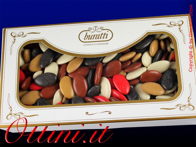 Senza Glutine – Esteticamente di forte impatto e senza glutine! Confetti della BURATTI al cioccolato fondente sfumati nei tipici colori dell’inverno, dal marrone della terra, al rosso dei tramonti. Se dovete confezionare prodotti in cui il confetto rimarrà visibile (ad esempio i classici tubicini in pvc, o scatoline in plexiglass) otterrete un risultato spettacolare! La resa è di circa 250 confetti per kg.