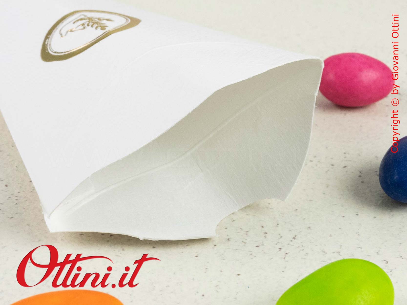 Cono Portariso o Portaconfetti con simboli della Santa Cresima realizzato in cartoncino bianco di ottima qualità e consistenza. Sulla facciata anteriore troviamo un bellissimo e raffinato decoro stampato in oro a caldo raffigurante la colomba dello Spirito Santo. Il sistema di apertura e chiusura è rapidissimo e sicuro, non richiede l’uso di nastri o colle ed assicura una perfetta tenuta evitando che il contenuto possa fuoriuscire accidentalmente.