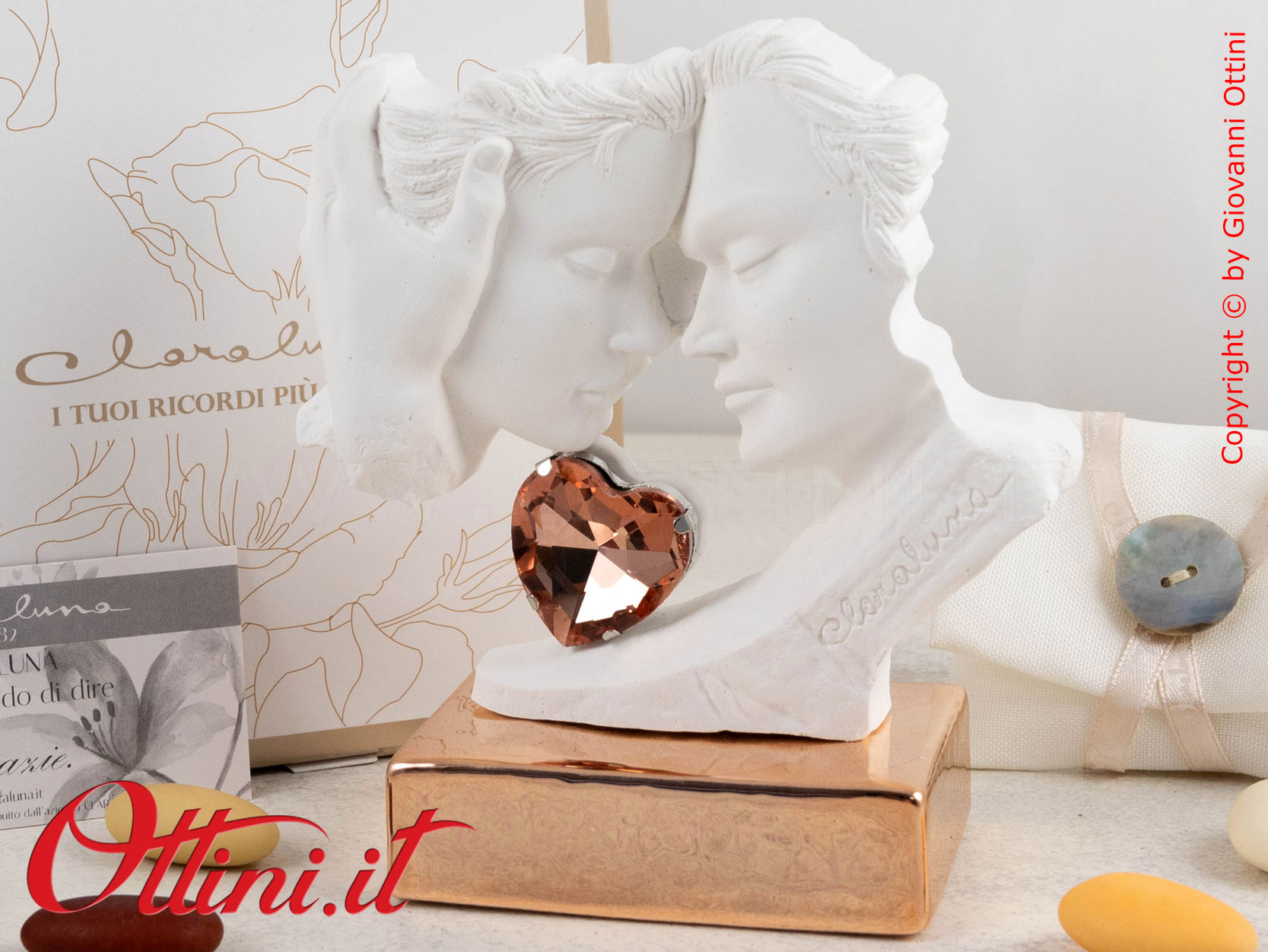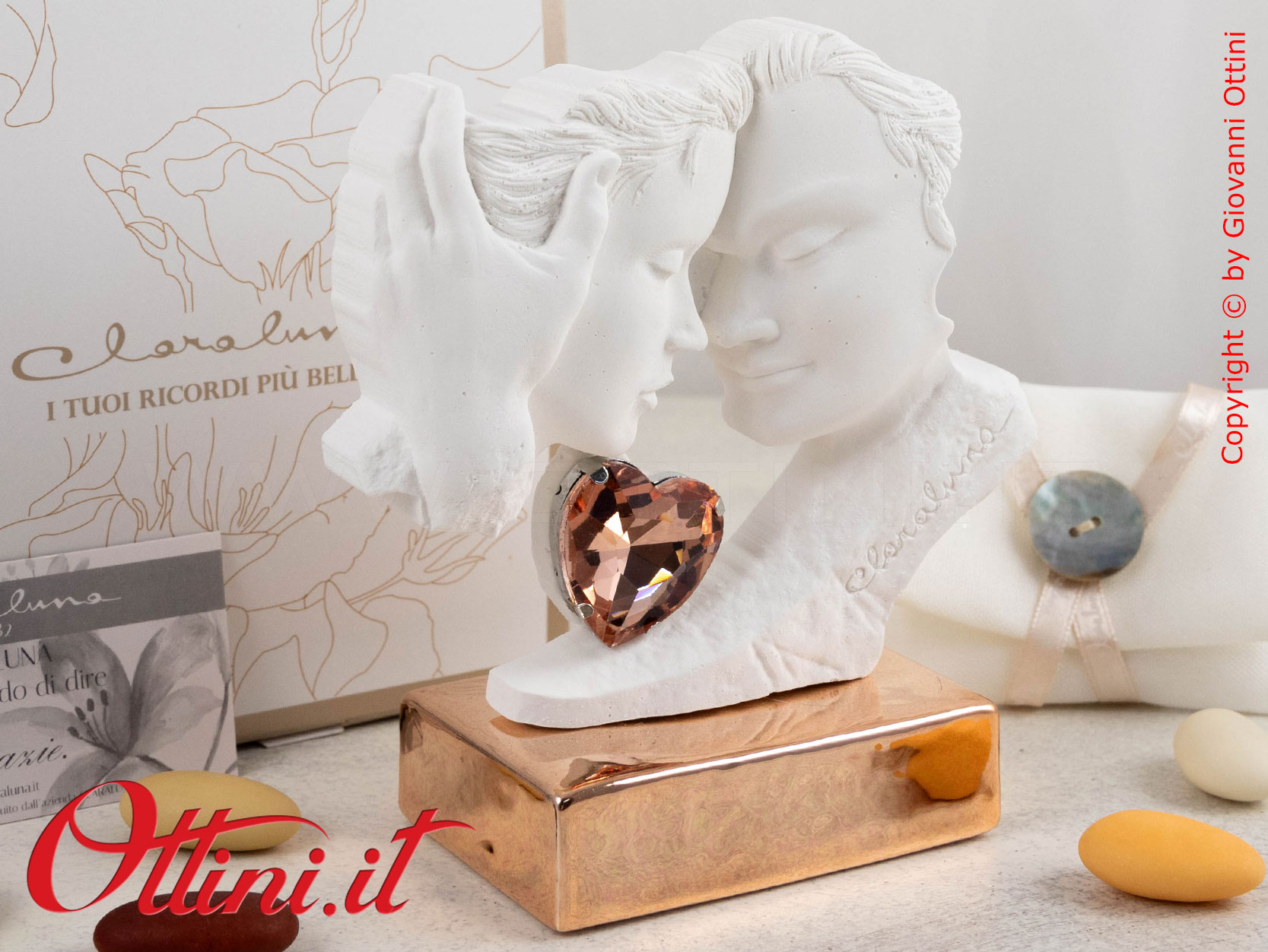 Una scultura che trasmette emozione avrà un valore aggiunto speciale, sarà quel complemento d’arredo unico che coinvolge i sentimenti di chi lo osserva. Claraluna ha pensato ai più romantici con questa coppia di innamorati sospesi in un gesto d’amore naturale e realistico, valorizzata da una base in colore oro rosa con finitura martellata a specchio. Un cuore brillante tra i due volti completa con eleganza la scultura in gesso. Spettacolare prodotto!