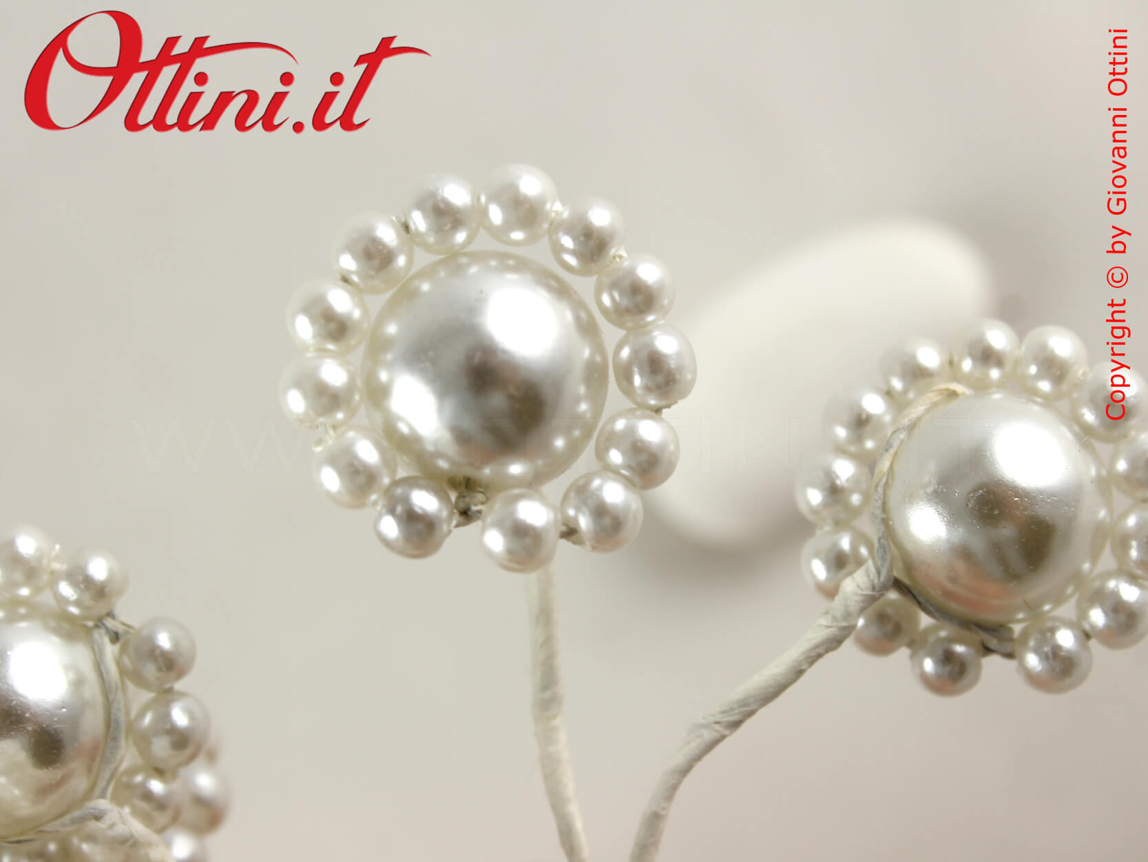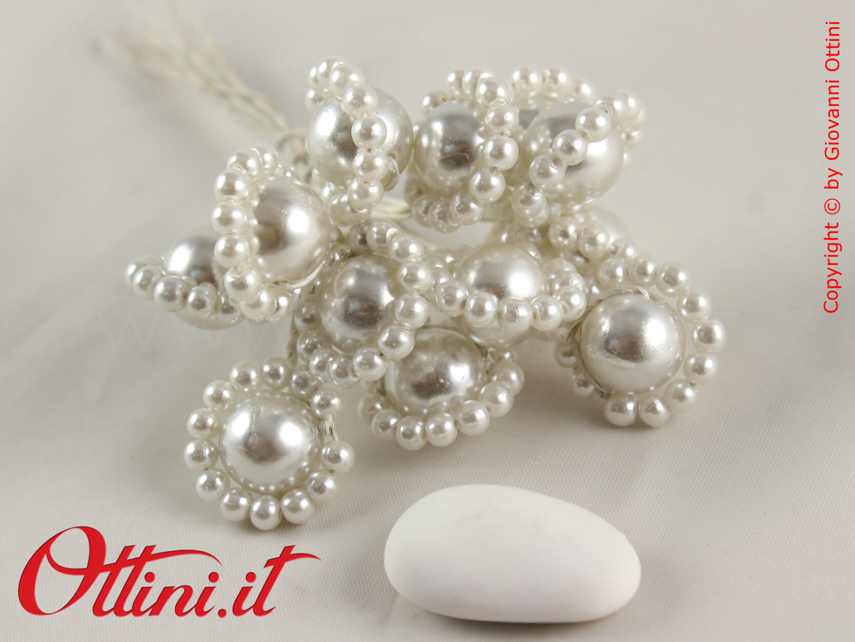 La decorazione Bottone Perle Bianche è un prodotto molto elegante che vi permetterà di dare un tocco di classe alle vostre creazioni. E’ formato da una perla (una finta perla ovviamente) dal diametro di 12 mm cirondata da un anellino di perline più piccole. La dimensione è perfetta per conferire un aspetto luminoso ai prodotti a cui lo applicherete. Si abbina a tutti i tipi di nastri dai colori chiari.