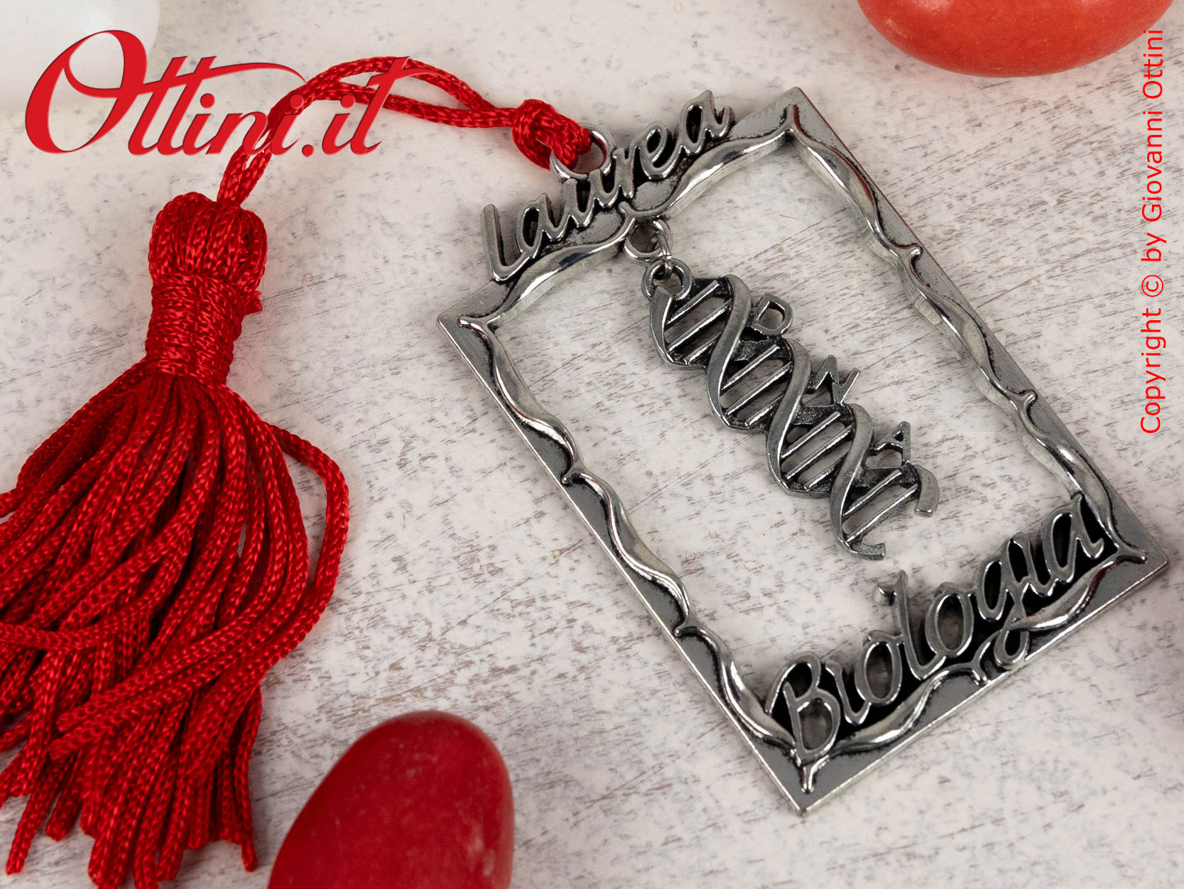 Elegantissimo decoro per laurea in Biologia realizzato in zama argentata. E’ composto da una cornice in cui sono ricavate le scritte e un pendaglio centrale con il simbolo della facoltà. Completo di cordoncino con nappa rossa che conferisce un aspetto molto gradevole e di qualità, è ideale per la decorazione di barattoli, vasetti e sacchettini. Sulla parte superiore è ricavato un anellino che permetterà di essere applicato al vostro portachiavi.