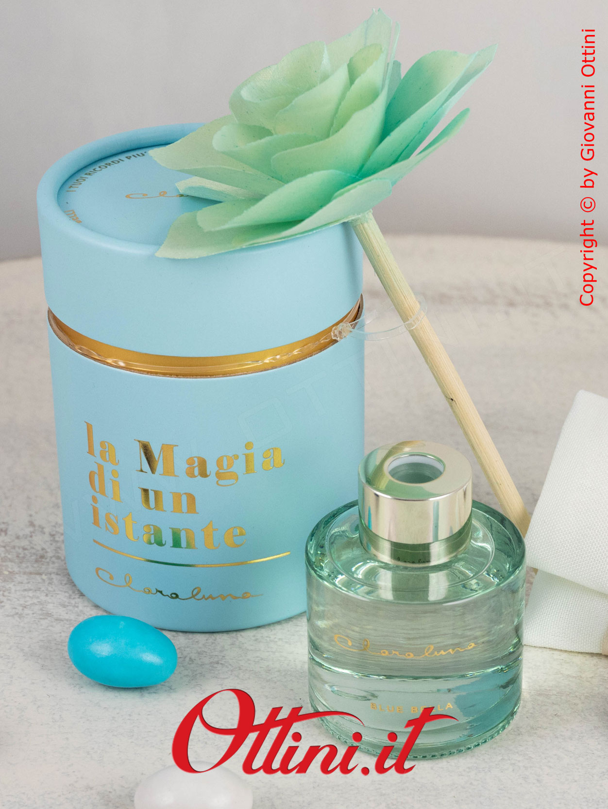 La semplicità valorizza l’eleganza di qualsiasi cosa naturalmente bella: questo diffusore di profumo di Claraluna è composto da un flacone di essenza colore azzurro con un originalissimo fiore totalmente realizzato in legno. La fragranza si chiama “Blue Bella” ed è contenuta in questa boccetta di vetro spesso con tappo dorato. Il fiore andrà inserito nella boccetta e avrà la funzione di diffondere la fragranza. Il packaging è coordinato al profumo ed è composto dal bellissimo astuccio rotondo personalizzato con la scritta in oro a caldo “La Magia di un Istante”.