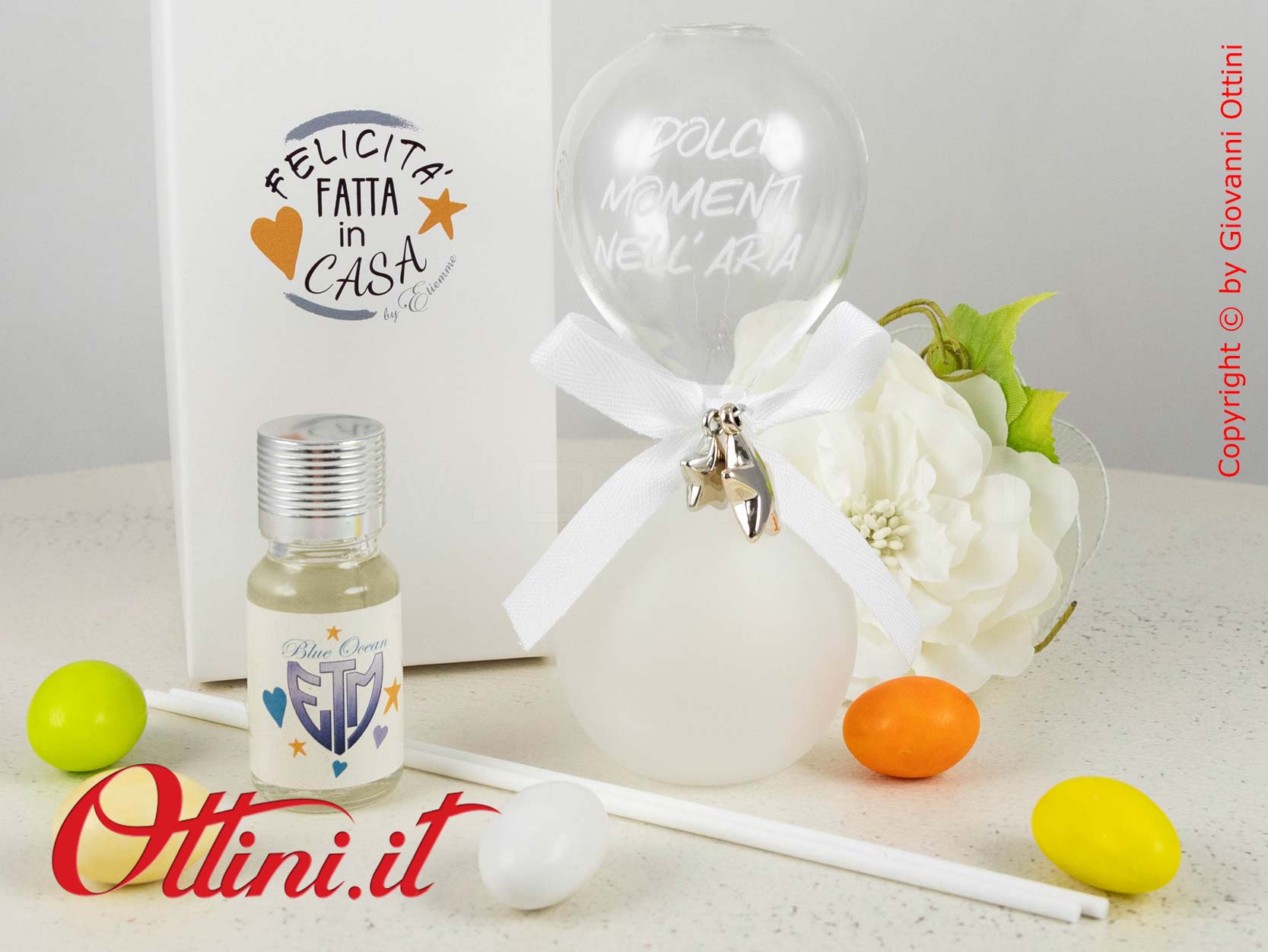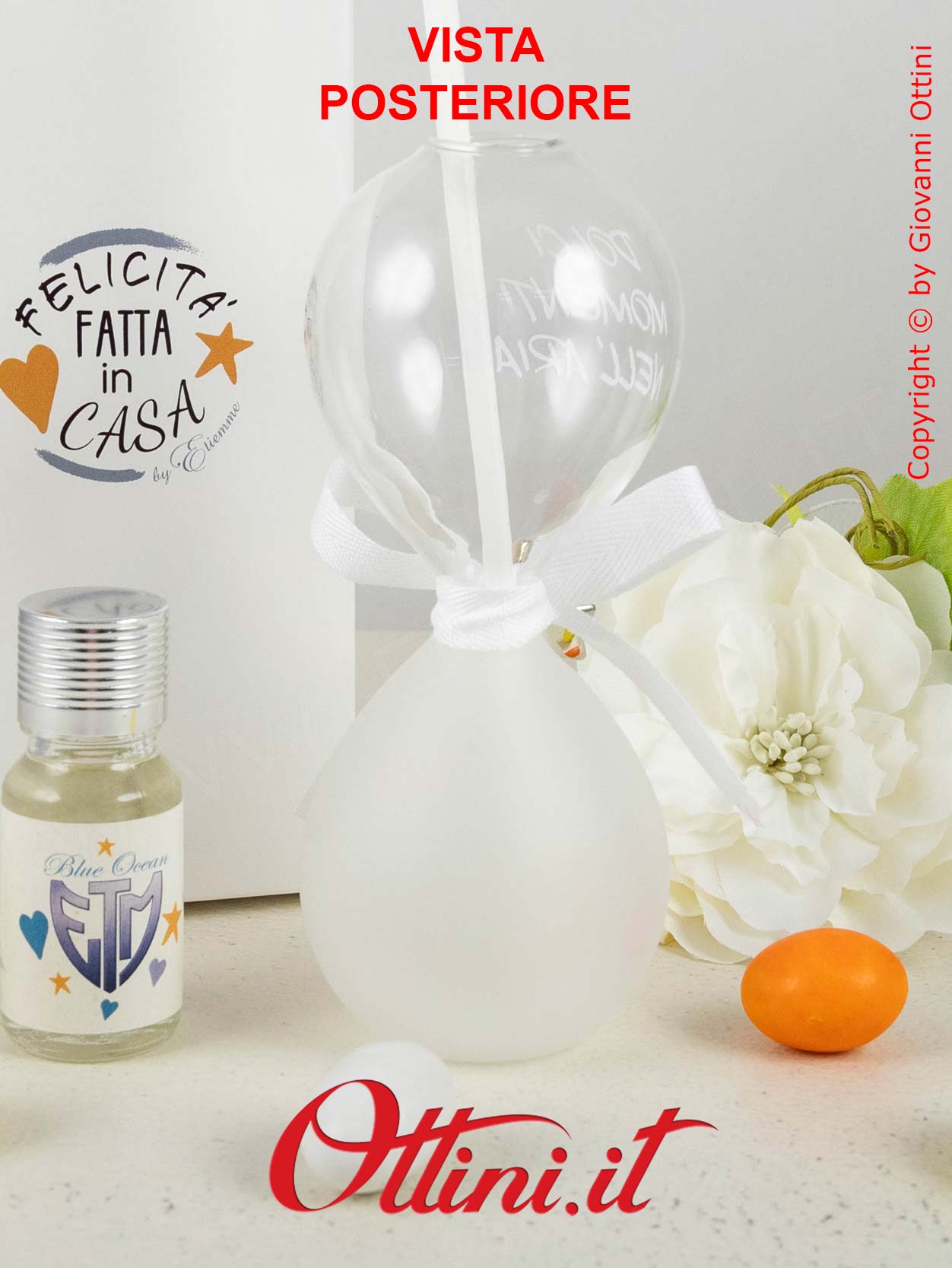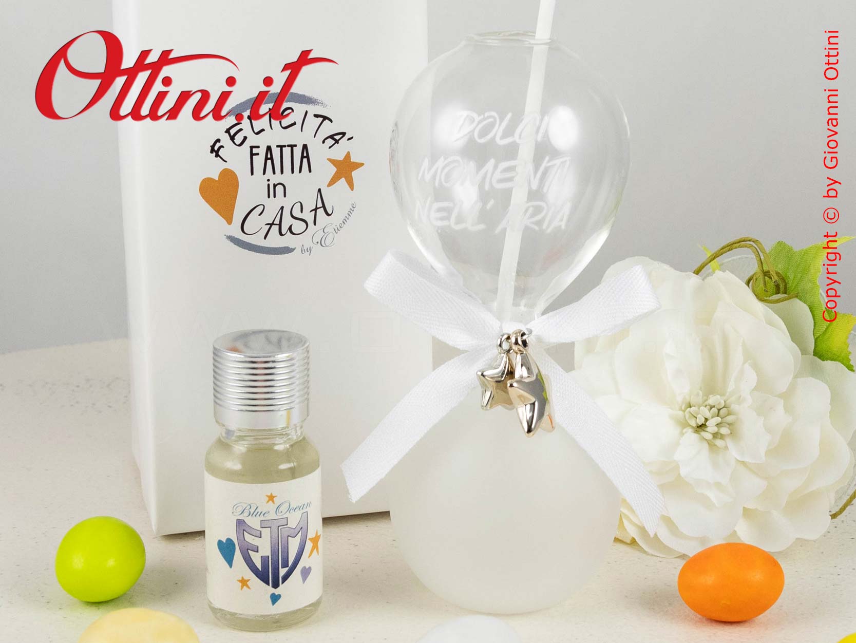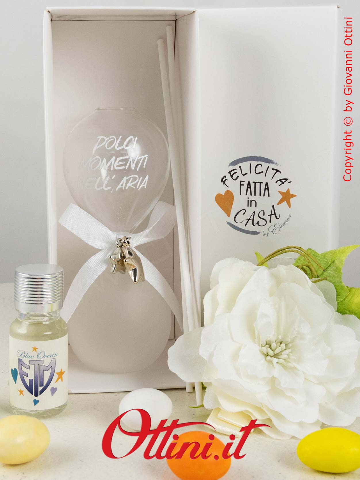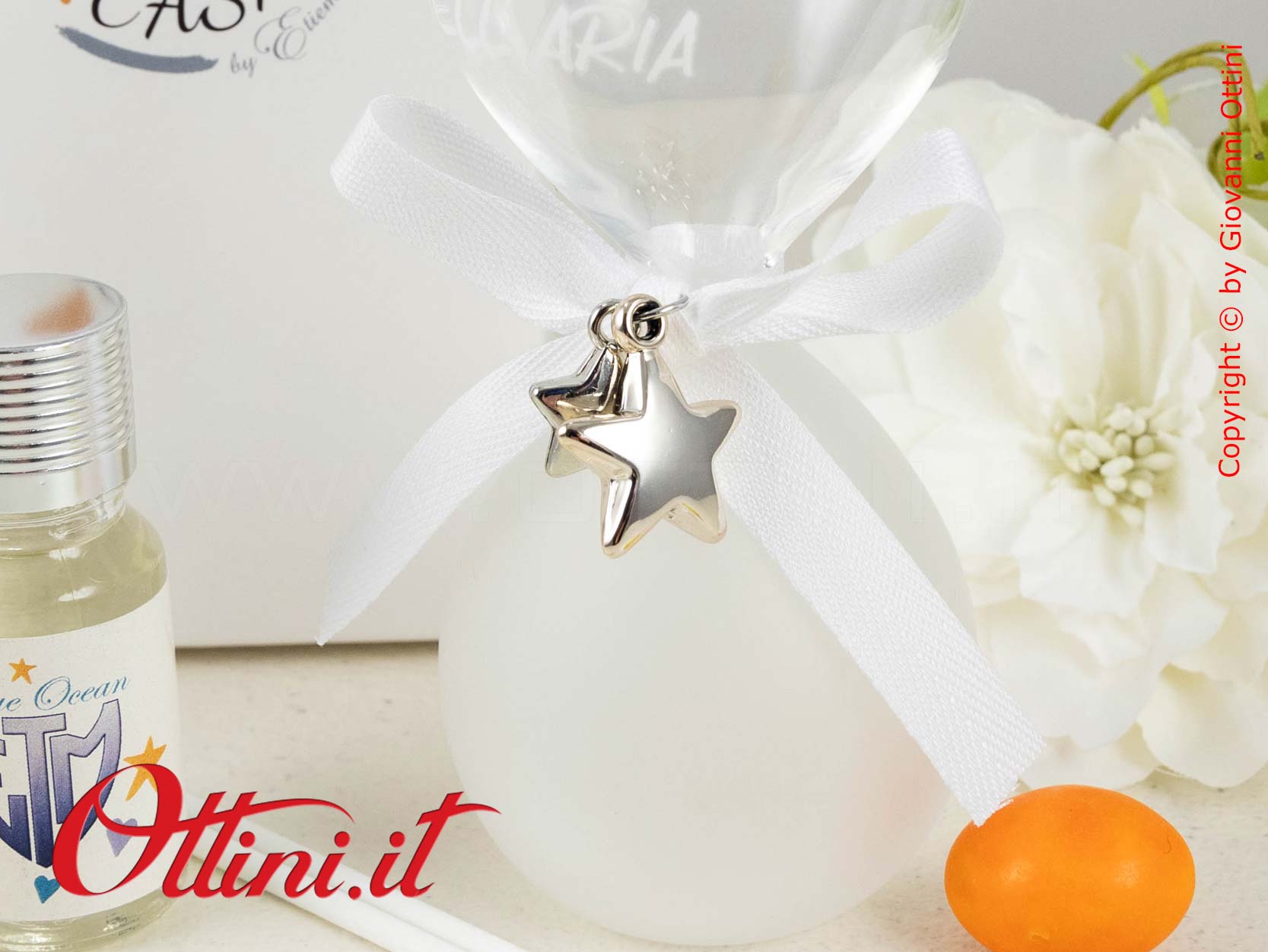 Dolci momenti… nell’aria… è la scritta che troverete stampata su questo splendido diffusore di profumo a forma di clessidra piccola con 2 charms a forma di stelle. Realizzata in vetro, è caratterizzata da un design originale e soprattutto funzionale: la parte inferiore ha una finitura satinata che oltre a creare un effetto “soft”, nasconde il liquido del profumo. Al centro è presente il fiocchetto con i charms già annodati. Nel corredo sono compresi anche i bastoncini diffusori e il flaconcino con l’essenza di profumo.