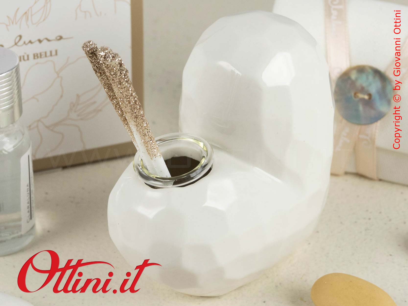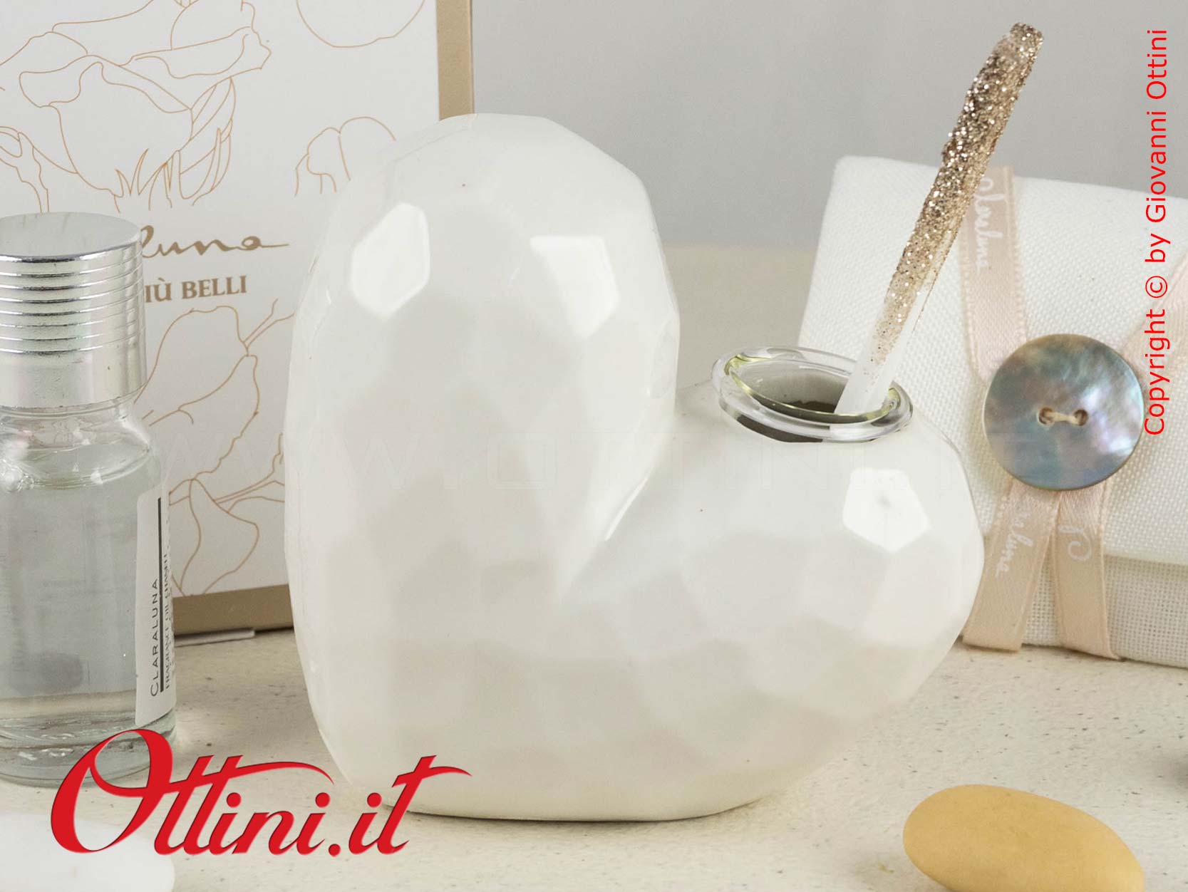 Profumatore diffusore in porcellana smaltata a forma di cuore color bianco. Il formato è di cm 7,5×7,5×4,5. Le sfaccettature della finitura esterna conferiscono al design una linea moderna e romantica, mentre il colore lucido e chiaro è ottimale per l’abbinamento a qualsiasi tipo di arredo. Con il prodotto sono compresi i bastoncini diffusori con finitura glitterata e il flaconcino di essenza Claraluna.