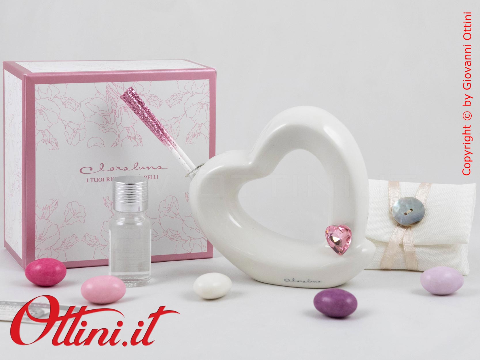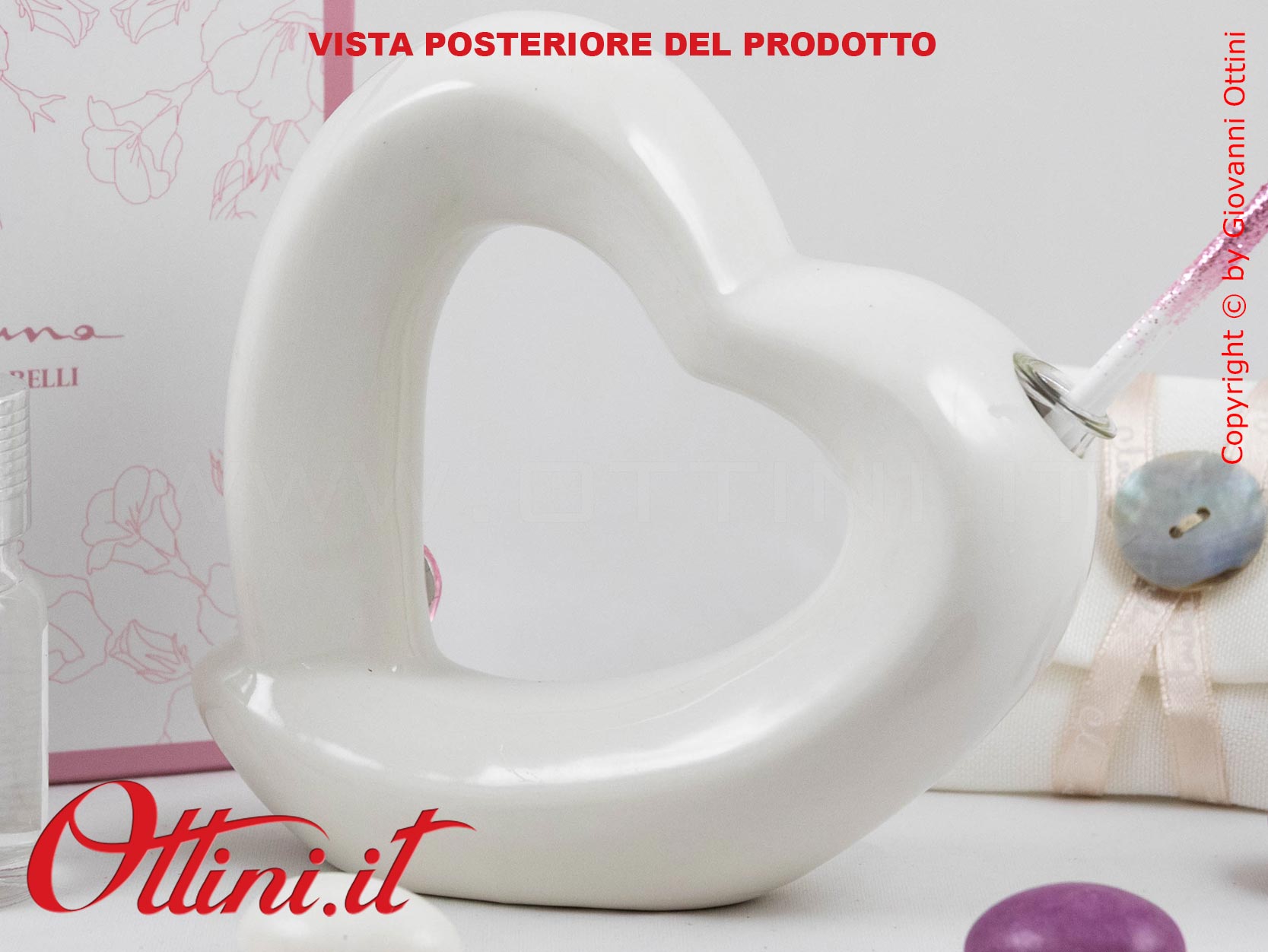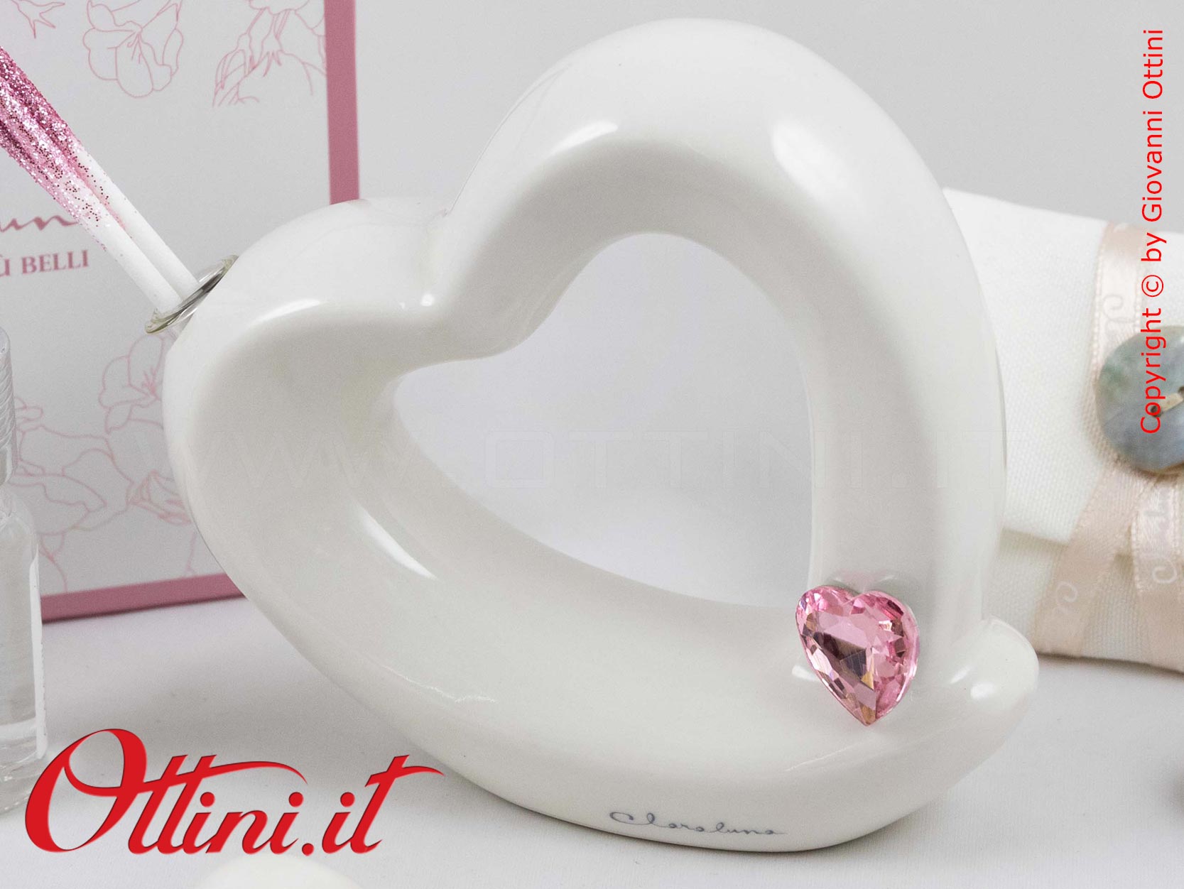Diffusore profumatore per ambienti a forma di cuore con applicazione cuoricino Rosa. Realizzato in fine porcellana bianca smaltata, si distingue per il design moderno che si adatta a qualsiasi tipo di arredo. Il prodotto è completo del kit essenza composto dai bastoncini diffusori bianchi con glitter oro e il flaconcino di profumo. Simbolo di unione e amore, è ideale per gli eventi come i matrimoni, ma anche per Battesimi, comunioni e Cresime per bambina.
