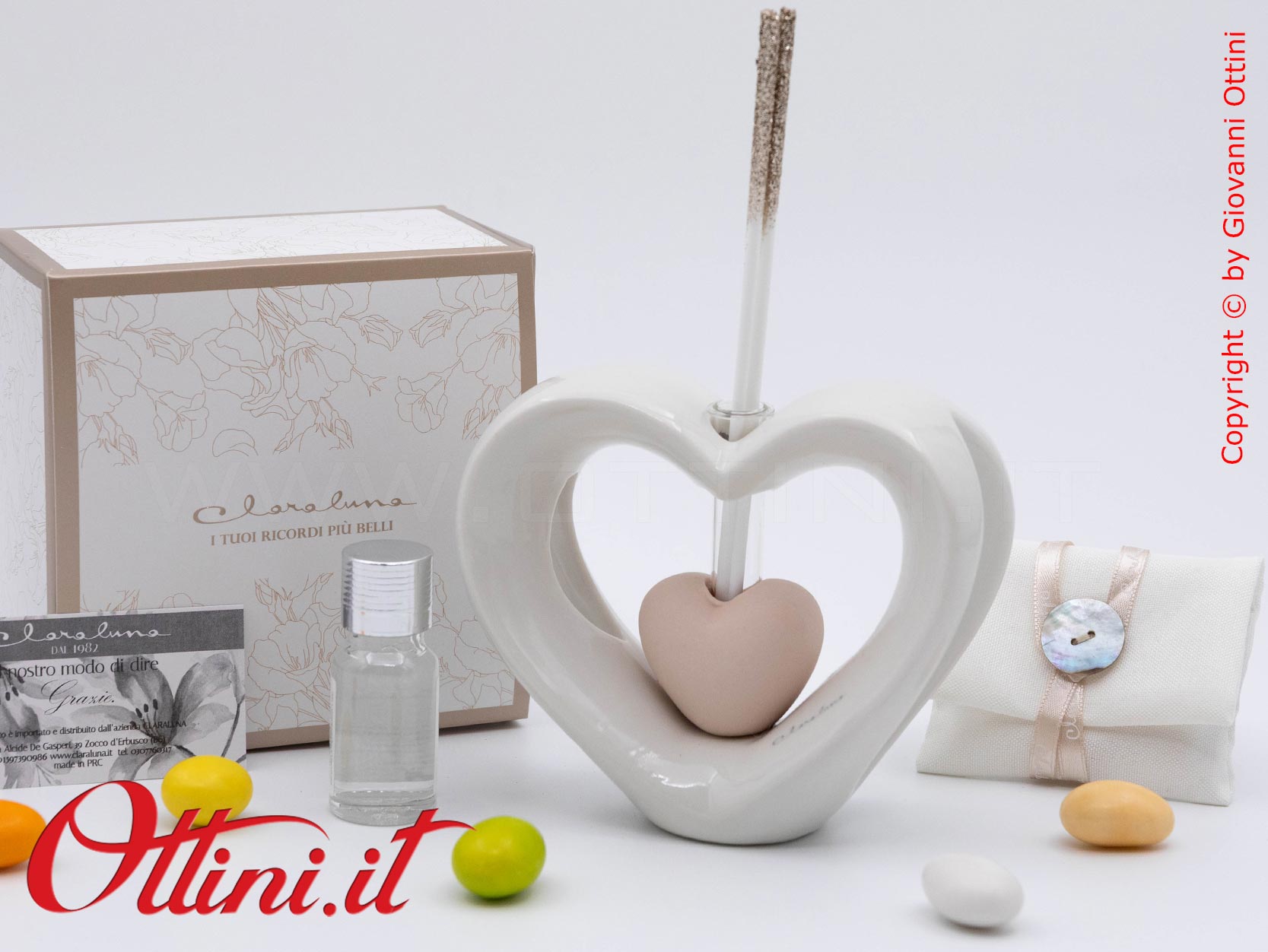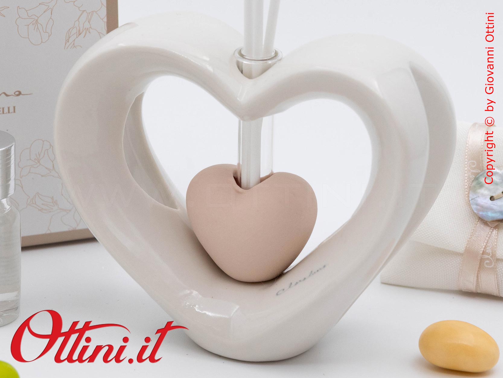 Design romantico e moderno per un diffusore di profumo per ambienti a forma di cuore, realizzato in porcellana bianca con cuore Tortora incastonato al centro. Materiali di prestigio ed eleganti per un oggetto che unisce l’aspetto utile a quello di un componente di arredo prestigioso. Nel corredo è incluso il kit essenza composto dai bastoncini diffusori con finitura glitterata e il flaconcino di profumo.