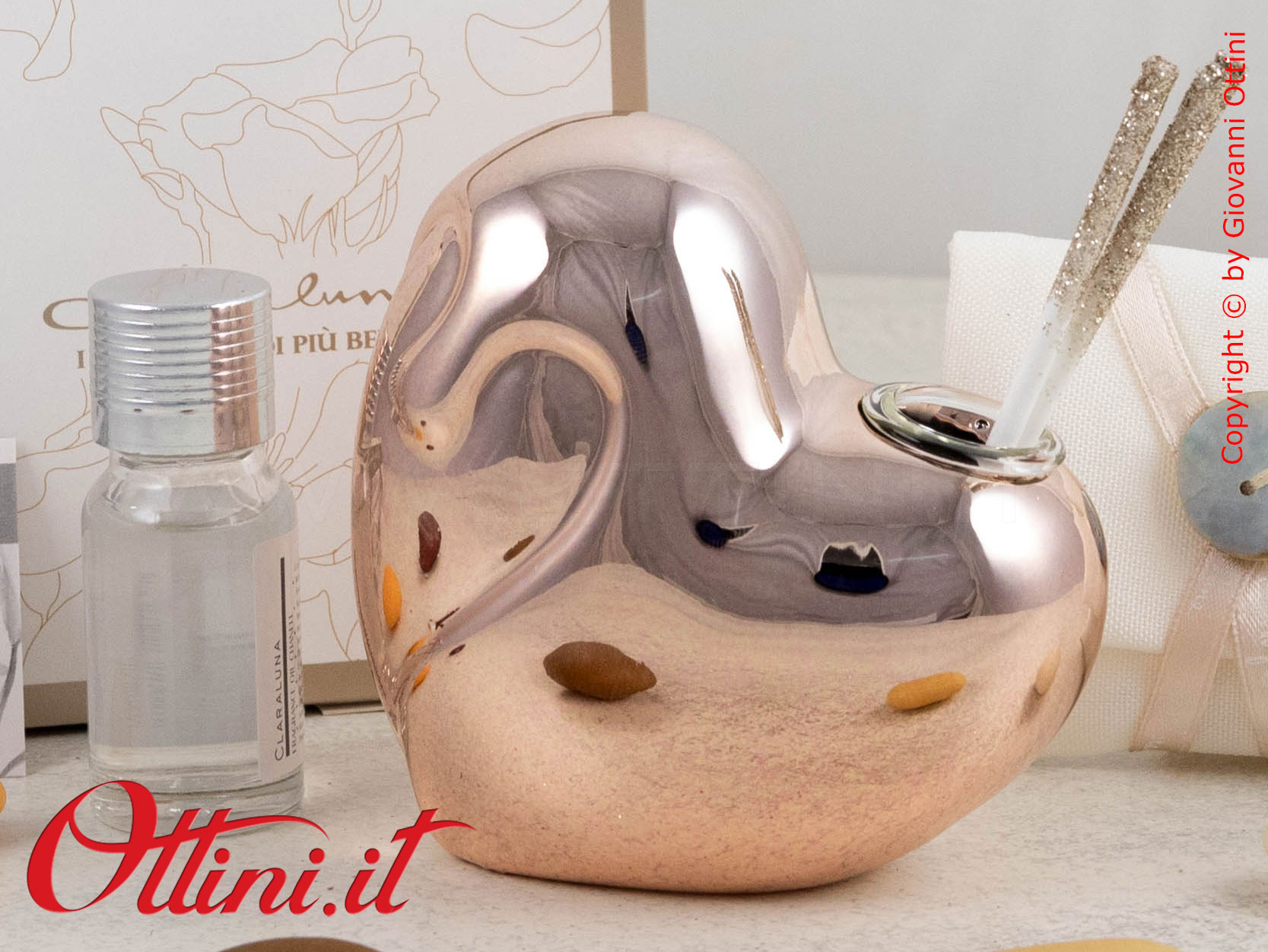 Eleganza, raffinatezza, design contemporaneo: sono tre aggettivi perfetti per descrivere questo Diffusore a forma di cuore nel colore oro rosa con finitura a specchio. Claraluna è un’azienda leader da sempre molto propositiva, specialmente per i prodotti destinati all’arredo, con estetica ricercata e lavorazioni esclusive. Questo diffusore è caratterizzato dalla forma a cuore in cui è raffigurato un bassorilievo di un altro cuore. Realizzato in porcellana, è completo del kit essenza, composto dai bastoncini diffusori bianchi a finitura glitterata e dal flaconcino di profumo.