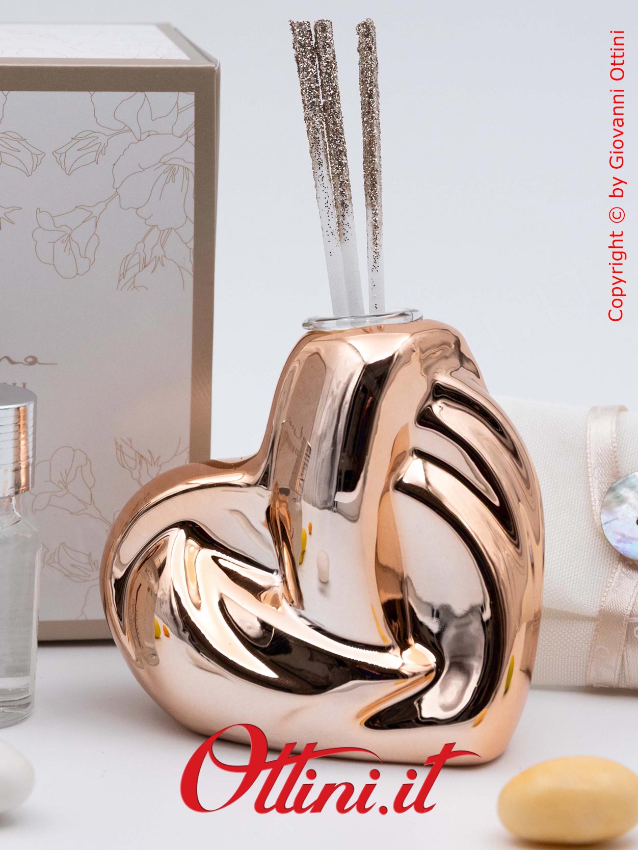 Design assolutamente moderno e accattivante per un diffusore di profumo per ambienti spettacolare, a forma di cuore stilizzato nella tinta oro rosa. Realizzato in porcellana smaltata, ha finiture di pregio, elegantissime. E’ completo del kit essenza composto dai bastoncini diffusori glitterati e dal flaconcino di profumo originale Claraluna. E’ un oggetto giovane, indicato per anniversari e matrimoni, ma anche come dono a persone che hanno un posto nel nostro cuore.