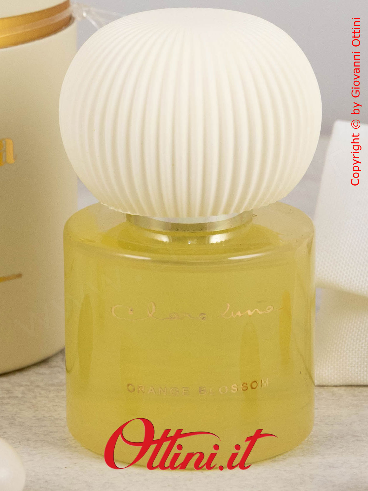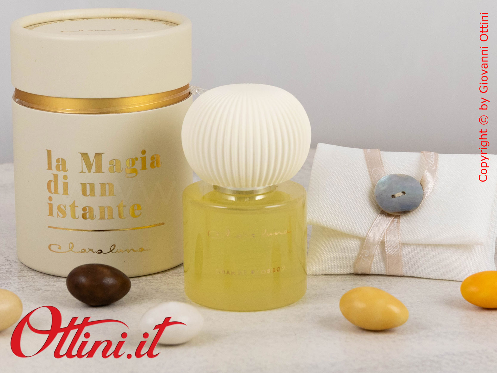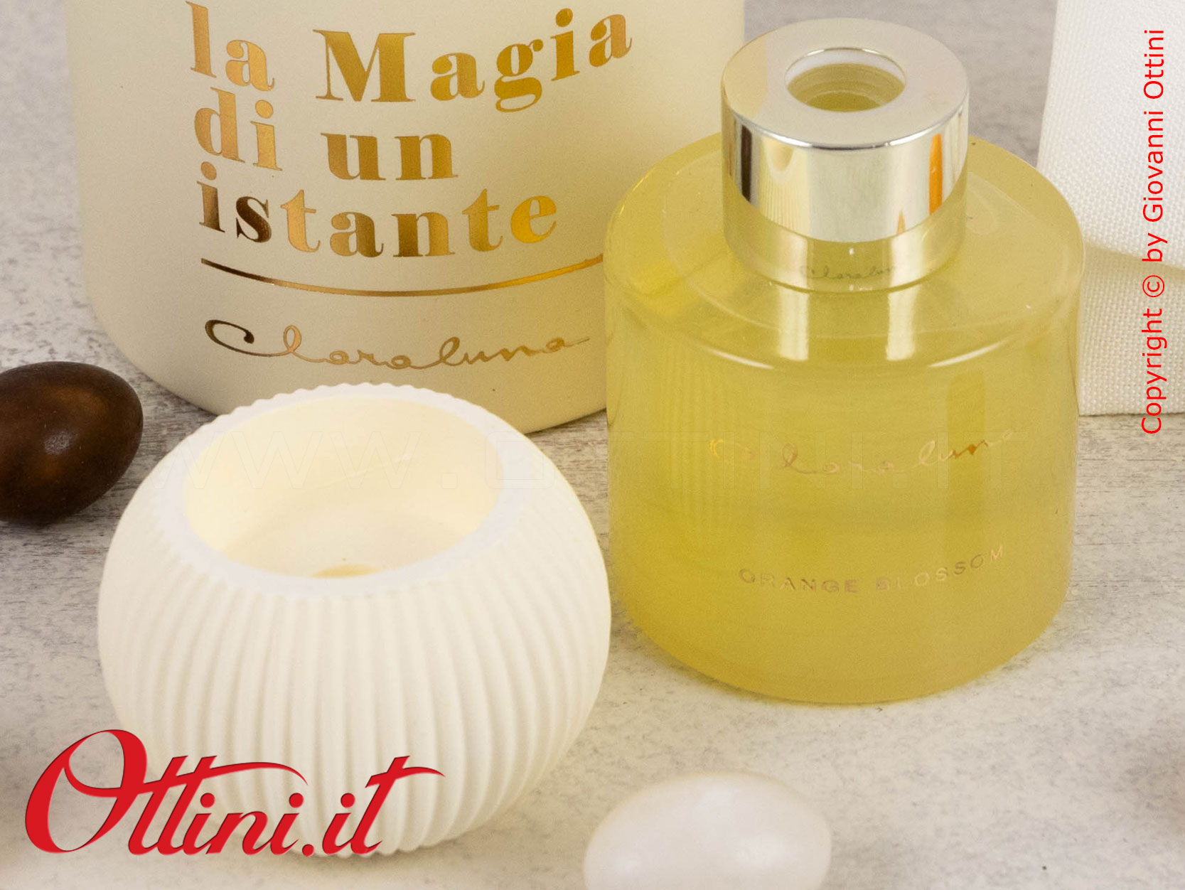 La semplicità valorizza l’eleganza di qualsiasi cosa naturalmente bella: questo diffusore di profumo di Claraluna è composto da un flacone di essenza colore giallo con un originalissimo gesso a lavorazione plissè realizzato nella nuance di colore coordinato al profumo. La fragranza si chiama “Orange Blossom” ed è contenuta in questa boccetta di vetro spesso con tappo dorato. Il gessetto è provvisto di un bastoncino di “pescaggio” avrà la funzione di diffondere la fragranza attraverso il gesso. Il packaging è coordinato al profumo ed è composto dal bellissimo astuccio rotondo personalizzato con la scritta in oro a caldo “La Magia di un Istante”.