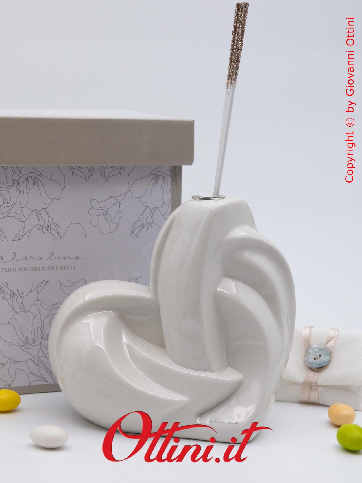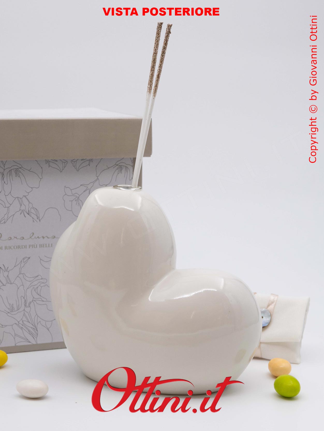 Design assolutamente moderno e accattivante per un diffusore di profumo per ambienti spettacolare, formato grande a forma di cuore stilizzato nel colore bianco. Realizzato in porcellana smaltata, ha finiture di pregio, elegantissime. E’ completo del kit essenza composto dai bastoncini diffusori glitterati e dal flaconcino di profumo originale Claraluna. E’ un oggetto giovane, indicato per anniversari e matrimoni, ma anche come dono a persone che hanno un posto nel nostro cuore.