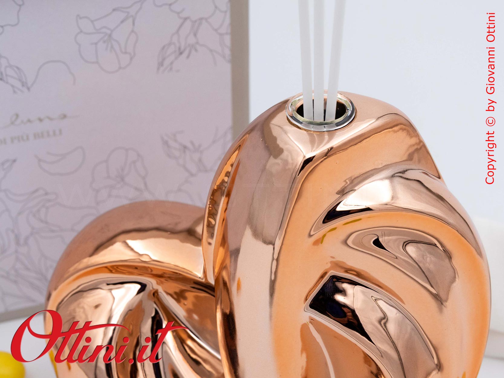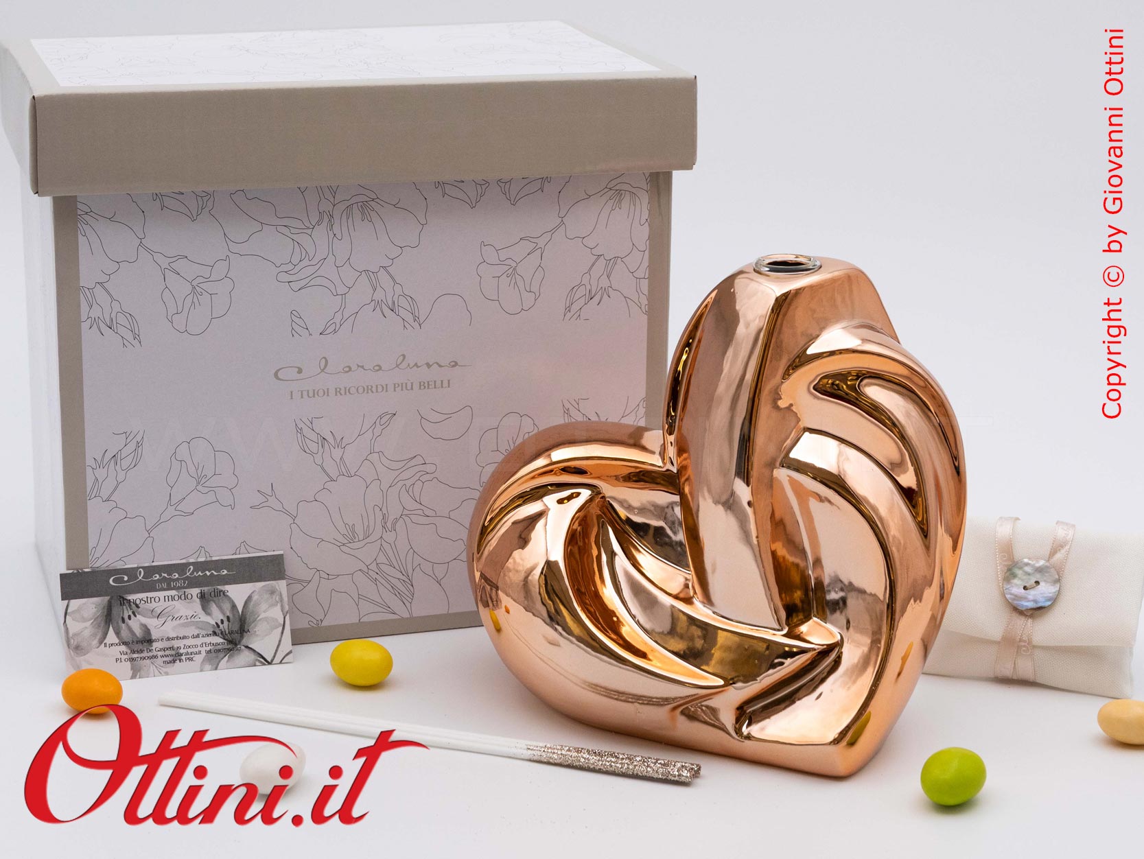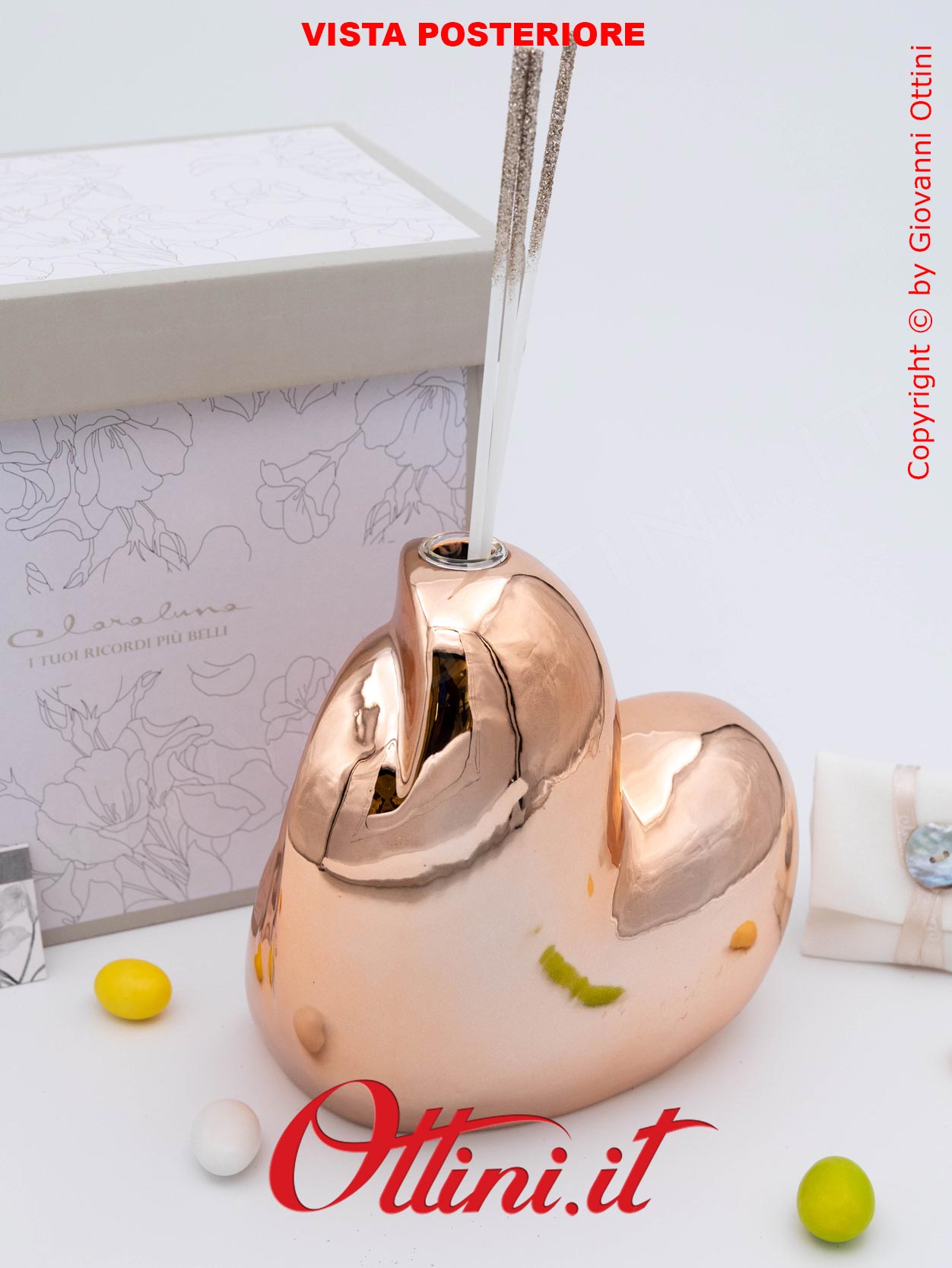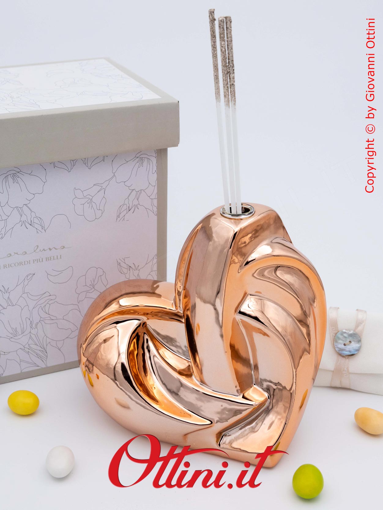 Design assolutamente moderno e accattivante per un diffusore di profumo per ambienti spettacolare, formato grande a forma di cuore stilizzato nella tinta oro rosa. Realizzato in porcellana smaltata, ha finiture di pregio, elegantissime. E’ completo del kit essenza composto dai bastoncini diffusori glitterati e dal flaconcino di profumo originale Claraluna. E’ un oggetto giovane, indicato per anniversari e matrimoni, ma anche come dono a persone che hanno un posto nel nostro cuore.