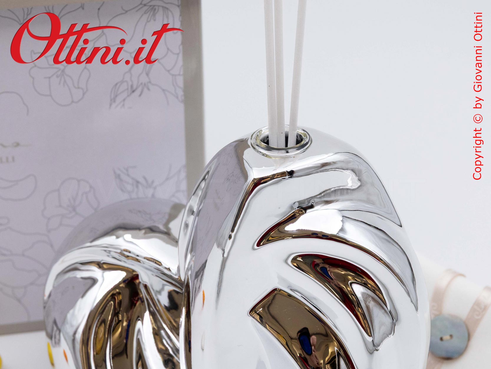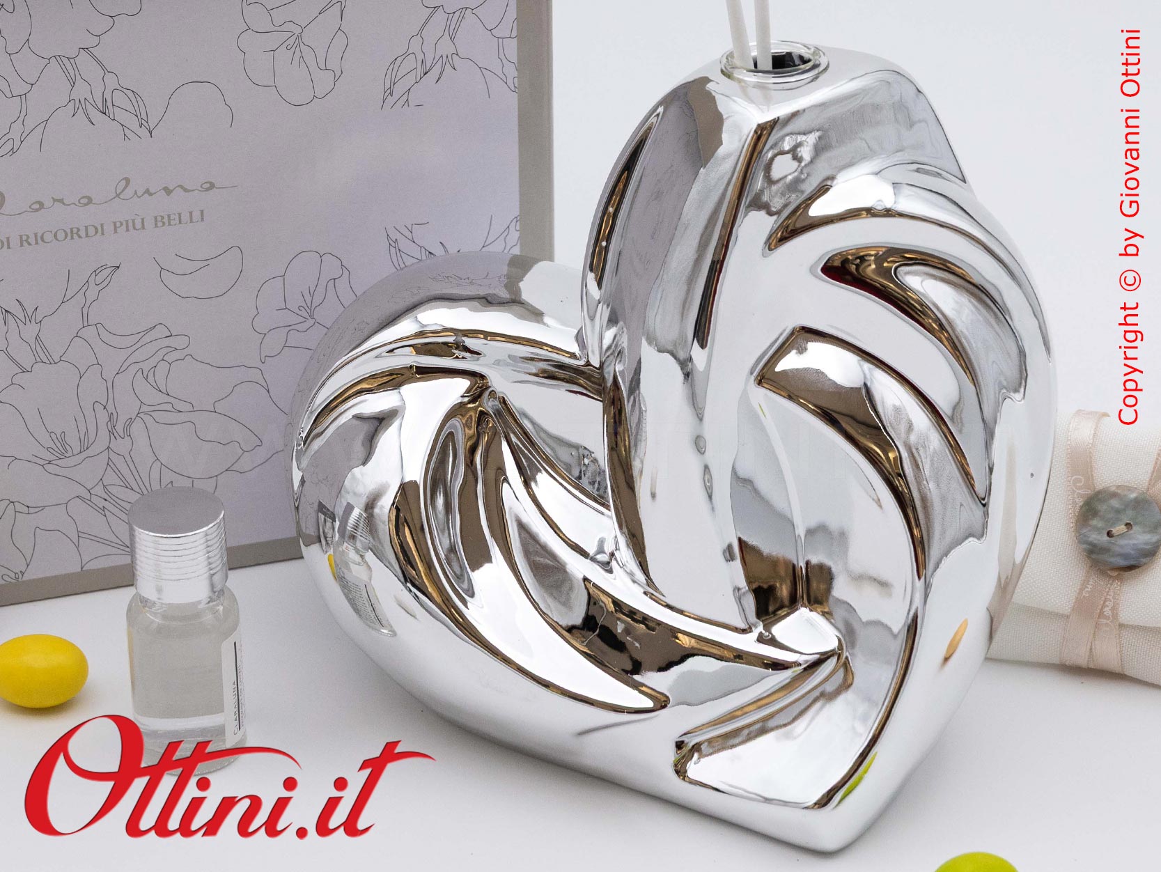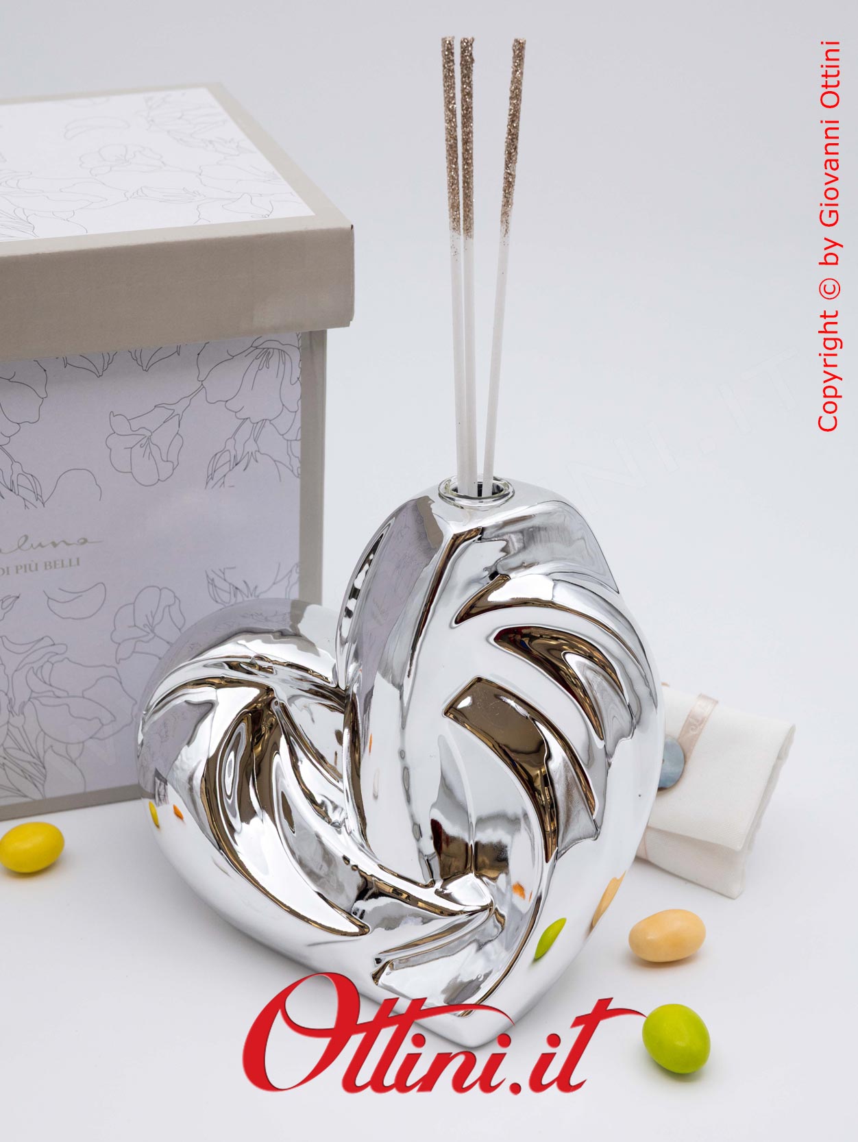Design assolutamente moderno e accattivante per un diffusore di profumo per ambienti spettacolare, formato grande a forma di cuore stilizzato nella tinta argento silver. Realizzato in porcellana smaltata, ha finiture di pregio, elegantissime. E’ completo del kit essenza composto dai bastoncini diffusori glitterati e dal flaconcino di profumo originale Claraluna. E’ un oggetto giovane, indicato per anniversari e matrimoni, ma anche come dono a persone che hanno un posto nel nostro cuore.