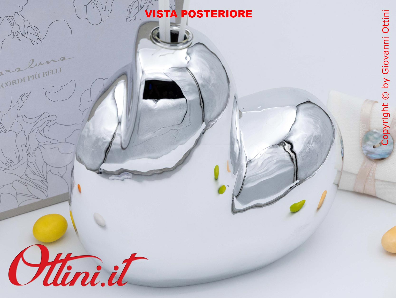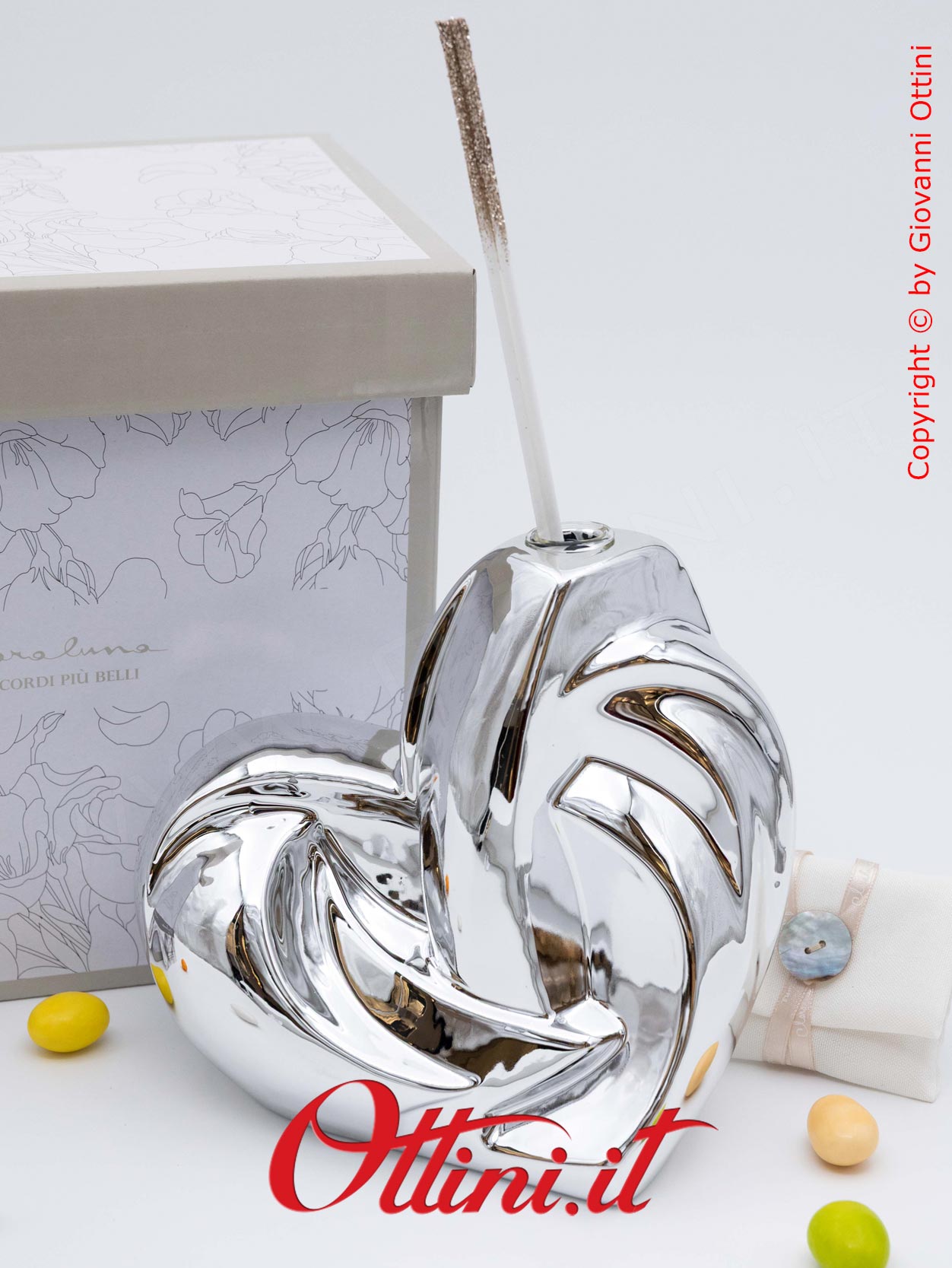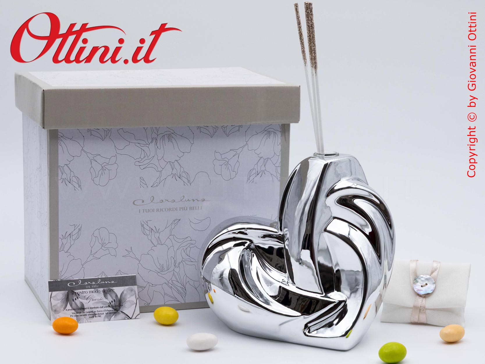 ATTENZIONE: imballiamo con estrema cura le bomboniere come il Diffusore Grande Cuore Silver – 26138 Claraluna. Tuttavia è possibile che durante il trasporto, il corriere possa danneggiarle per una infinita serie di ragioni. State tranquilli perché la merce viaggia assicurata e in caso di danno siamo qui per sostituire gratuitamente le rotture, ma dovete solo seguire una sola regola: al ricevimento, prestare attenzione all’incolumità del collo e opponete sempre “RISERVA DI CONTROLLO”, specificando eventualmente il danno (rumore di rottura, cartone schiacciato, ammaccato, ecc). L’autista è OBBLIGATO ad accettare la riserva. Se non opponete la Riserva, e dovessero risultare rotte, diventa problematico far valere l’assicurazione e procedere con la sostituzione.