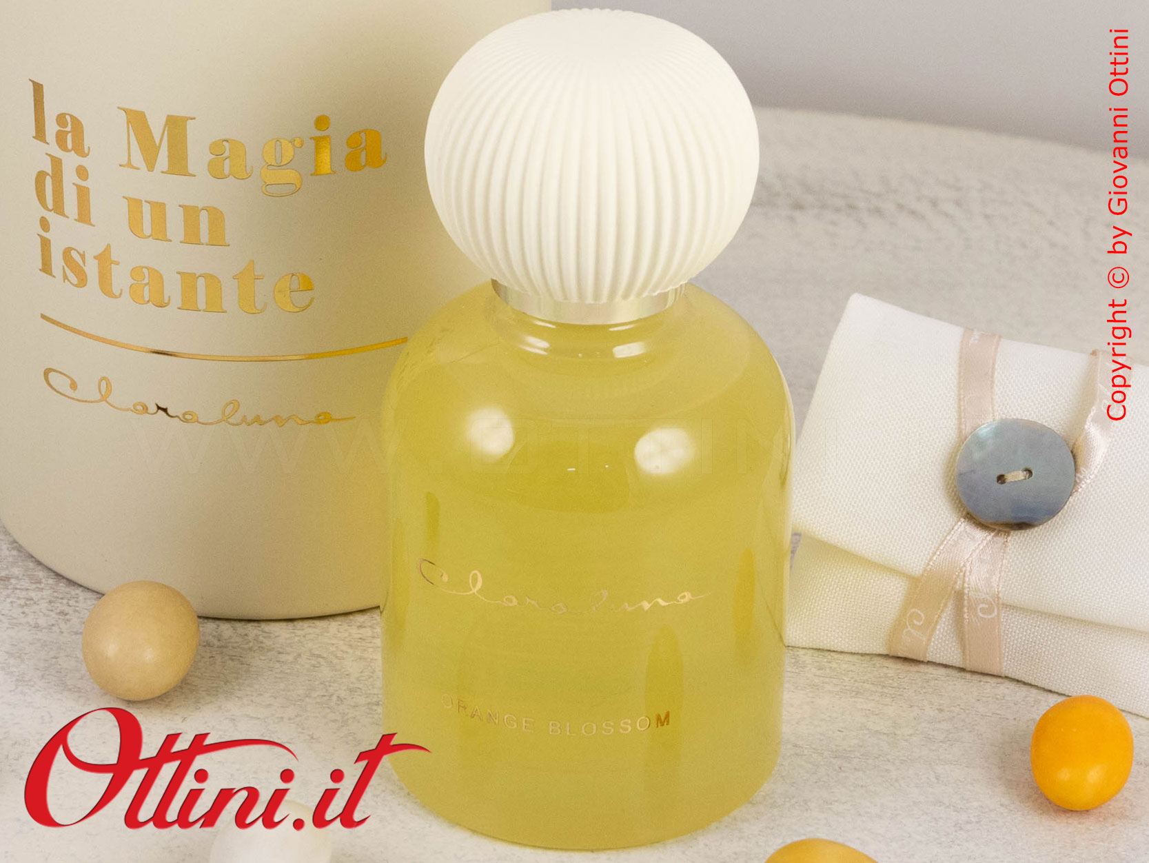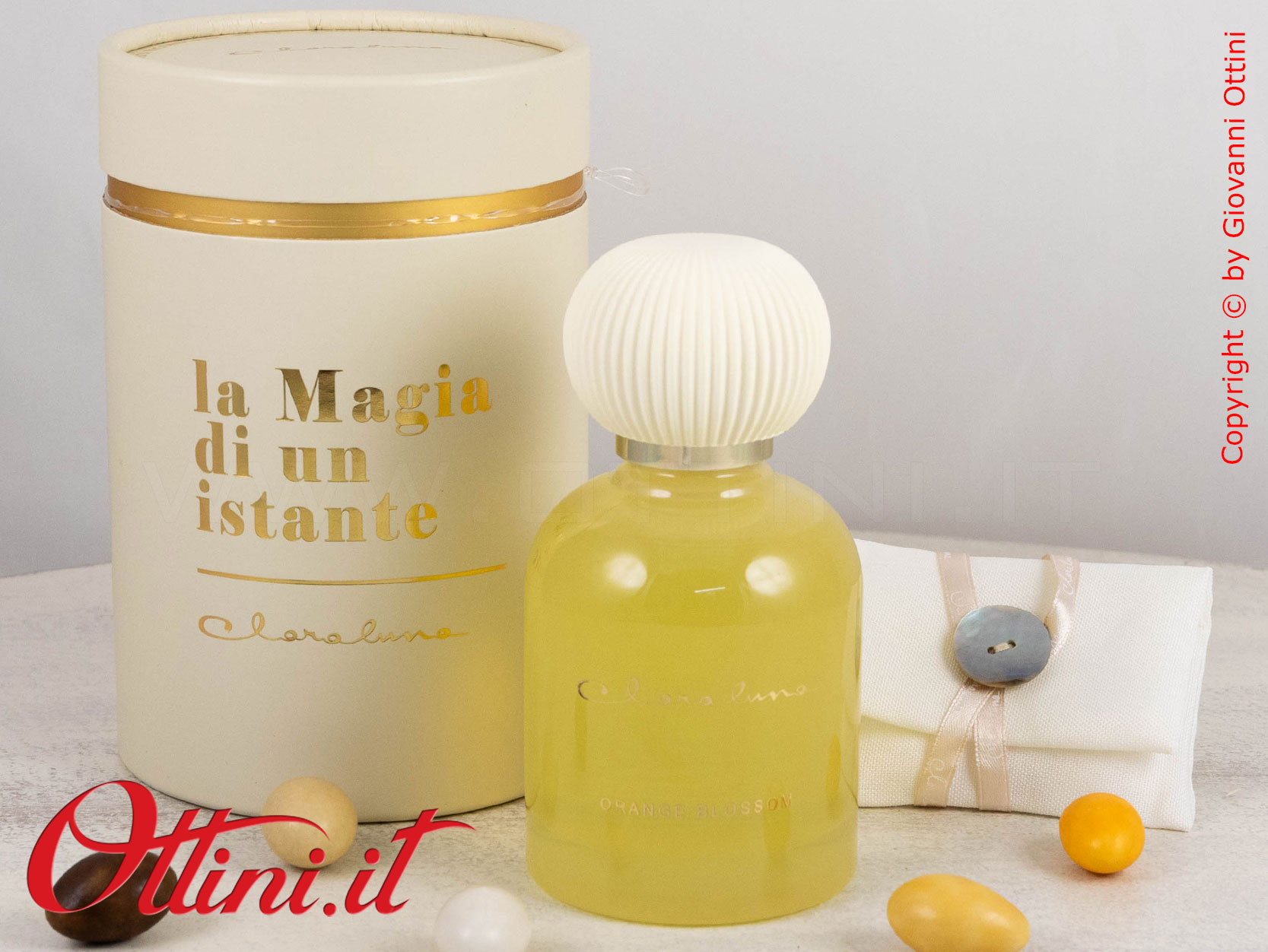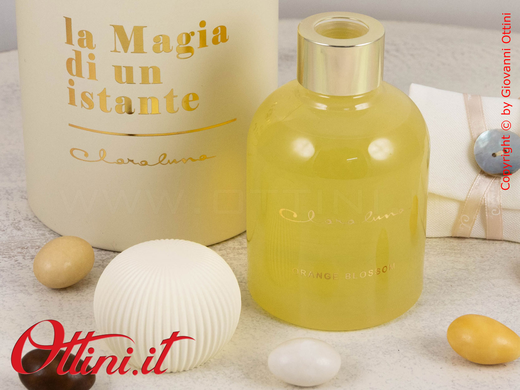 La semplicità valorizza l’eleganza di qualsiasi cosa naturalmente bella: questo diffusore GRANDE di profumo di Claraluna è composto da un flacone di essenza colore Giallo con un originalissimo gesso a lavorazione plissè realizzato nella nuance di colore coordinato al profumo. La fragranza si chiama “Orange Blossom” ed è contenuta in questa boccetta di vetro spesso con tappo dorato. Il fiore andrà inserito nella boccetta e avrà la funzione di diffondere la fragranza. Il packaging è coordinato al profumo ed è composto dal bellissimo astuccio rotondo personalizzato con la scritta in oro a caldo “La Magia di un Istante”.