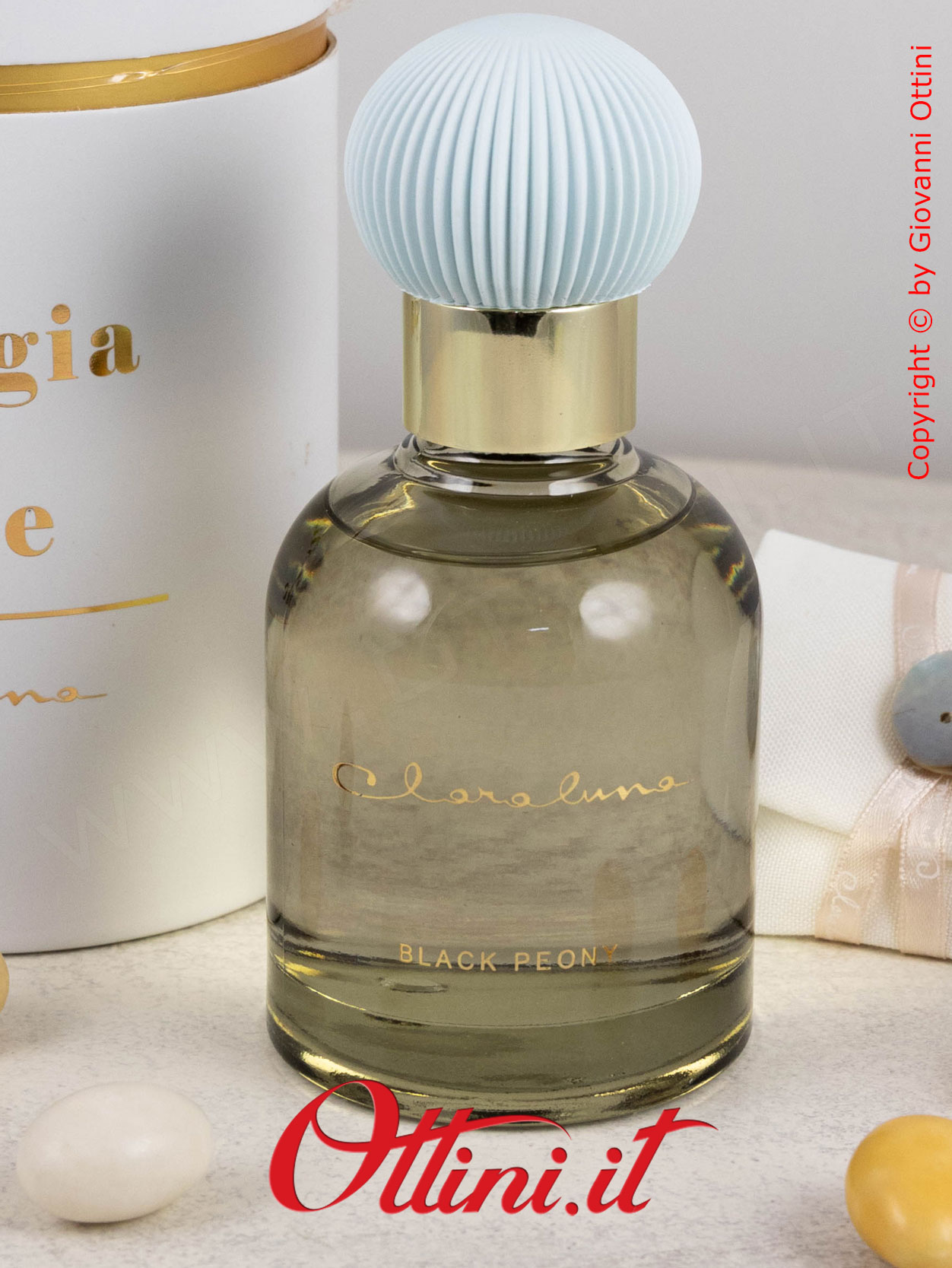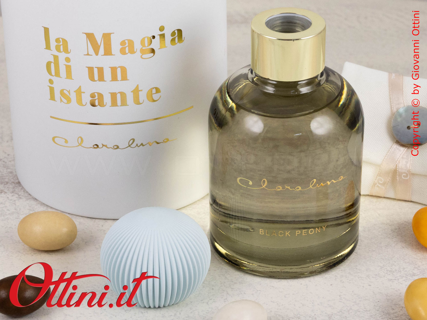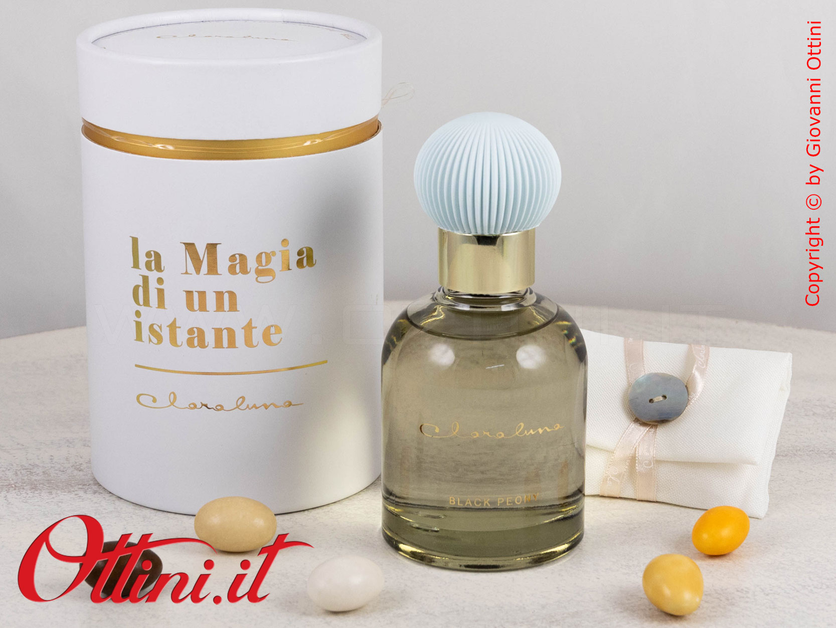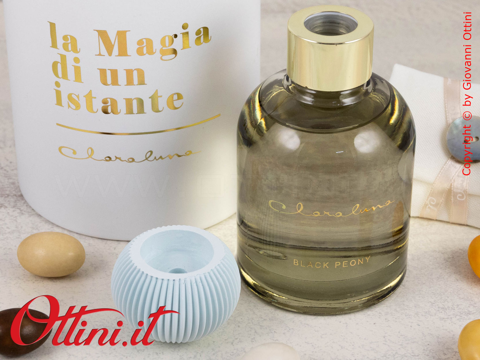 La semplicità valorizza l’eleganza di qualsiasi cosa naturalmente bella: questo diffusore GRANDE di profumo di Claraluna è composto da un flacone di essenza colore grigio con un originalissimo gesso a lavorazione plissè realizzato nella nuance di colore coordinato al profumo. La fragranza si chiama “Black Peony” ed è contenuta in questa boccetta di vetro spesso con tappo dorato. Il fiore andrà inserito nella boccetta e avrà la funzione di diffondere la fragranza. Il packaging è coordinato al profumo ed è composto dal bellissimo astuccio rotondo personalizzato con la scritta in oro a caldo “La Magia di un Istante”.