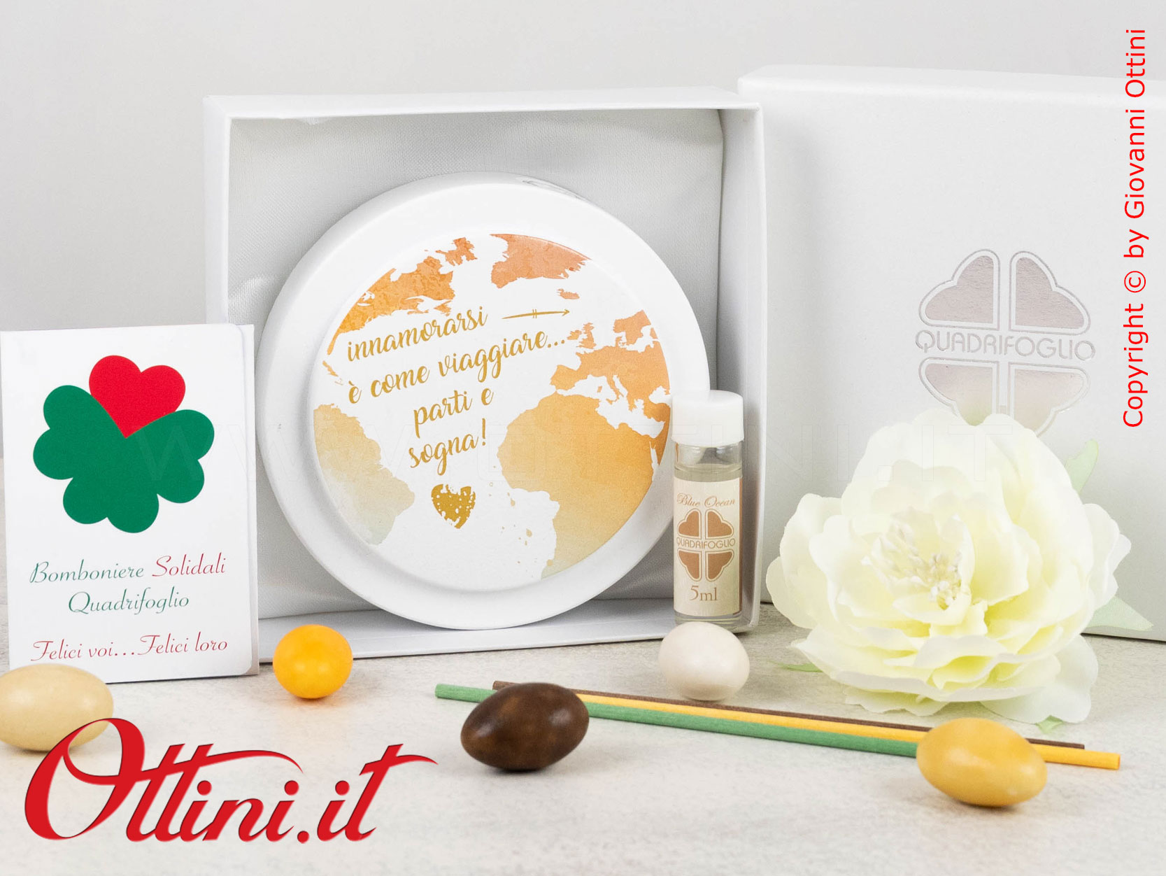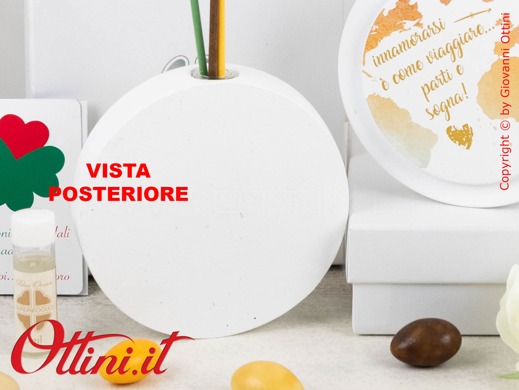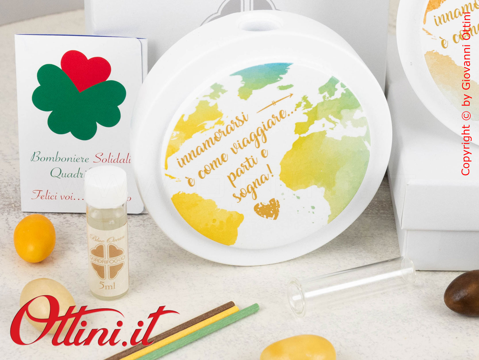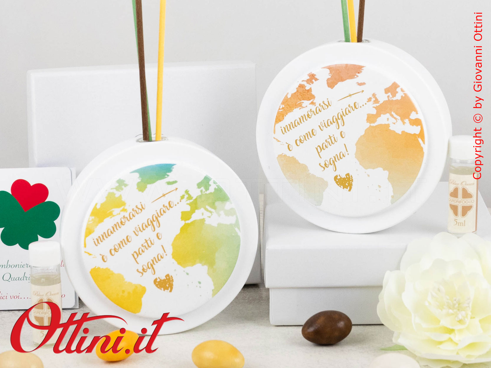 “innamorarsi è come viaggiare… Parti e sogna!” è il motto stampato su questo originale diffusore in terracotta con serigrafia del mondo, design firmato Quadrifoglio. Viene prodotto in due colorazioni e viene venduto assortita: se ne acquistate solo uno, riceverete un colore a caso, se ne acquistate 2 riceverete un colore per tipo, e così via in modo assortito per quantitativi maggiori. Con questo profumatore è incluso il kit essenza composto dai tre bastoncini diffusori colorati e il flaconcino di profumo.