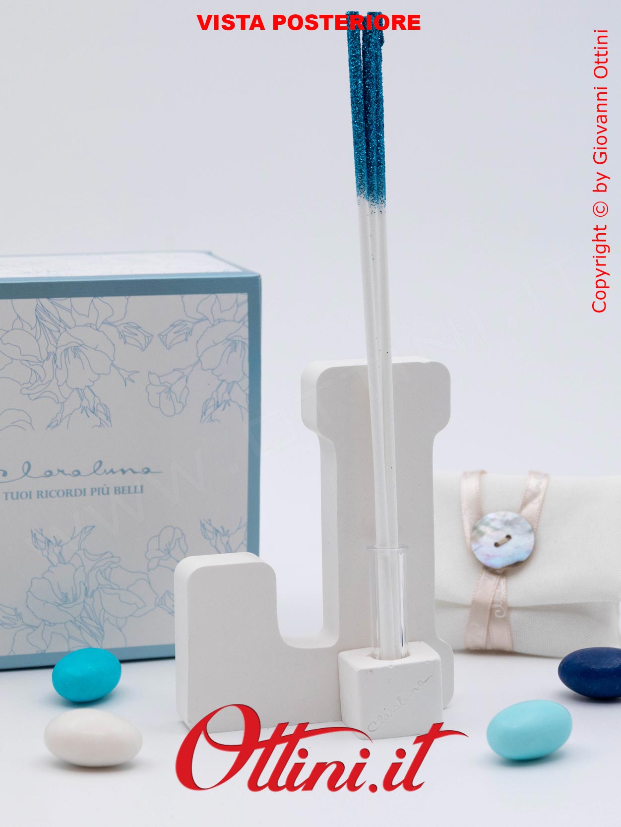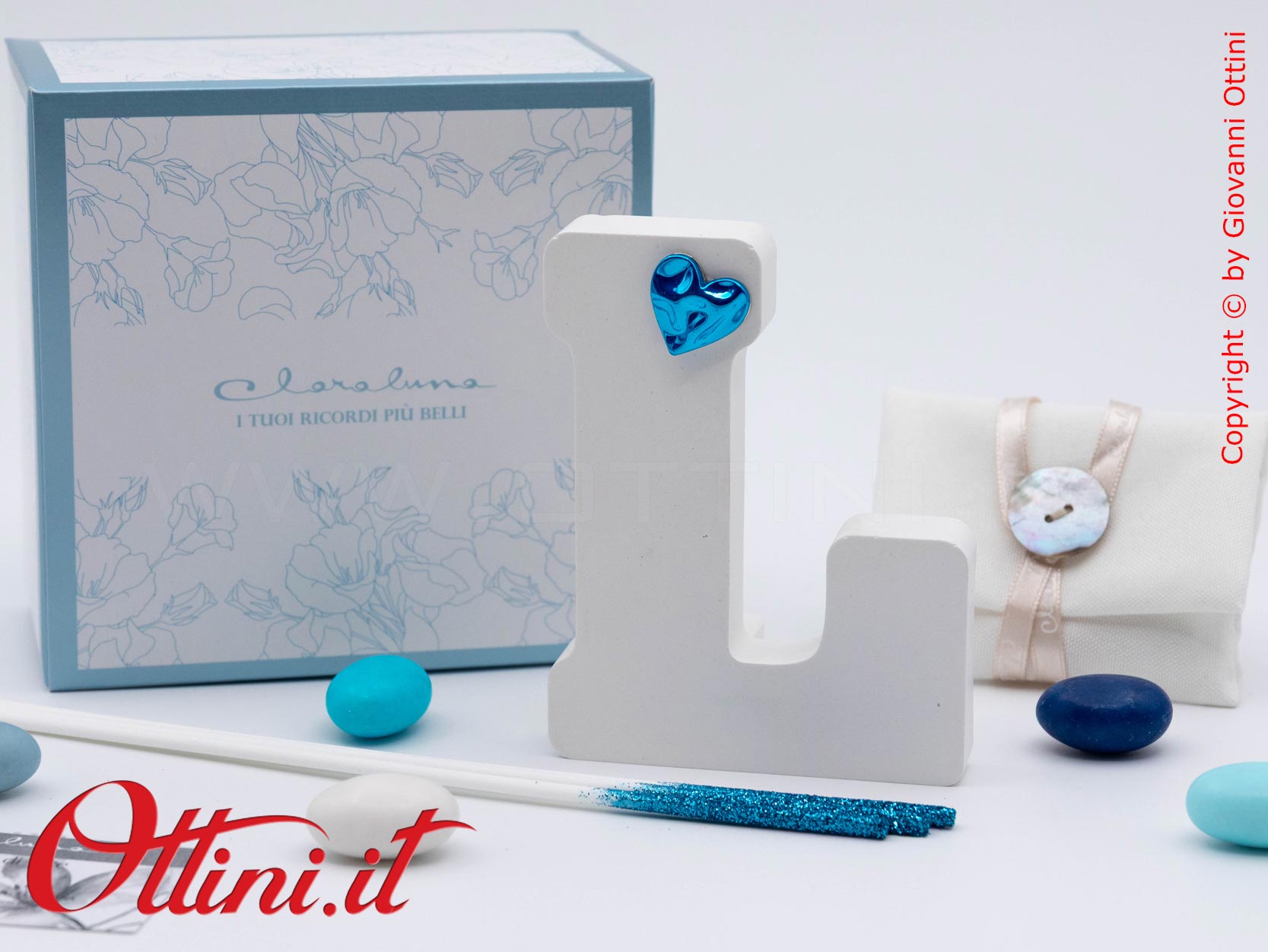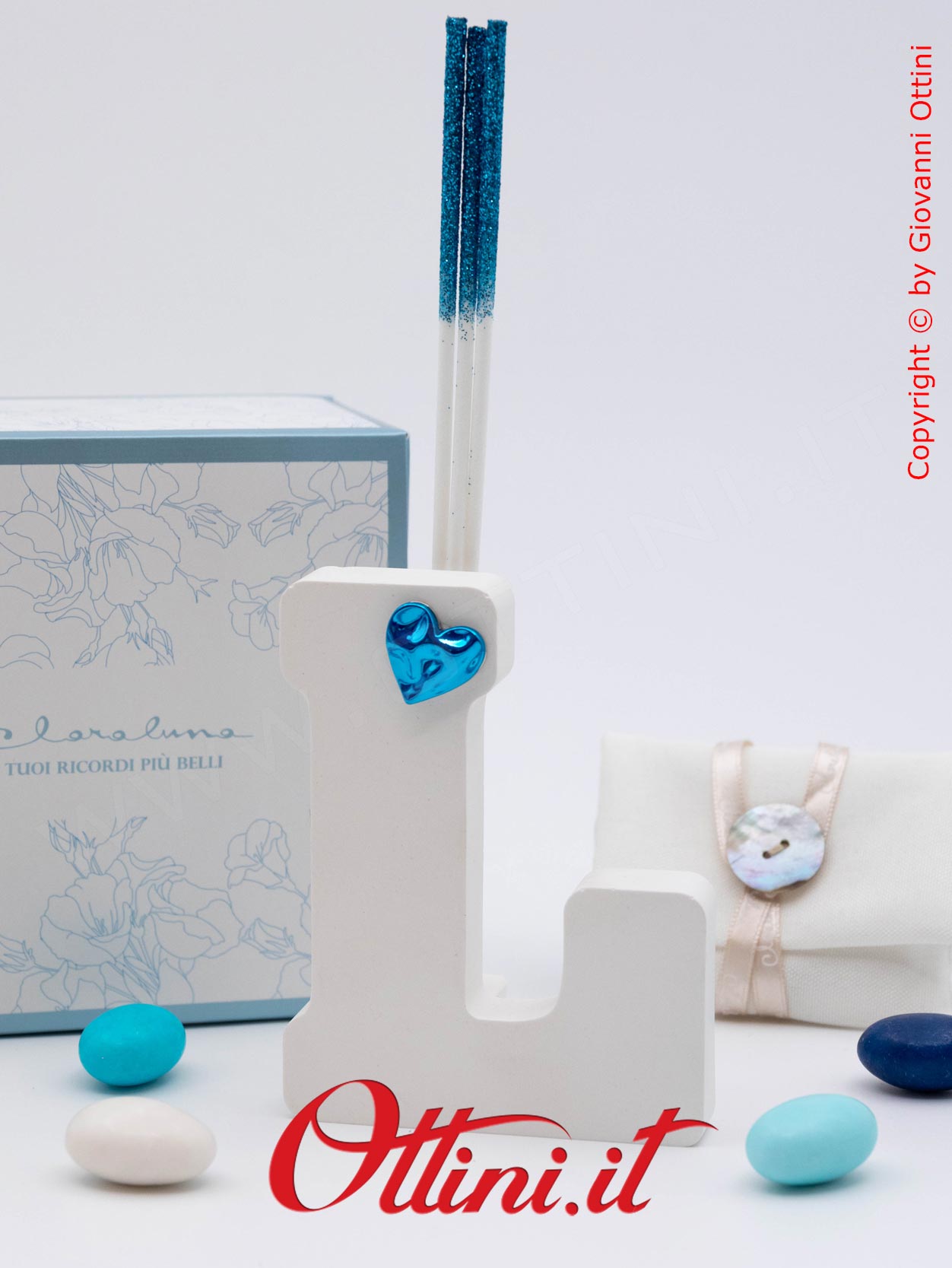 La personalizzazione di un prodotto è la possibilità di associarlo ad un evento o alla persona festeggiata, un valore aggiunto che trasforma una cosa anonima in qualcosa di speciale. Le lettere del diffusore alfabeto con cuore azzurro sono dei profumatori per ambienti realizzati in gesso. La versione maschile ha il cuore azzurro e quella femminile ( cod. 26296) il cuore rosa. Sono completi del kit essenza composto dai bastoncini diffusori glitterati coordinati (rosa per la versione femminile e azzurri per la maschile) e dal flaconcino di profumo originale Claraluna. E’ un oggetto giovane e moderno, indicato per tutti gli eventi della vita.