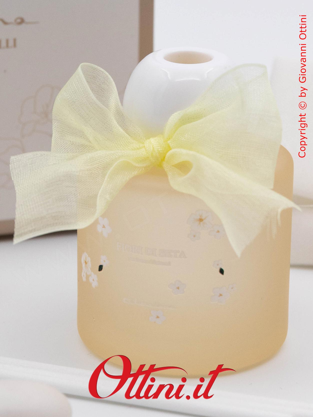 Semplice e raffinato, minimale quanto basta per un design pulito e sobrio: è il Diffusore profumatore per ambienti con vetro satinato Giallo decorato a fiori bianchi. Questa referenza si compone di un flacone da 50ml di profumo con note floreali e dal kit essenza composto dai bastoncini diffusori bianchi. E’ disponibile anche in altre colorazioni: Rosa, Azzurro, Verde e Giallo e nel formato più grande da 120 ml nei colori Rosa, Azzurro, Verde e Giallo