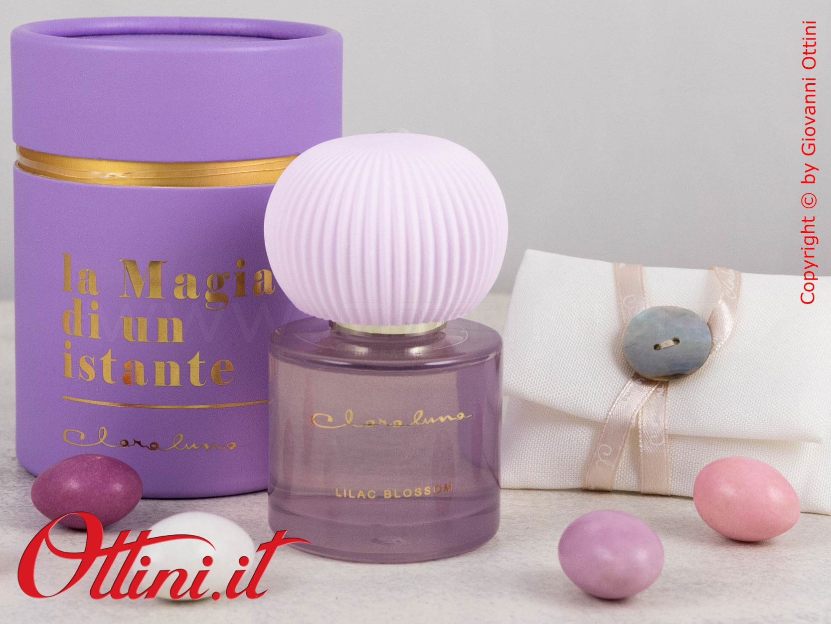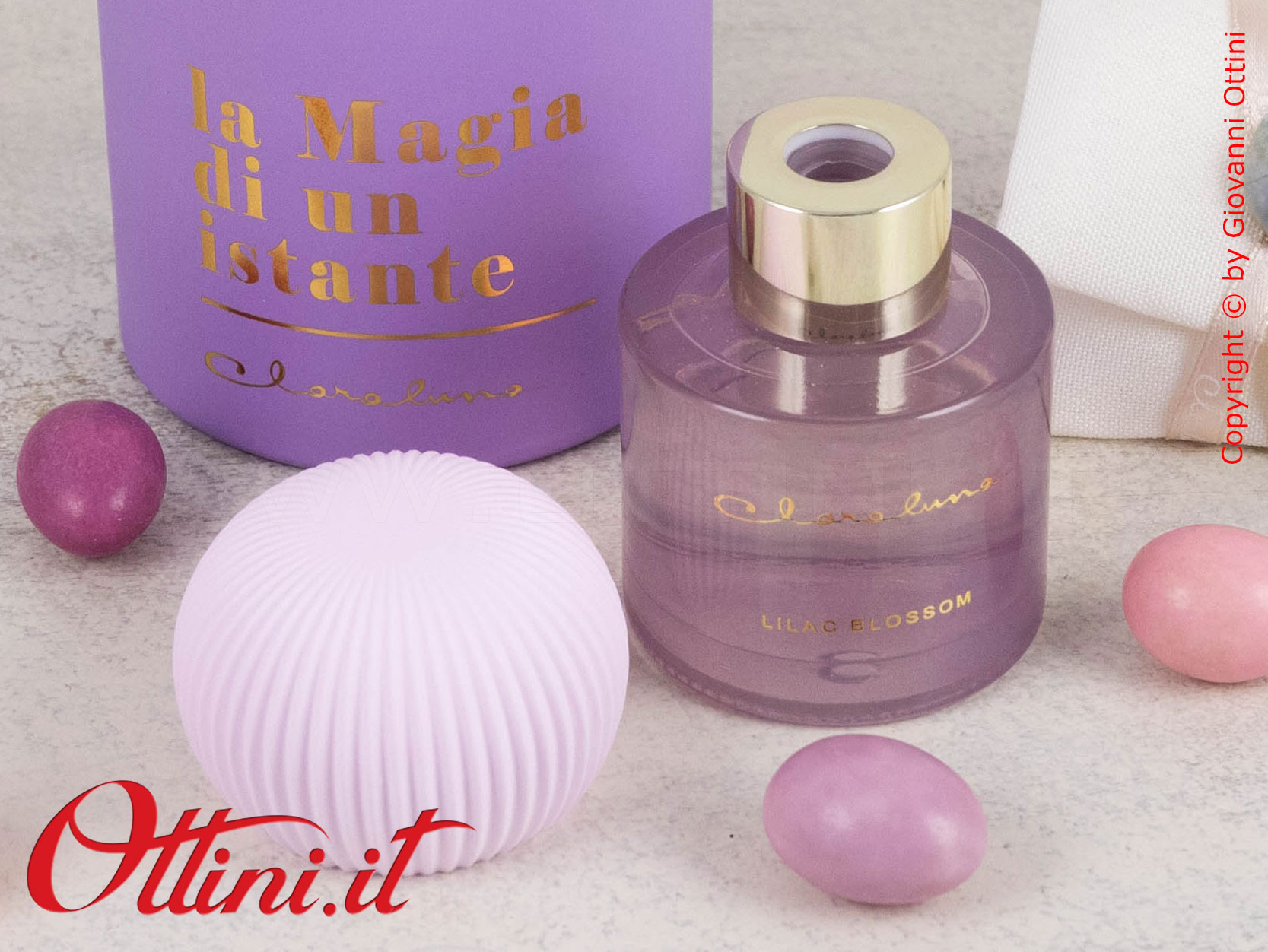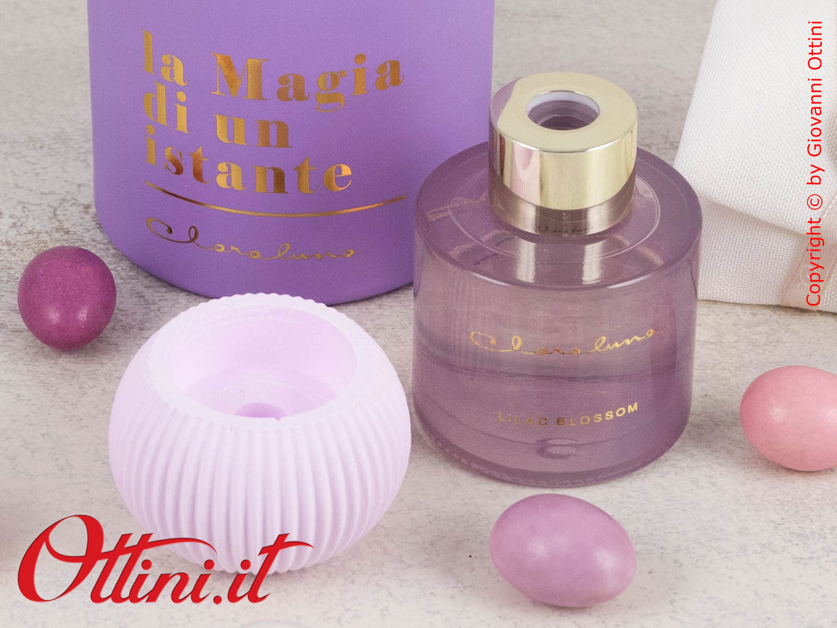 La semplicità valorizza l’eleganza di qualsiasi cosa naturalmente bella: questo diffusore di profumo di Claraluna è composto da un flacone di essenza colore viola con un originalissimo gesso a lavorazione plissè realizzato nella nuance di colore coordinato al profumo. La fragranza si chiama “Liliac Bossom” ed è contenuta in questa boccetta di vetro spesso con tappo dorato. Il gessetto è provvisto di un bastoncino di “pescaggio” avrà la funzione di diffondere la fragranza attraverso il gesso. Il packaging è coordinato al profumo ed è composto dal bellissimo astuccio rotondo personalizzato con la scritta in oro a caldo “La Magia di un Istante”.