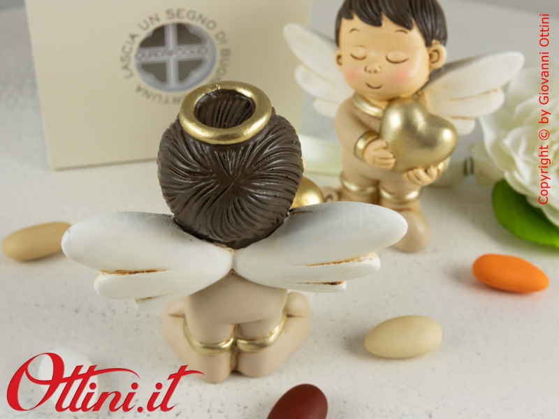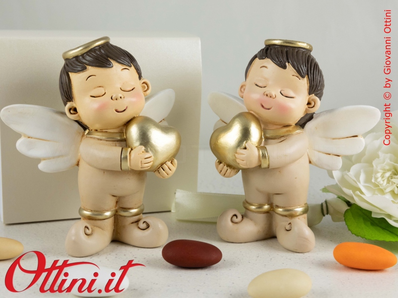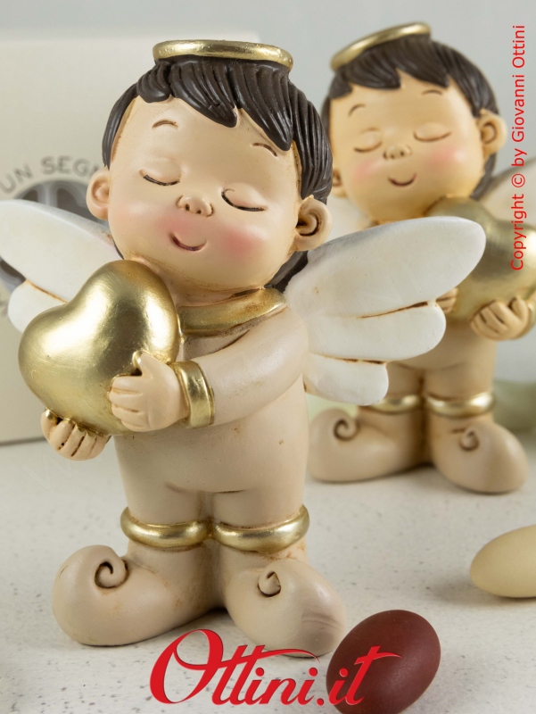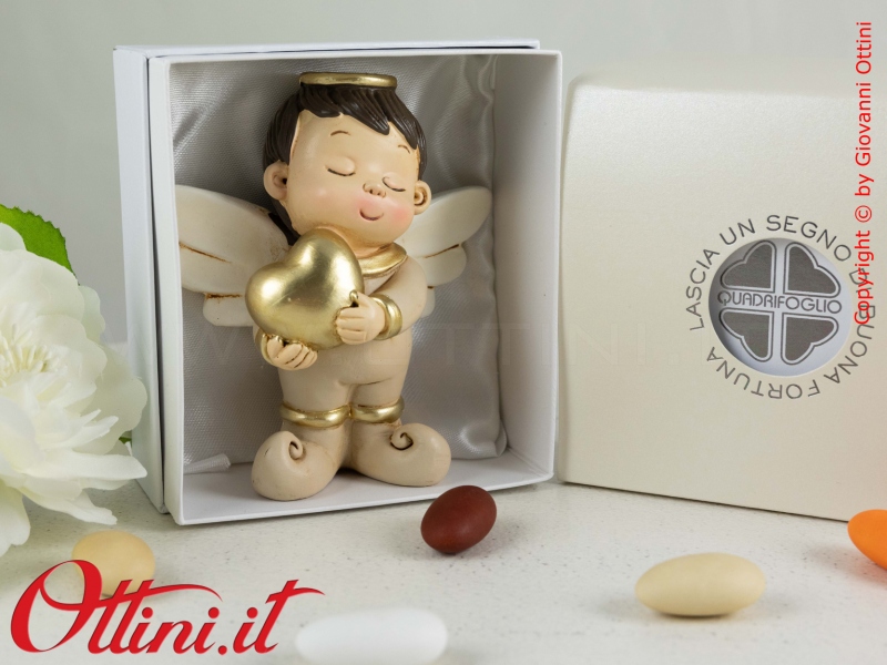 Tenero angelo della serie Dorata di Quadrifoglio. Realizzato in resina finemente rifinita è prodotto in due modelli che vengono venduti in modo assortito (ogni due acquistati ne riceverete uno per tipo).