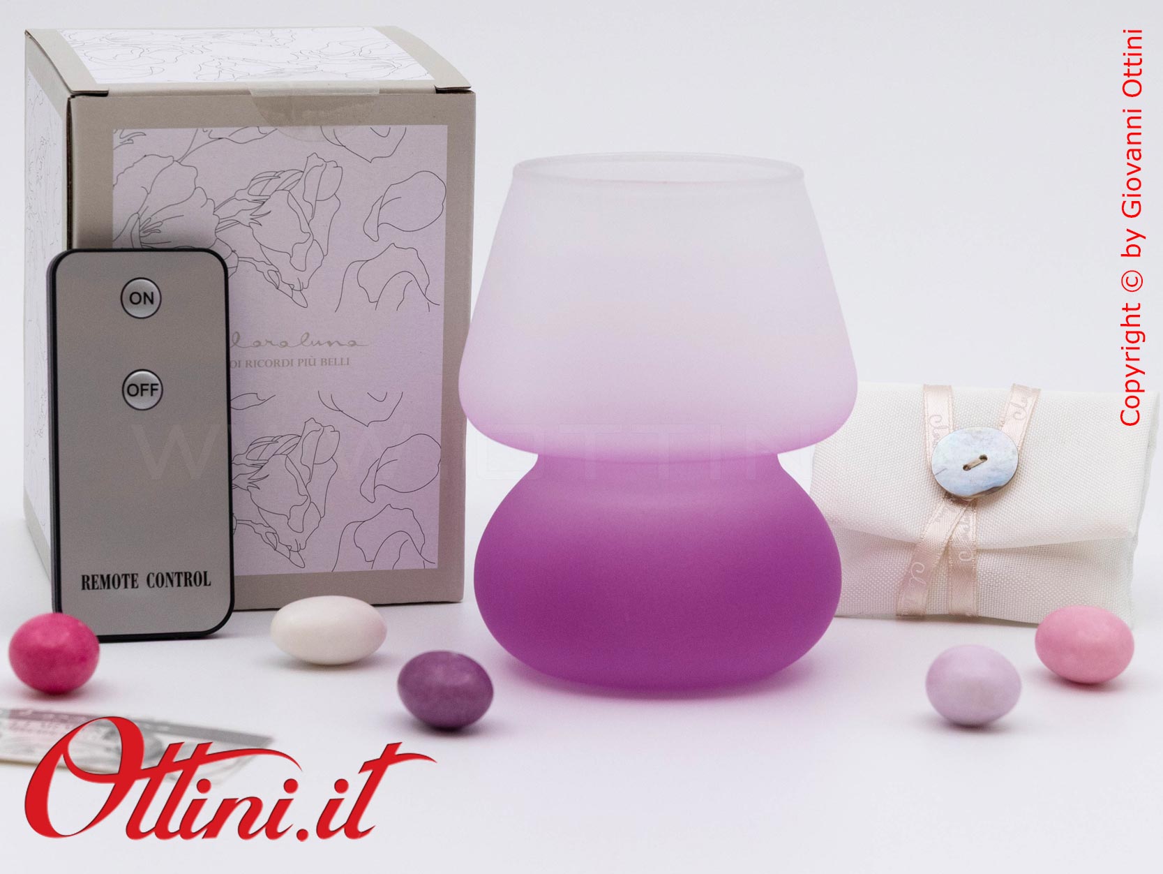 La Lampada Led Lilla con telecomando di Claraluna è un oggetto d’arredo DECORATIVO. E’ nostro dovere anticiparvi che non sarà la lampada che illuminerà il vostro ambiente come è ipotizzabile con le classiche lampade a corrente elettrica, ma sarà un elemento puramente estetico con una potenza illuminante tipica di una piccola torcia. Funziona con una batteria già inclusa e si compone di tre elementi: Il corpo lampada in vetro, il nucleo con i tre led e la batteria, il telecomando. E’ disponibile nei colori Bianco, Giallo, Rosa, Azzurro Tiffany