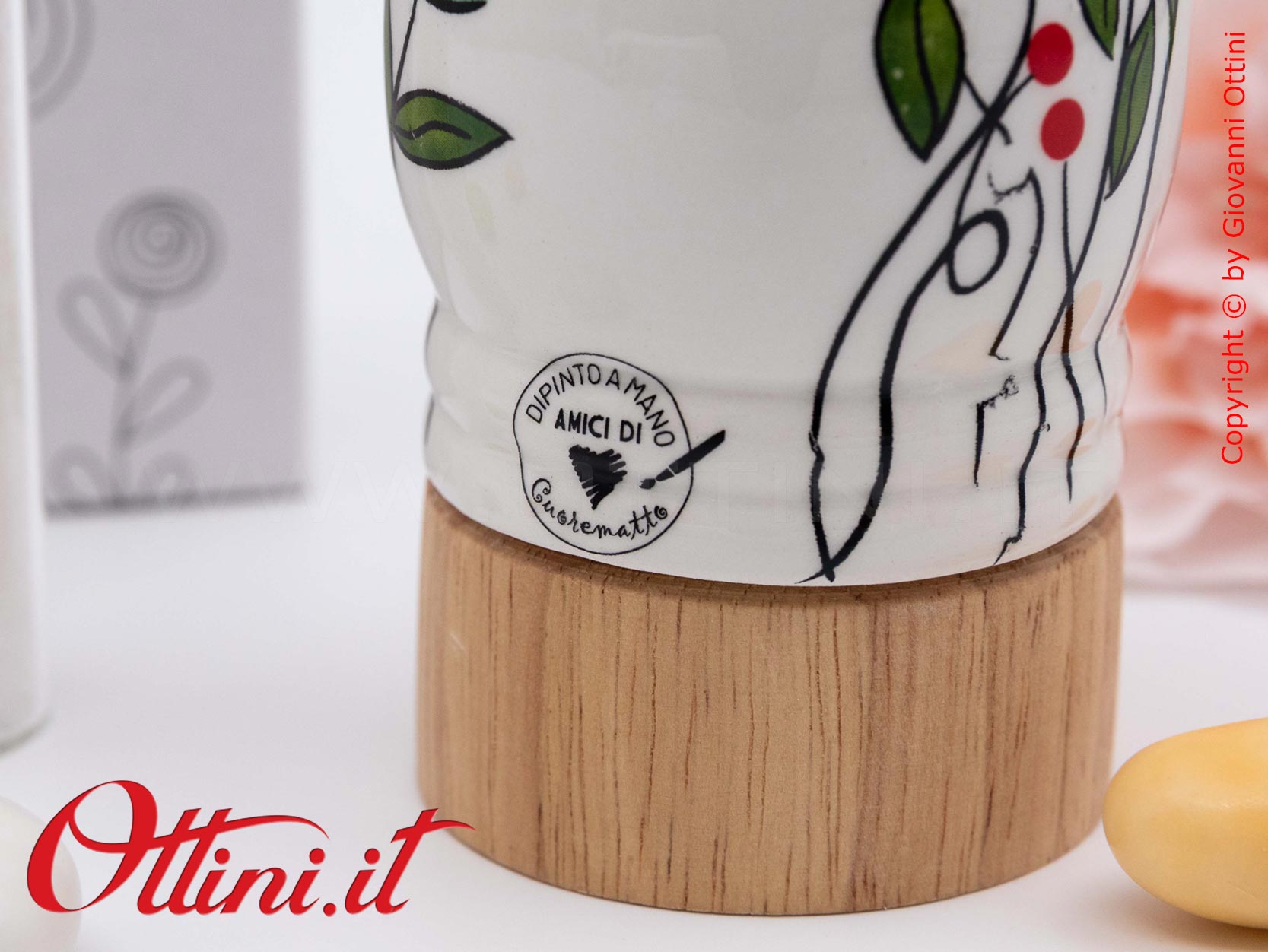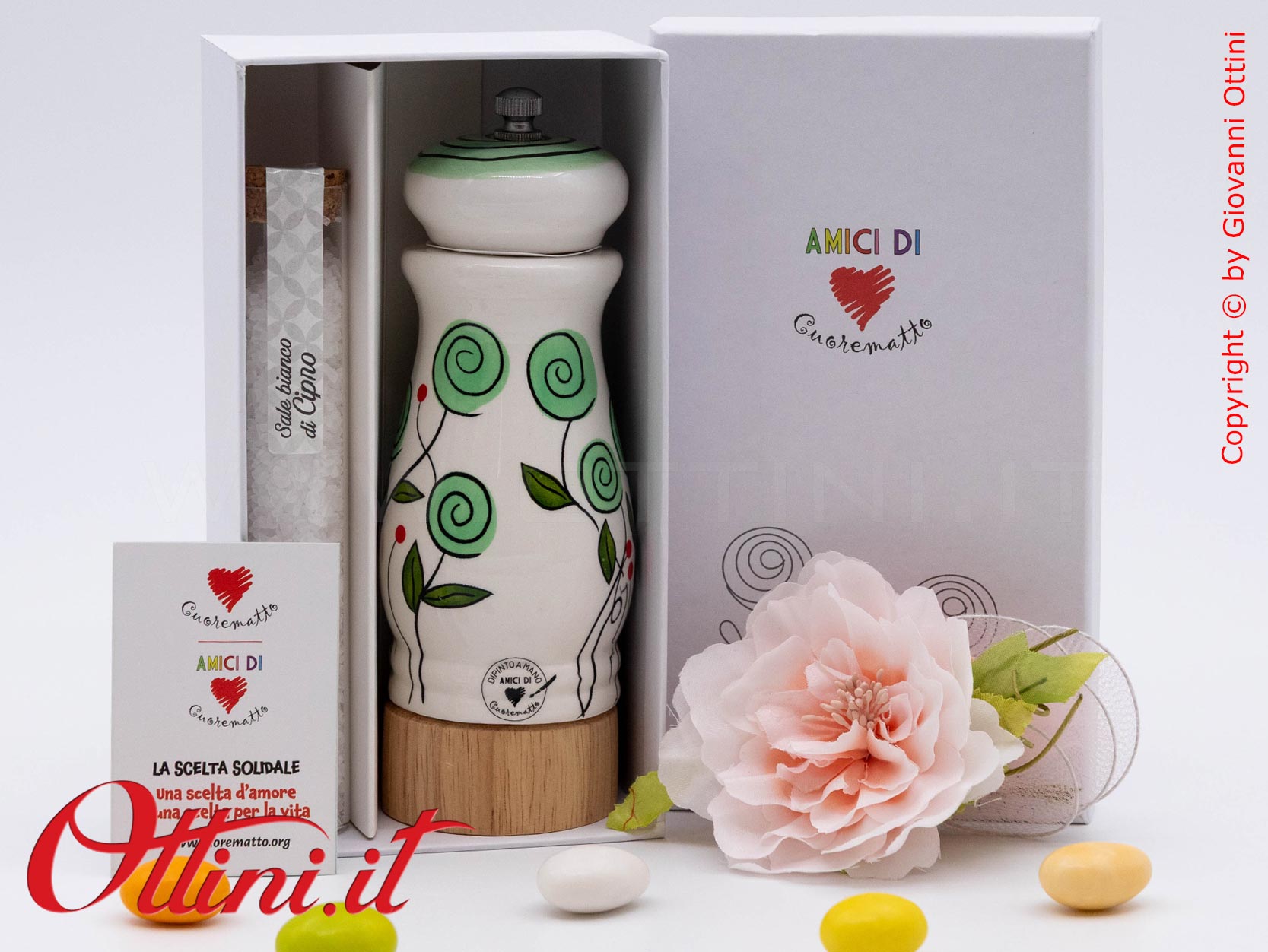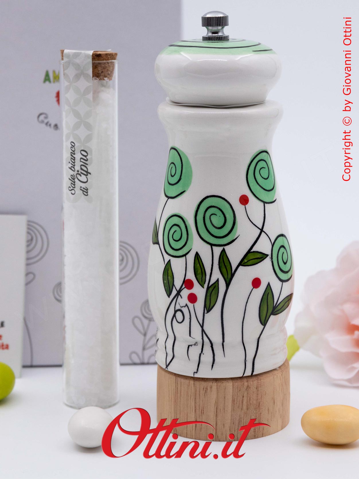 Colori floreali da portare in tavola con gli amici, perchè dove c’è allegria, c’è calore e COLORE! Il Macinasale Bocciolo Verde con sale Gourmet di Amici di Cuorematto è realizzato in ceramica bianca dipinta a mano e smaltata con finitura lucida e base in legno massello.