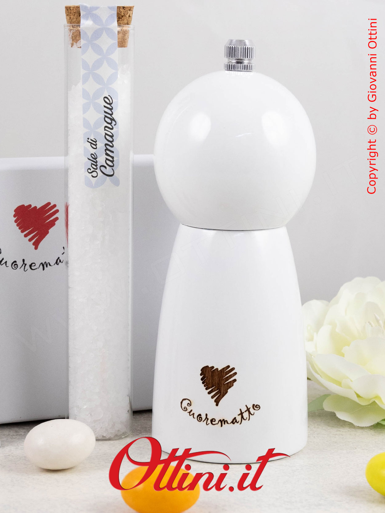 Le bomboniere utili sono diventate un cult di design molto richiesto dove è d’obbligo l’originalità. Cuorematto, azienda leader del settore che ha sempre dato gli input migliori, propone questo macinasale in legno massello smaltato bianco che valorizzerà la vostra cucina o la tavola dei vostri ospiti. La serie dei Macinasale è composta da 3 modelli: il più piccolo (questo) nel colore bianco, il medio nel colore grigio e il grande nel colore ottanio.