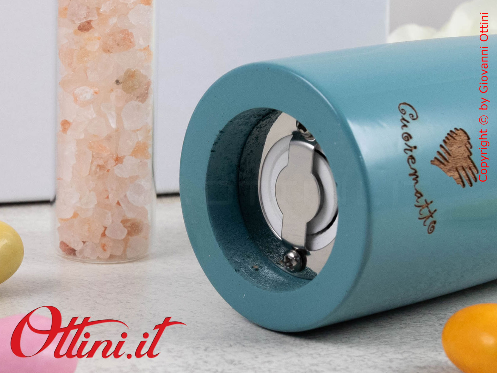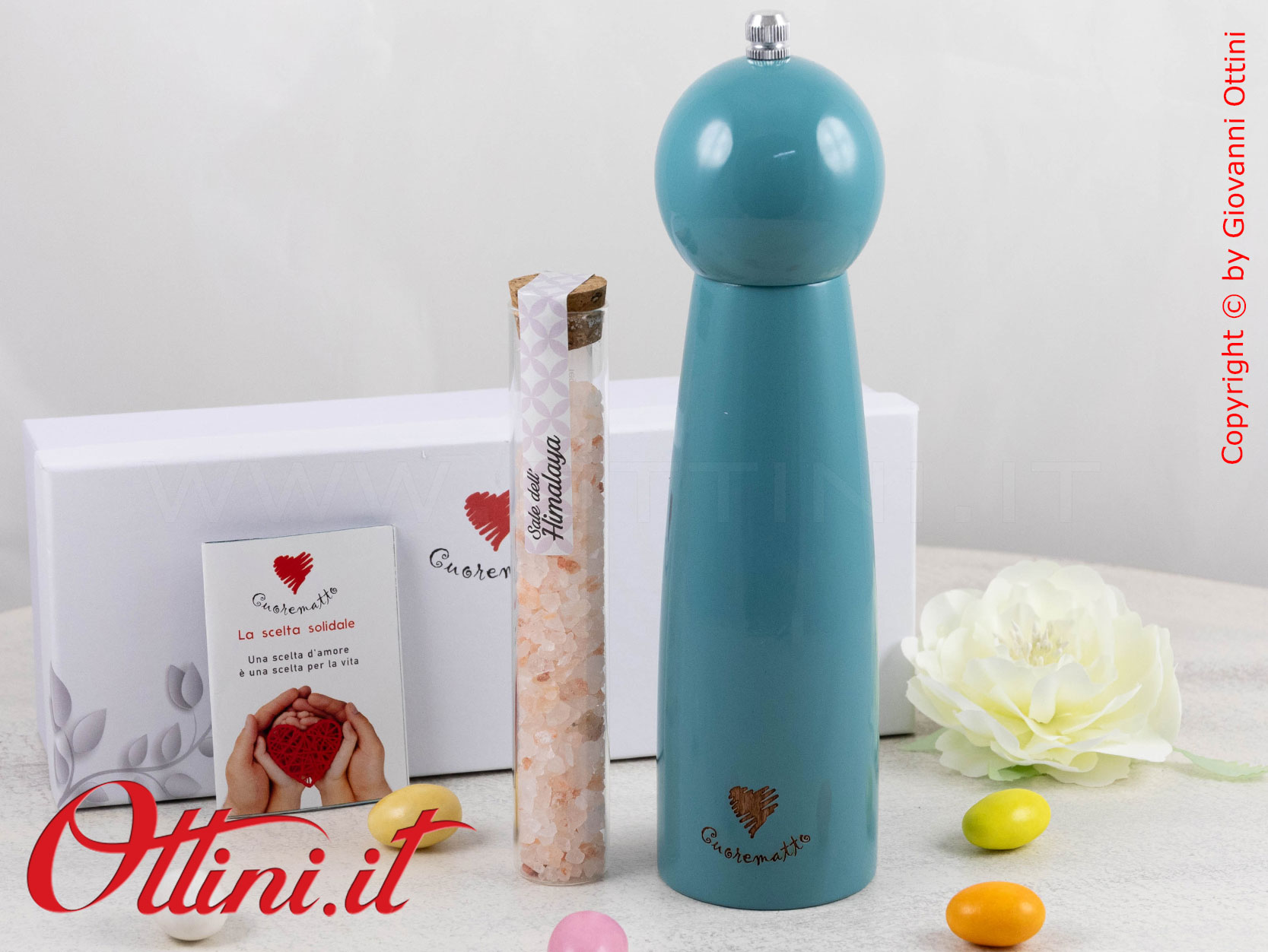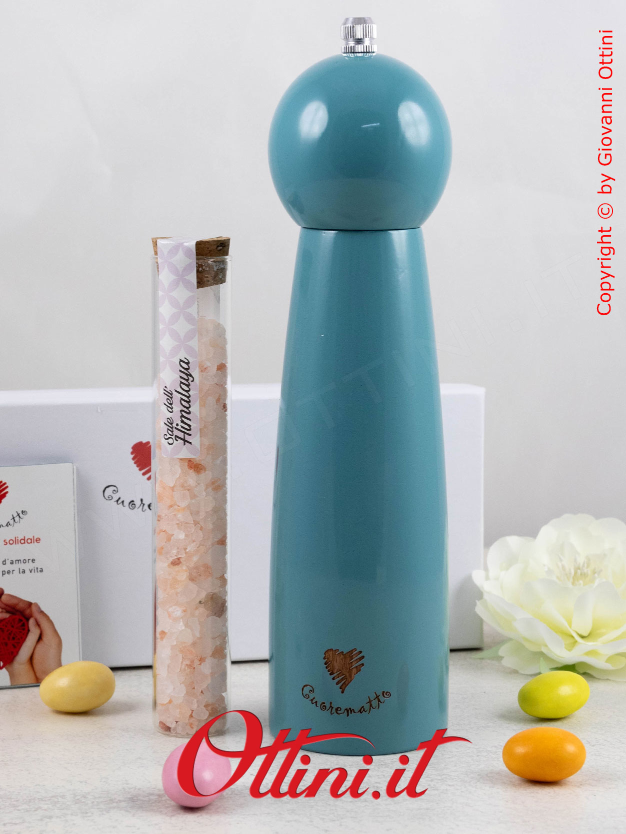 Le bomboniere utili sono diventate un cult di design molto richiesto dove è d’obbligo l’originalità. Cuorematto, azienda leader del settore che ha sempre dato gli input migliori, propone questo macinasale in legno massello smaltato color ottanio che valorizzerà la vostra cucina o la tavola dei vostri ospiti. La serie dei Macinasale è composta da 3 modelli: il più piccolo nel colore bianco, il medio nel colore grigio e il grande (questo) nel colore ottanio.