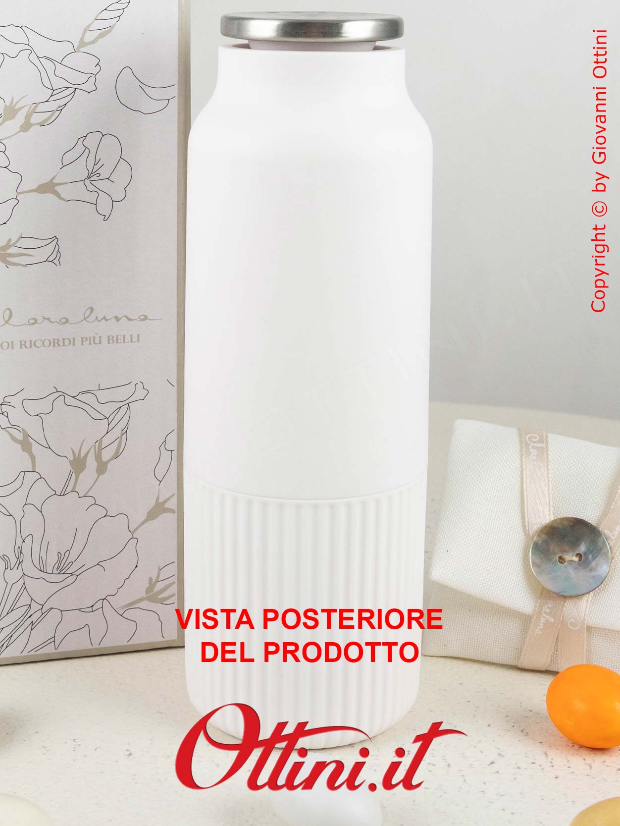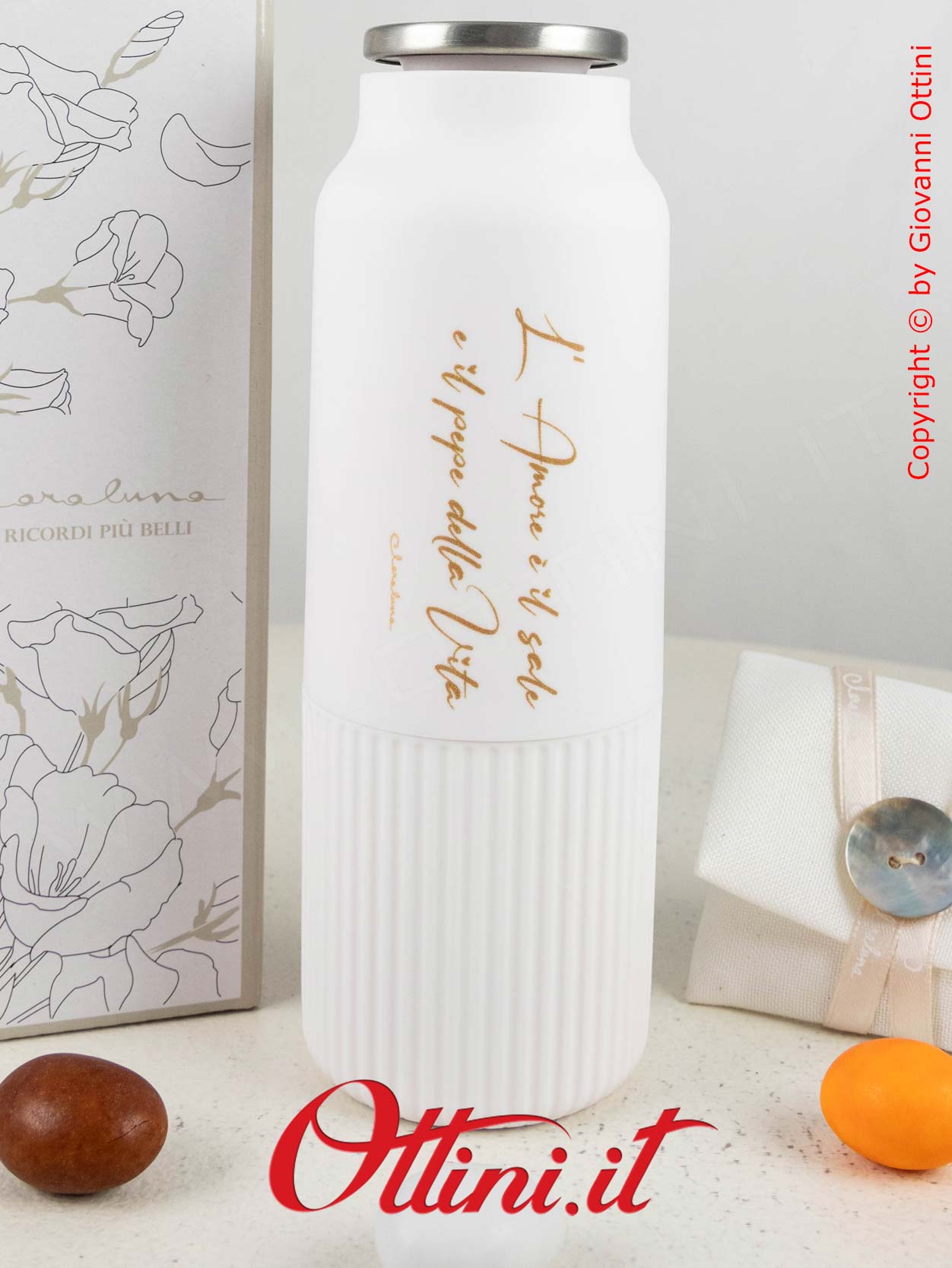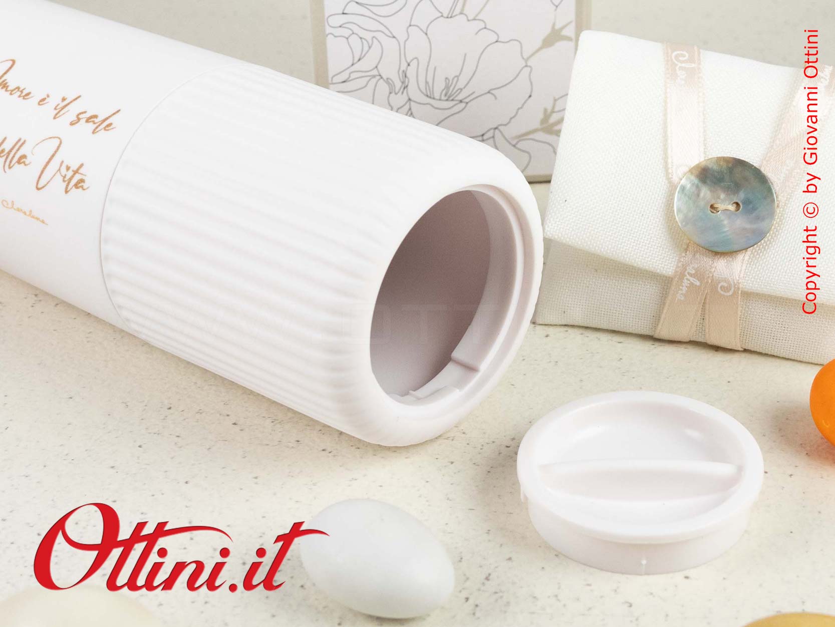 “L’amore è il sale e il pepe della vita” recita la frase impressa su questo elegante Macinasale o pepe di Claraluna. La forma originale ci ha messi un attimo in riflessione per capirne il funzionamento che, per quanto banale possa sembrare, vi garantiamo non è così immediato. La parte in basso è il serbatoio (fin qui la certezza è lampante) mentre la parte in metallo che vedete in alto regola la finezza della macinatura. Il movimento rotatorio tra la parte zigrinata e quella liscia macina il Sale o il pepe che esce invece dalla piccola fessura che vedete tra il regolatore di metallo e la parte bianca. Diciamo che se cercate un prodotto insolito lo avete trovato! Il vantaggio indiscutibile è che la posizione di appoggio con il meccanismo rivolto verso l’alto impedisce la fuoriuscita dei residui della macinatura sul piano di appoggio e lo stesso meccanismo di regolazione lo protegge dalla polvere.
