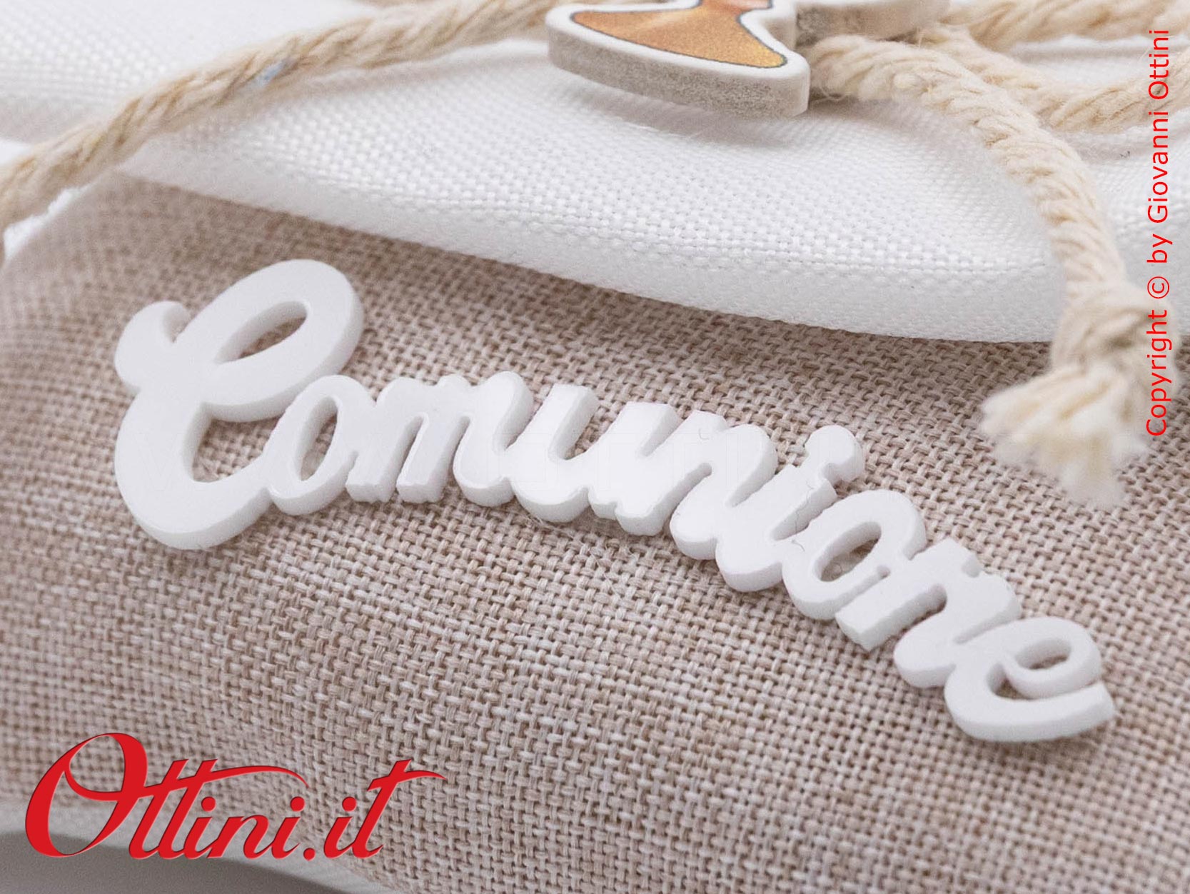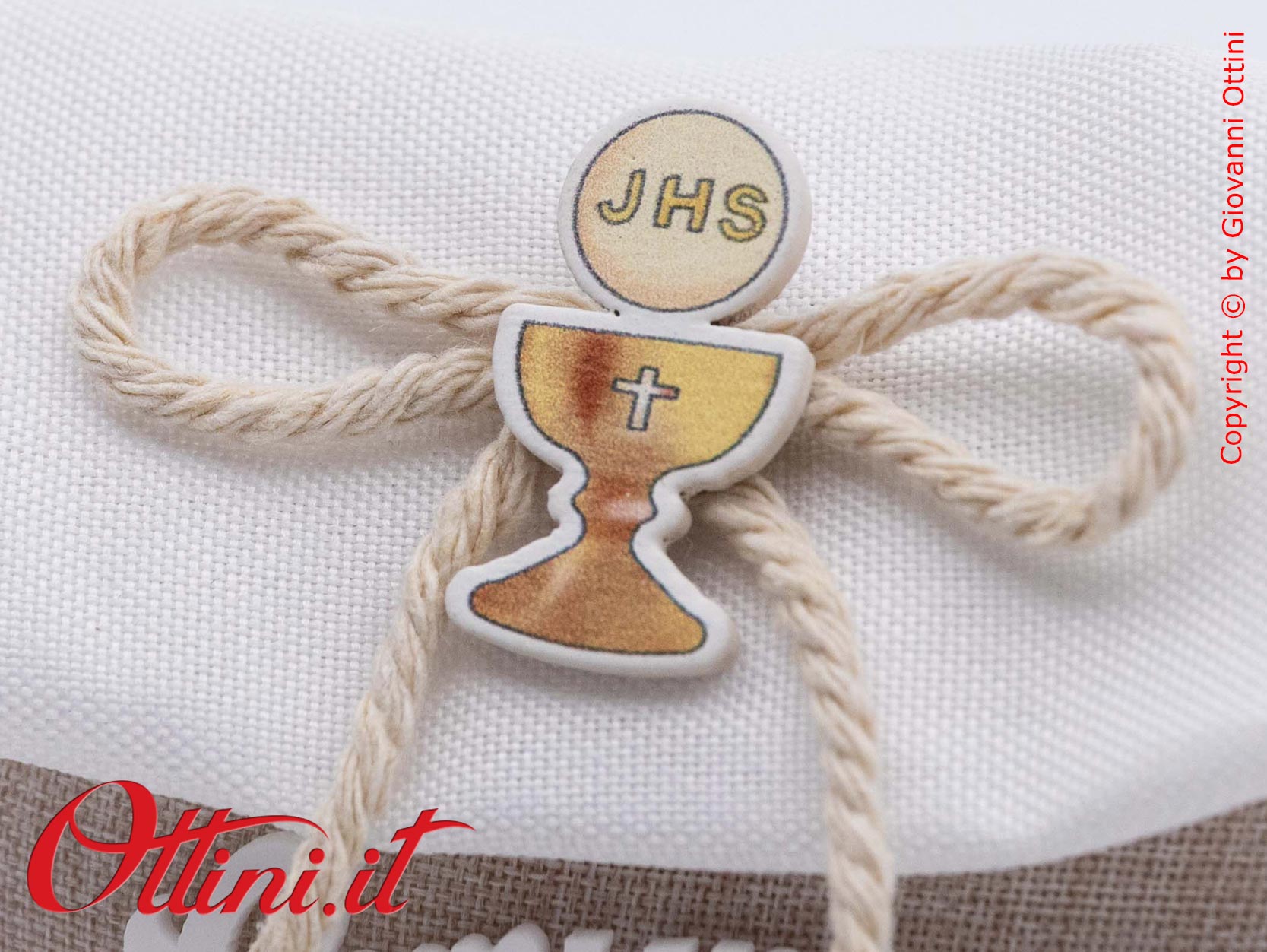 “Memento” è un oggetto ricordo e questa bustina in cotone per la Prima Comunione è un prodotto semplice, non impegnativo, di ottima qualità, da regalare agli invitati e agli amici. Viene fornito già assemblato di tutte le decorazioni: il fiocchetto in corda con il calice sono già attaccati sul lembo superiore, mentre la scritta “Comunione” in plexy bianco è applicata sul lato inferiore. Questa tipologia di articoli è molto apprezzata per l’ottimo rapporto qualità/prezzo e soddisfa le esigenze di chi vuole fare un pensiero o un piccolo dono di ringraziamento. I colori neutri lo rendono perfetto sia per le bambine che per i bambini. Una volta aperto può essere riutilizzato per contenere pot-pourri profumati per armadi o piccoli oggetti .