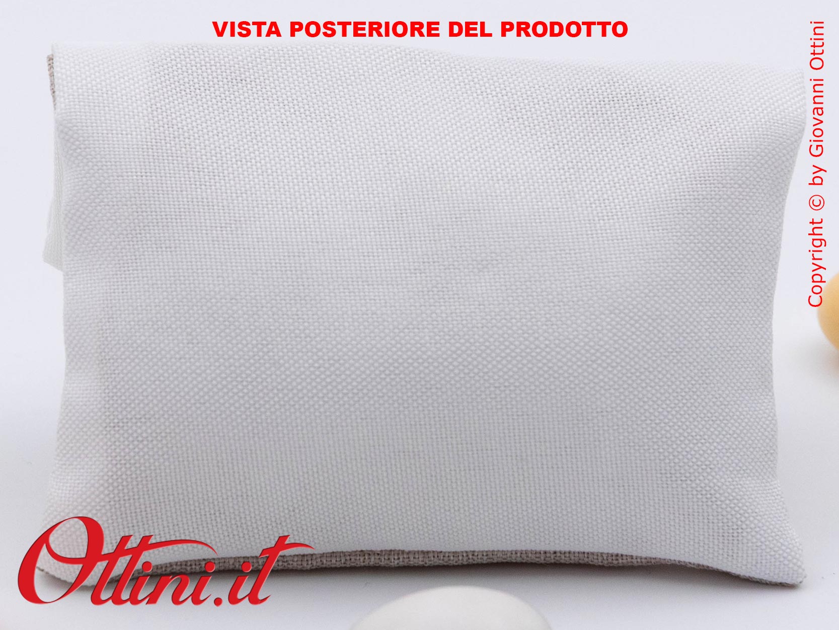 Realizzata in tessuto colore ecru/bianco di prima qualità, è praticamente già pronta. Nel corredo vi forniremo anche l’imbottitura e la bustina per alimenti in pvc in cui mettere i vostri confetti (non compresi) e il bigliettino bomboniera (non compreso). La chiusura è garantita dal piccolo velcro già fissato nella zona di sormonto dei due tessuti.