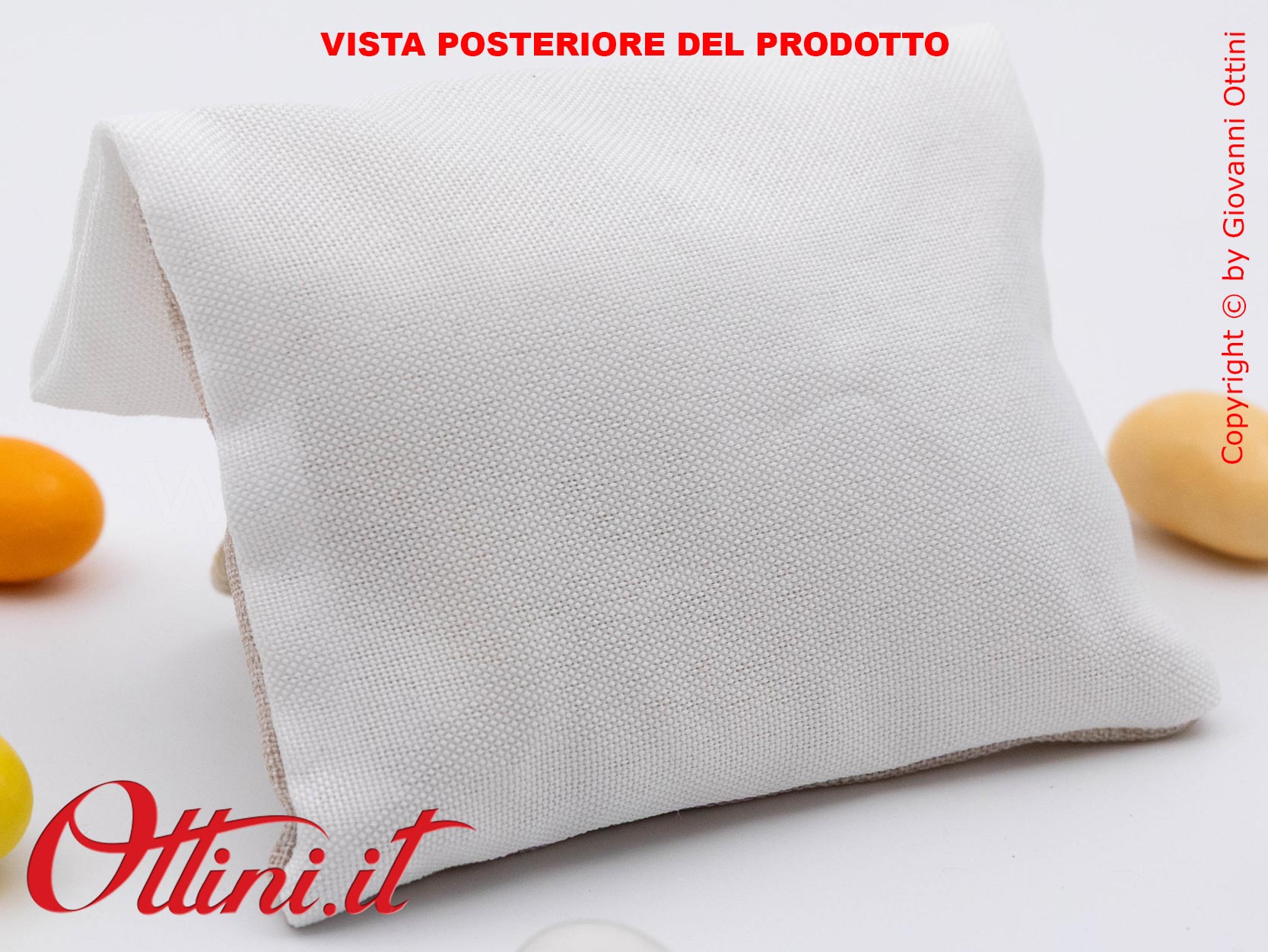 Realizzata in tessuto colore ecru/bianco di prima qualità, è praticamente già pronta. Nel corredo vi forniremo anche l’imbottitura e la bustina per alimenti in pvc in cui mettere i vostri confetti (non compresi) e il bigliettino bomboniera (non compreso). La chiusura è garantita dal piccolo velcro già fissato nella zona di sormonto dei due tessuti.