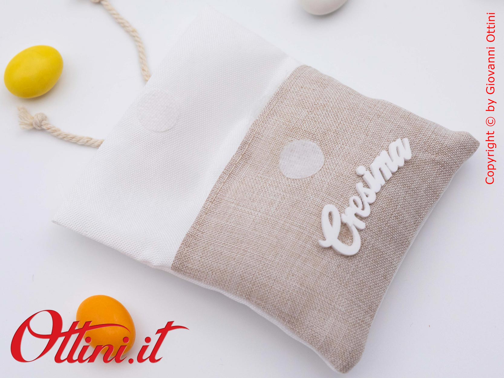 “Memento” è un oggetto ricordo e questa bustina in cotone per la Santa Cresima è un prodotto semplice, non impegnativo, di ottima qualità, da regalare agli invitati e agli amici. Viene fornito già assemblato di tutte le decorazioni: il fiocchetto in corda con il Bastone e la Mitria sono già attaccati sul lembo superiore, mentre la scritta “Cresima” in plexy bianco è applicata sul lato inferiore.  Questa tipologia di articoli è molto apprezzata per l’ottimo rapporto qualità/prezzo e soddisfa le esigenze di chi vuole fare un pensiero o un piccolo dono di ringraziamento. I colori neutri lo rendono perfetto sia per le bambine che per i bambini. Una volta aperto può essere riutilizzato per contenere pot-pourri profumati per armadi o piccoli oggetti .